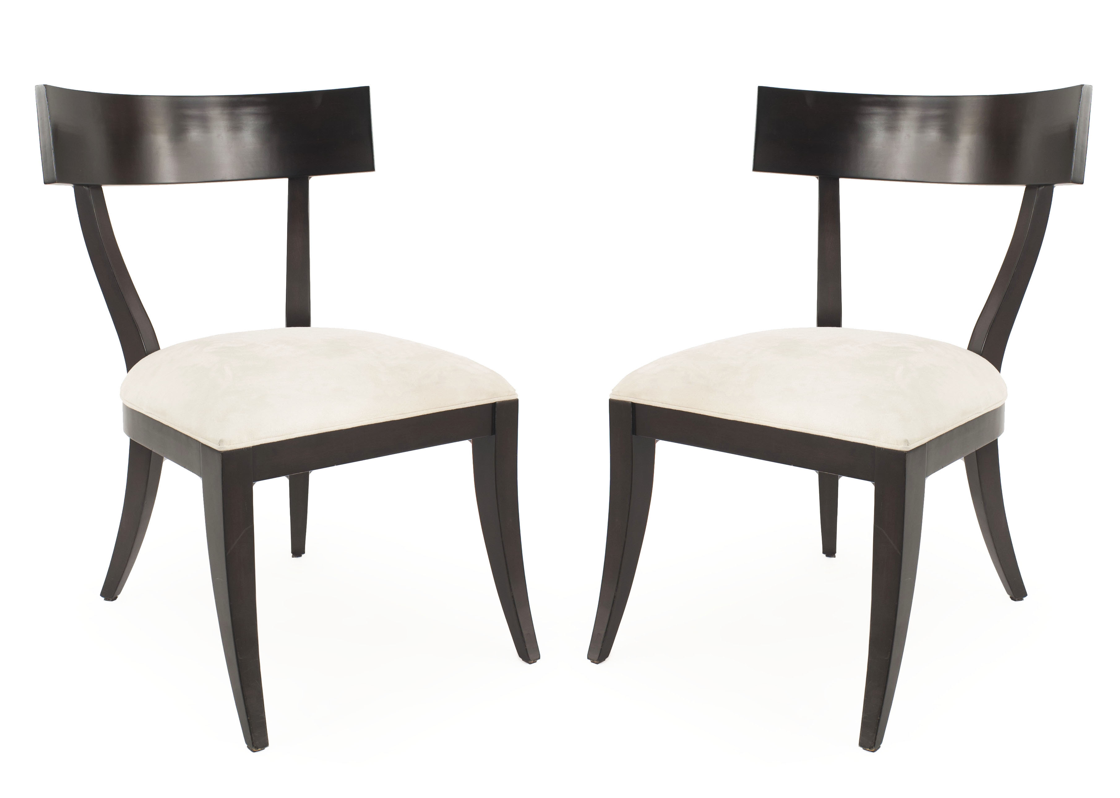 6 Contemporary Neo-Classic Klismos design wooden dining chairs with a high-gloss black painted finish and beige fabric upholstered seats (PRICED EACH) (Matching table: 061107).