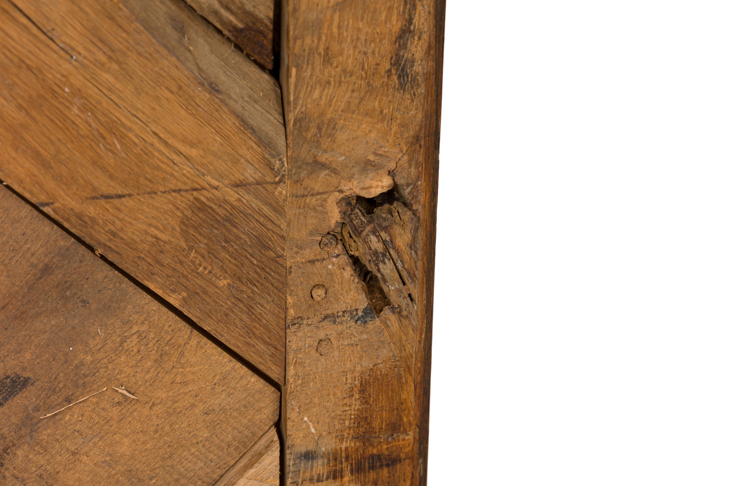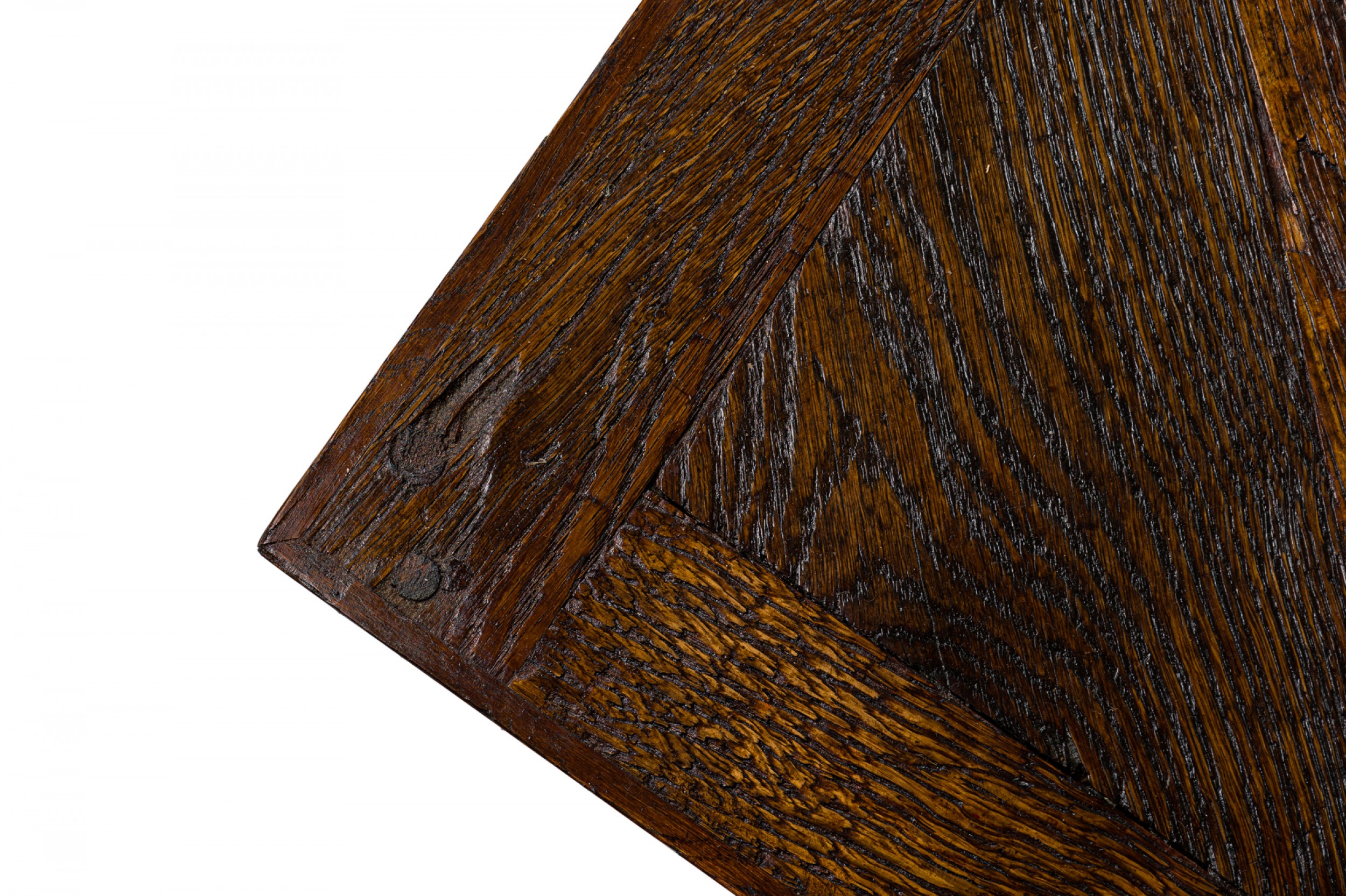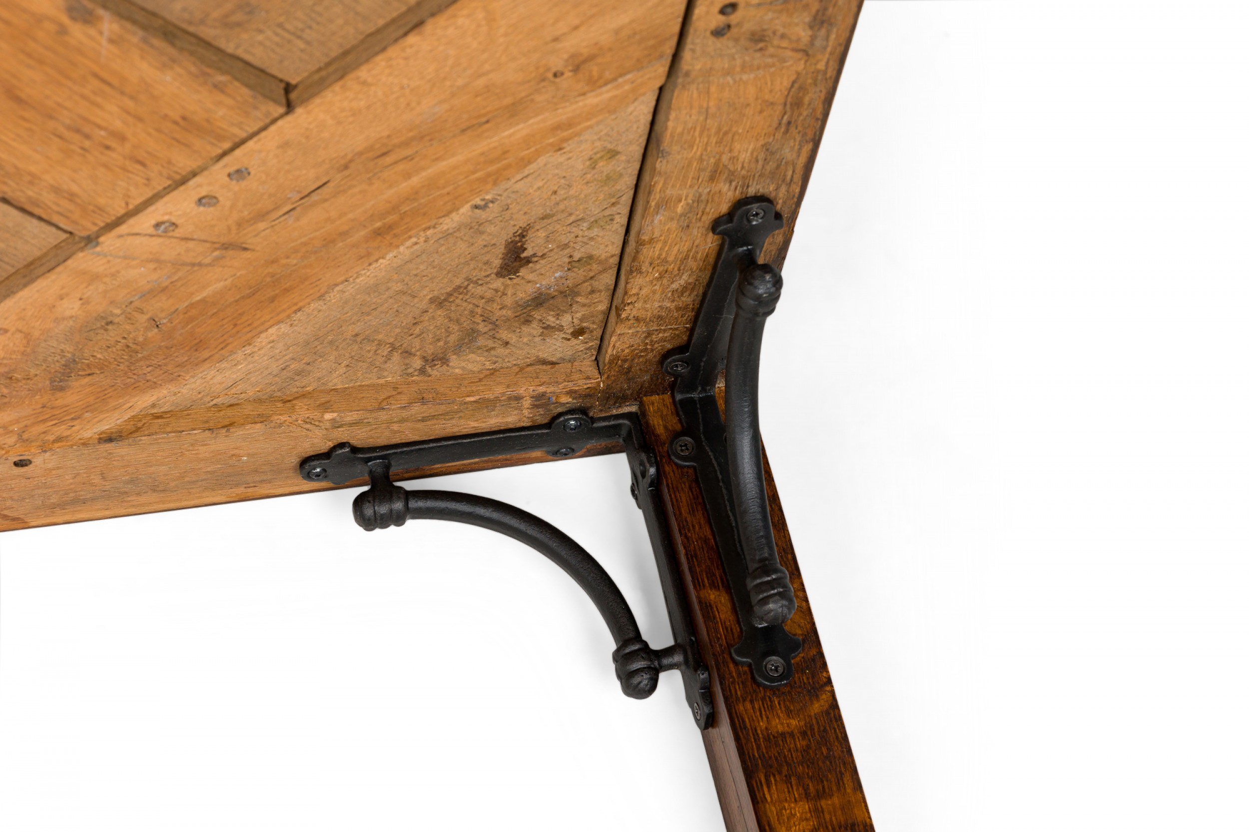 Style: Contemporary/Post-War Design Materials & Techniques: Inlay, iron, metal, wood Category: Tables Good; Wear consistent with age and use