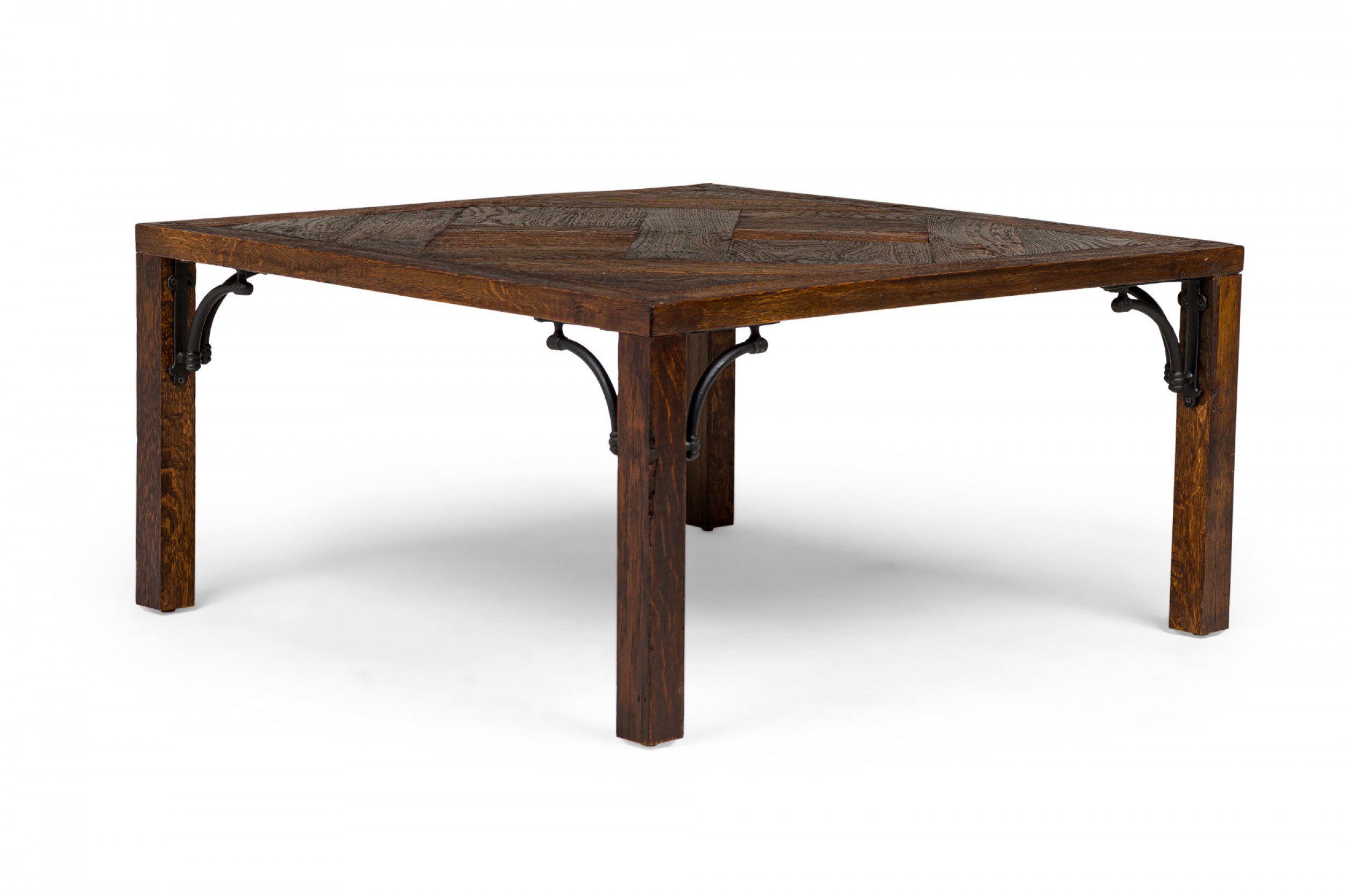 Contemporary designed square form wood coffee table with inlaid 18th Century parquetry top, standing on four straight legs anchored by black metal scroll corner supports. (Similar smaller table: NWL6796)
