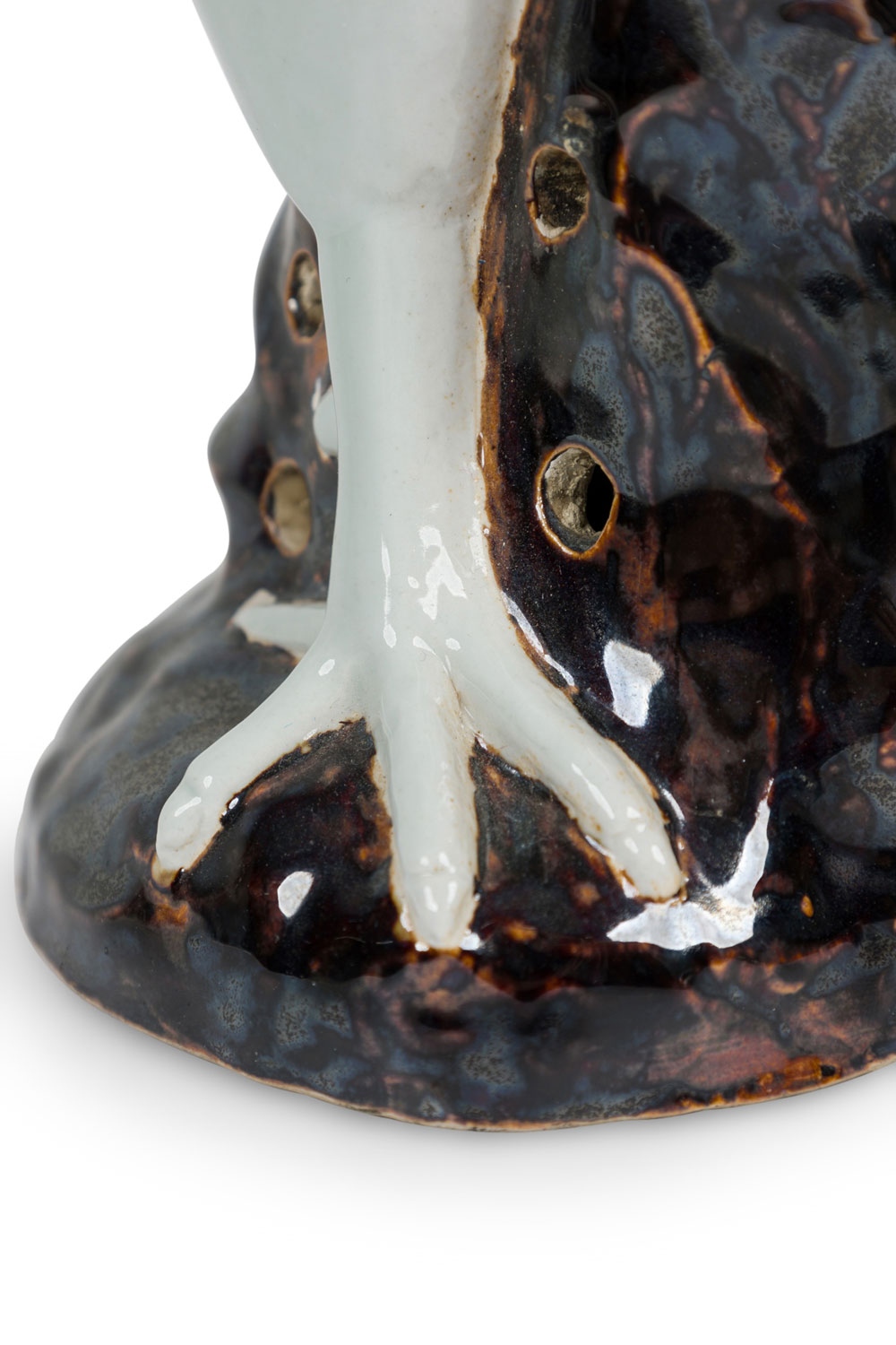 PAIR of English perched rooster figures in Blanc de Chine porcelain and polychrome glazed rockwork base (PRICED AS PAIR) (impressed on bottom: MC-09 DE GOURNAY. LONDON)