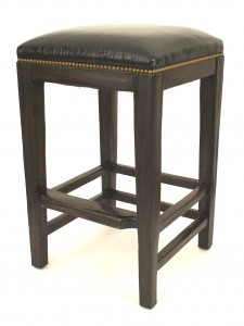 3 Contemporary Post-War Design dark wood stained square bar stools with a black leather seat and a double stretcher with a foot rest. (PRICED EACH)