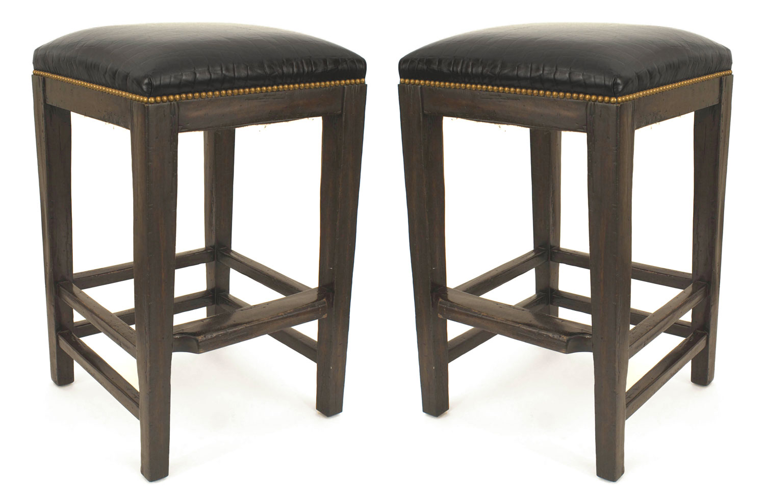 3 Contemporary Post-War Design dark wood stained square bar stools with a black leather seat and a double stretcher with a foot rest. (PRICED EACH).