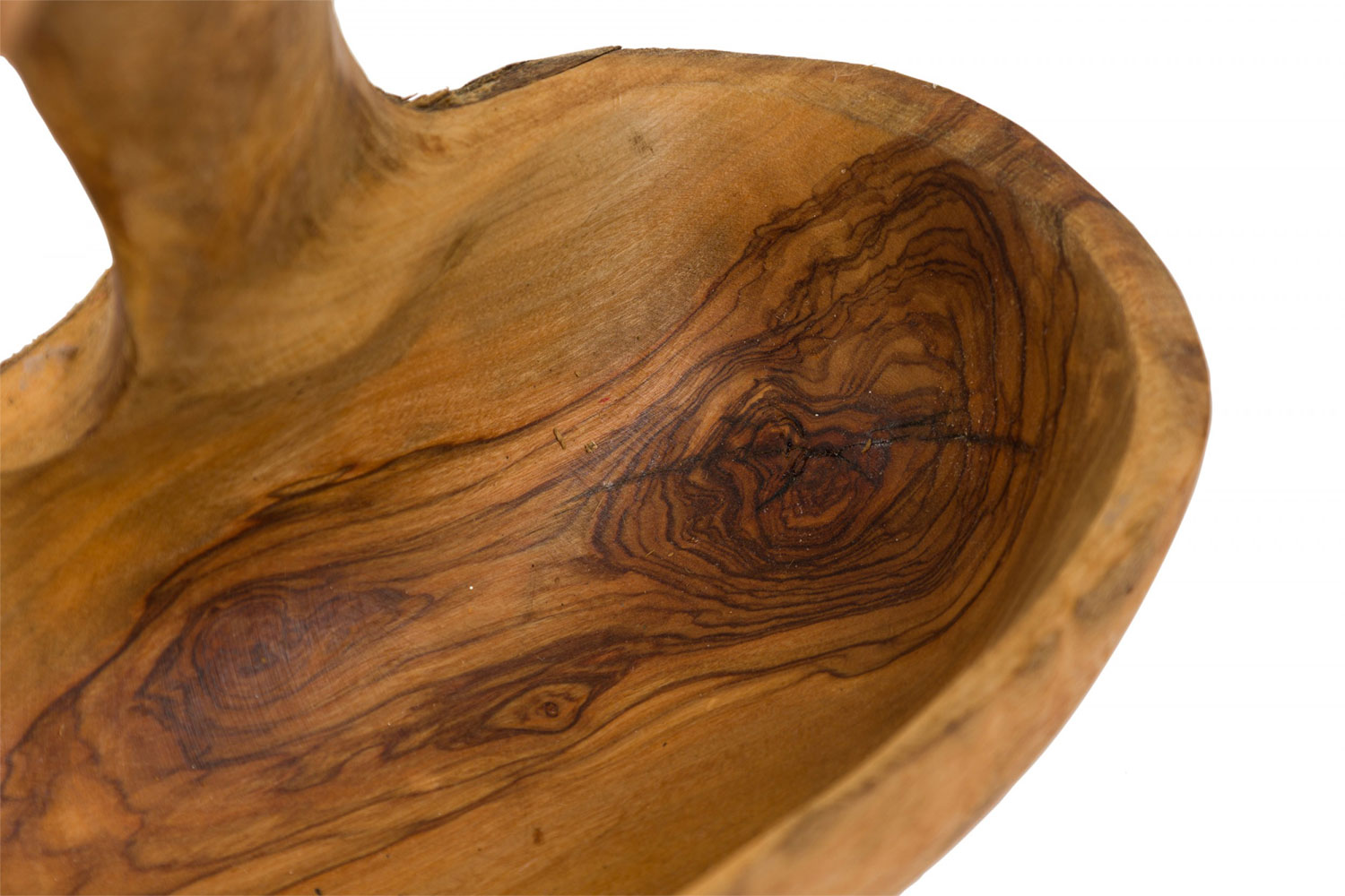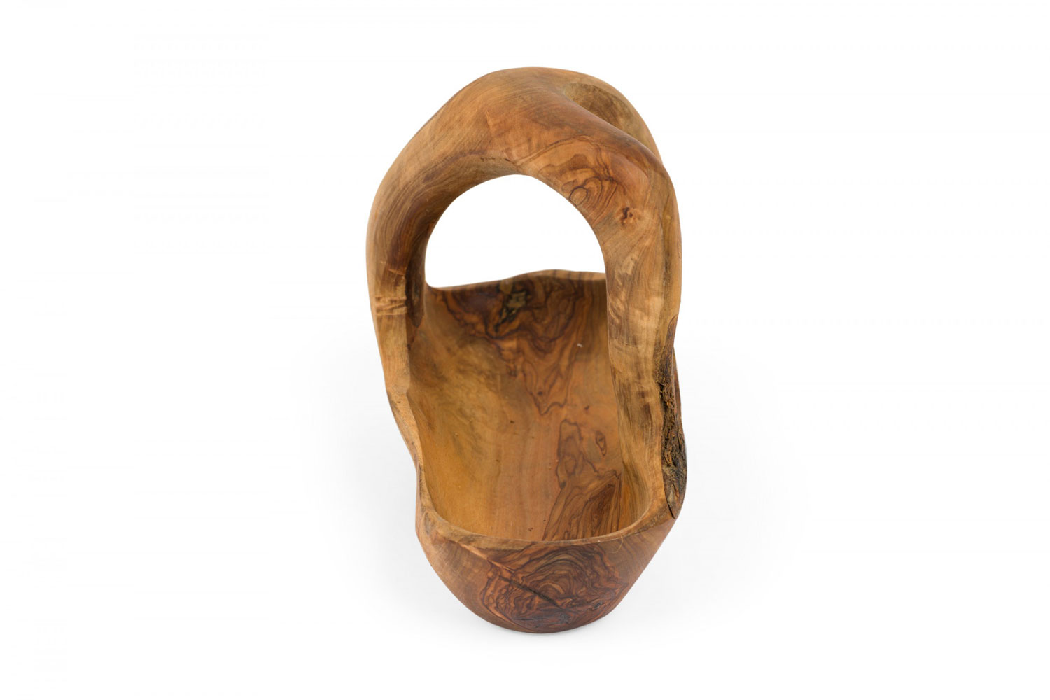 Contemporary Rustic Modern basket made of olive wood carved in an organic basket form with a Y-shaped handle.