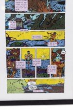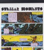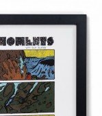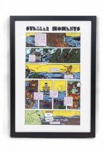 Contemporary cartoon strip in yellow green a blue of an astronaut and a robot regarding hygiene and alternative fuel options titled "Stellar Moments" with Oluf Olufsen in a black frame and white matting (Companion piece: 062550).