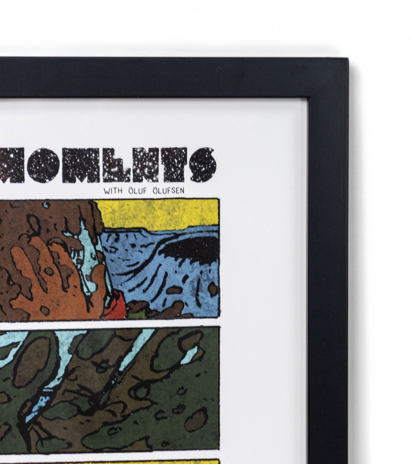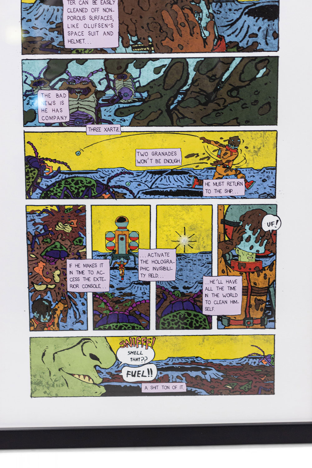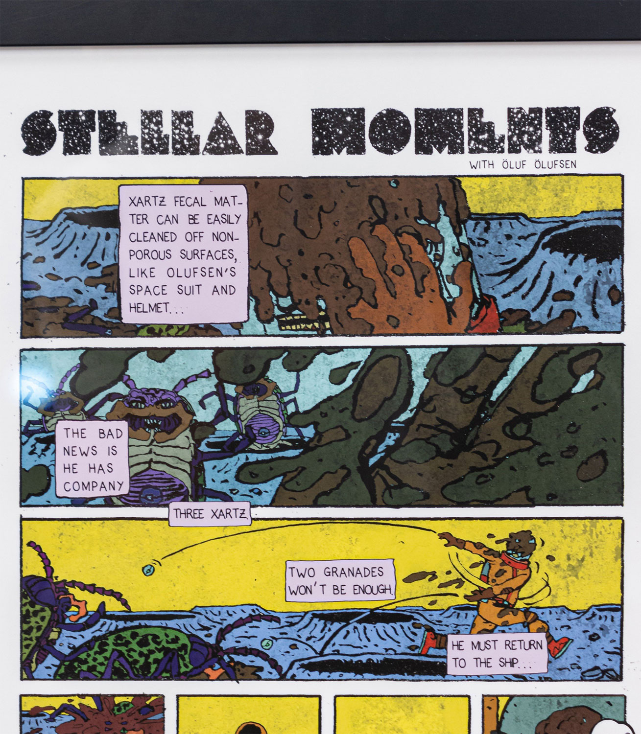 Contemporary cartoon strip in yellow green a blue of an astronaut and a robot regarding hygiene and alternative fuel options titled "Stellar Moments" with Oluf Olufsen in a black frame and white matting (Companion piece: 062550)