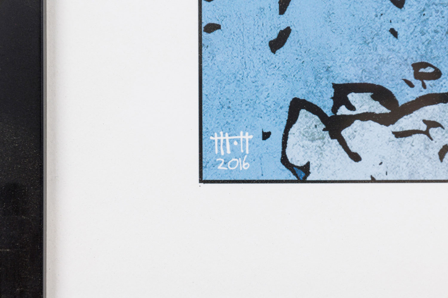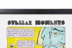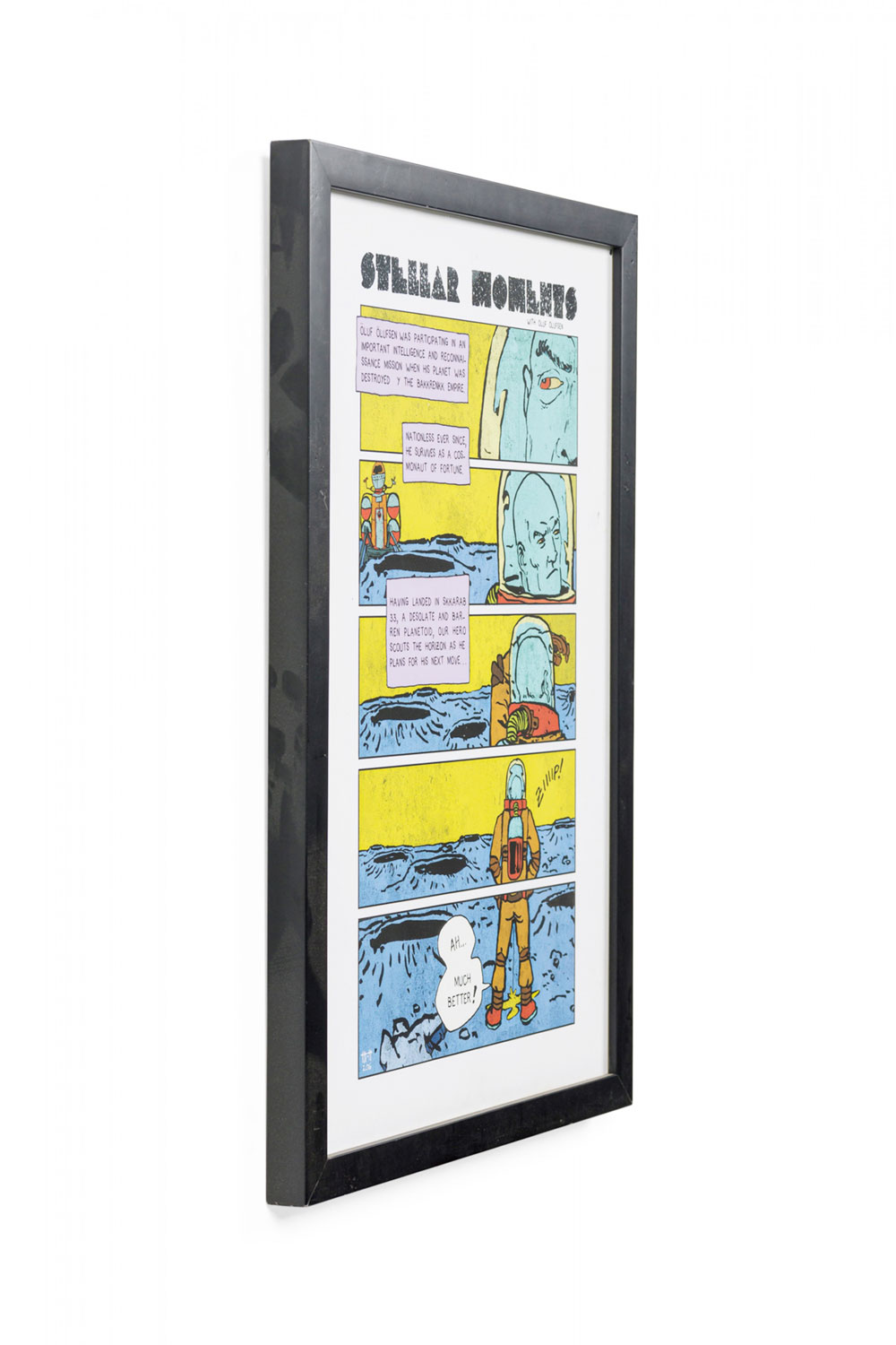 Contemporary cartoon strip in yellow and blue of an astronaut urinating titled "Stellar Moments" in a black rectangular frame and white matting (Companion piece: 062551)