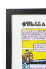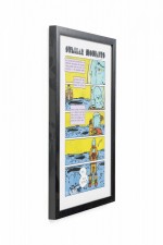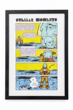 Contemporary cartoon strip in yellow and blue of an astronaut urinating titled "Stellar Moments" in a black rectangular frame and white matting (Companion piece: 062551).