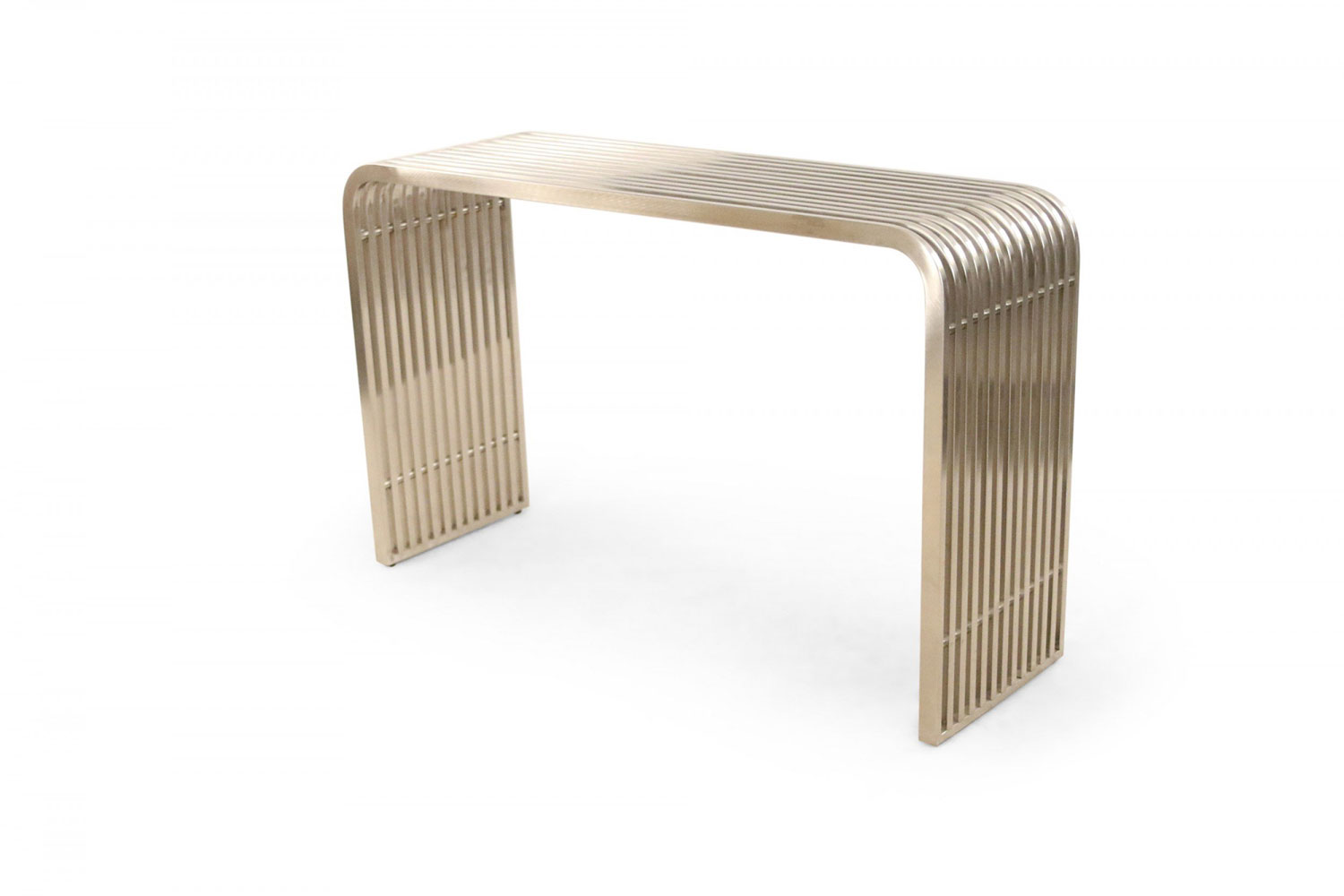 Pair of Contemporary Silver Metal Curved Metal Slat Console Tables