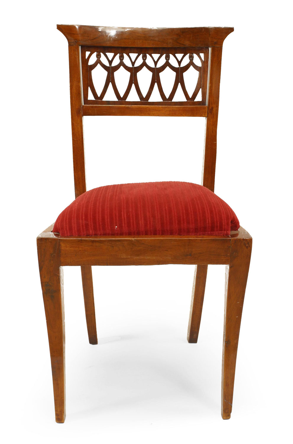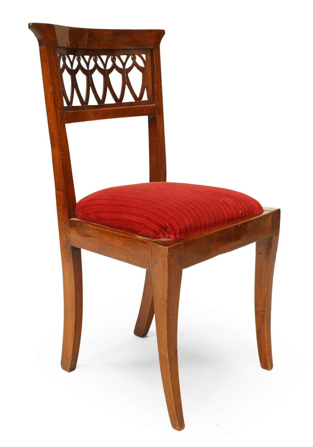 SET of 8 Continental Baltic (19th Cent) mahogany side chairs with a shaped back having an open filigree top panel and a slip seat.