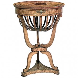 Style: Biedermeier Materials & Techniques: Burl, inlay, wood Category: Tables Condition: Some wear and adhesive residue on surface top Good; Wear consistent with age and use