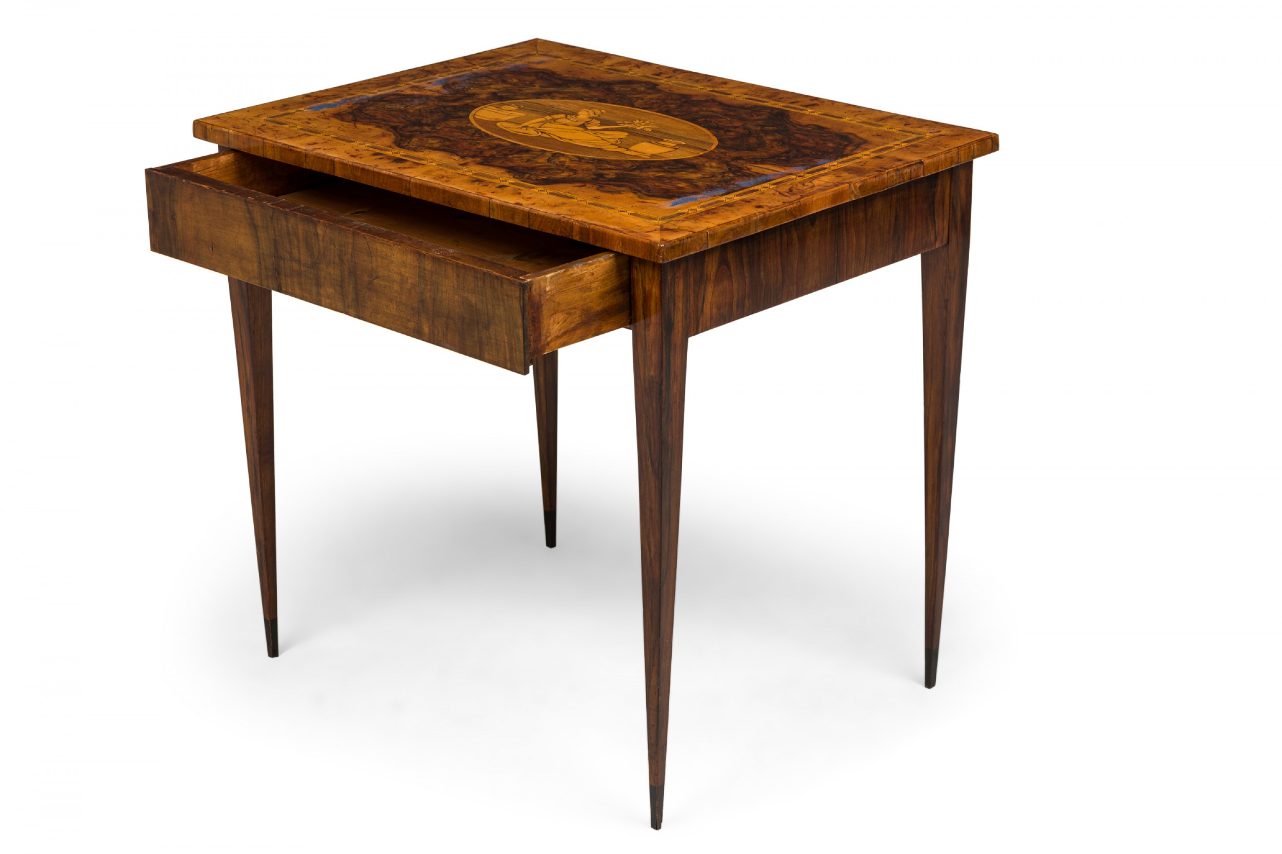Continental Biedermeier (19th Century possibly German) rectangular burl side table with pullout drawer, light-colored contrasting wood marquetry veneer, notable for its central oval design featuring an attractive maiden reclining between two vases, her left arm raising a bouquet of flowers.