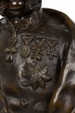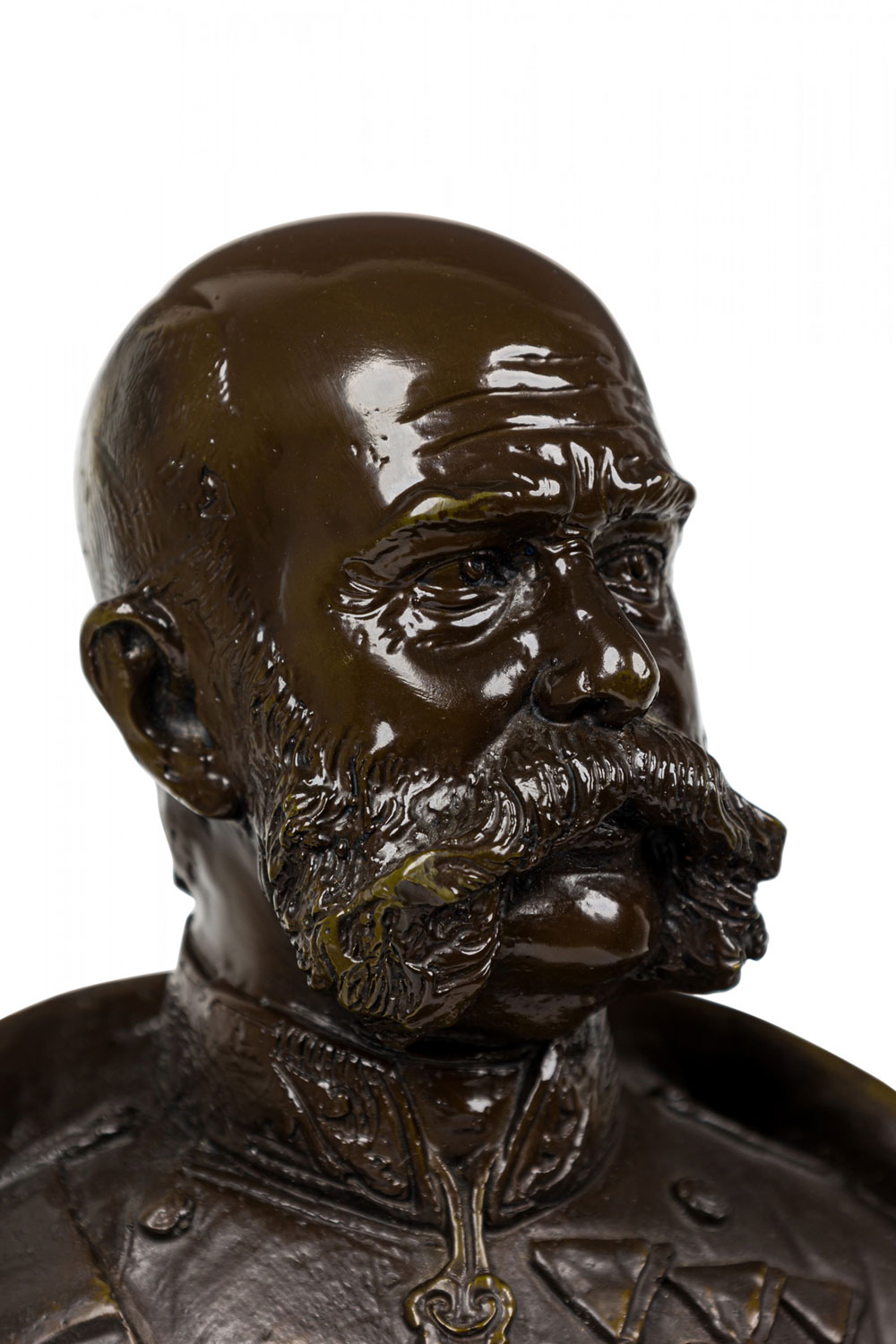 Continental German (19/20th Century) bronze bust depicting a dignitary / military officer with prominent mustache, wearing several medals, mounted on a beveled black marble rectangular plinth. (Signed "Jem Davidson" on the back shoulder)..
