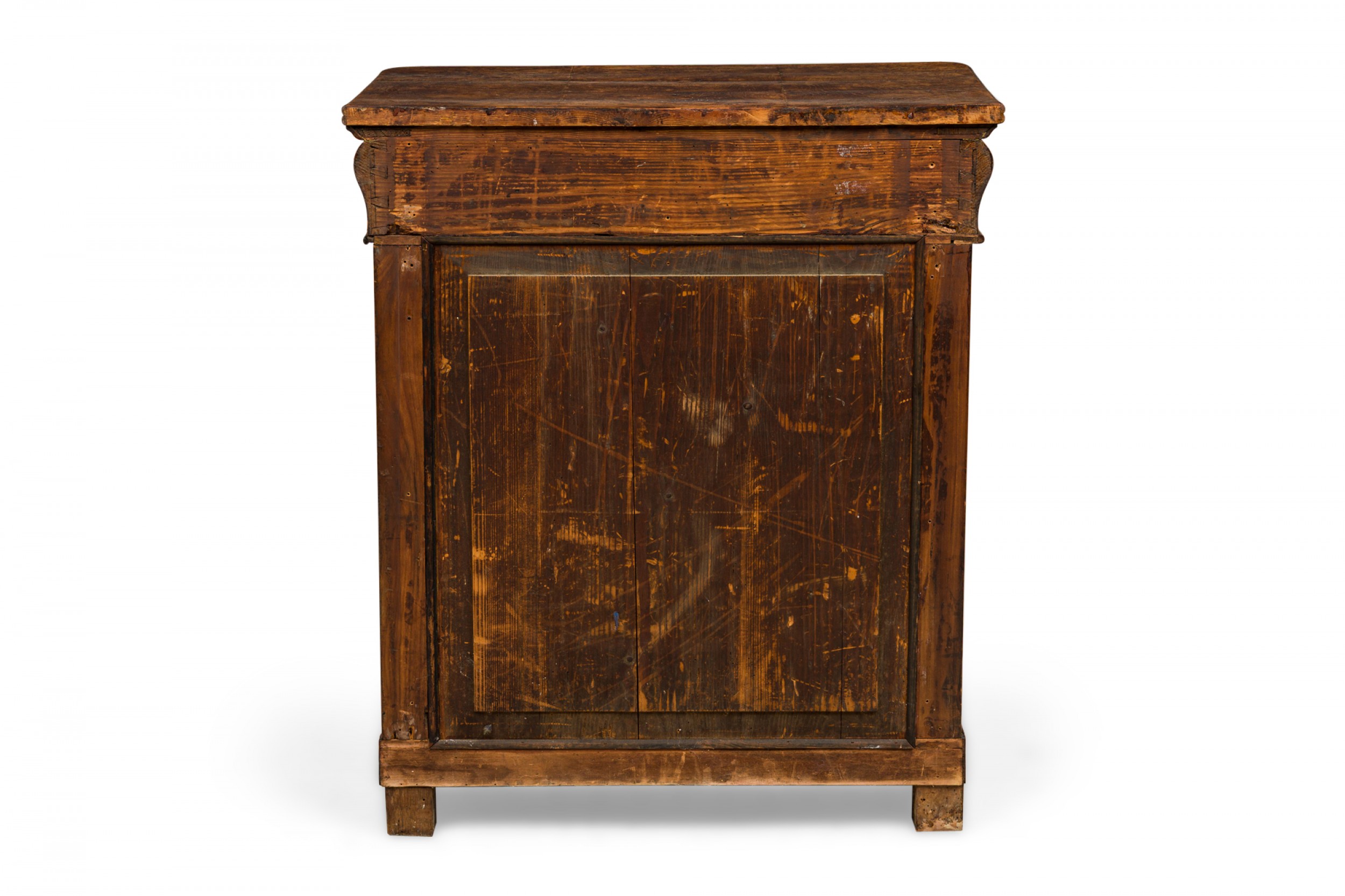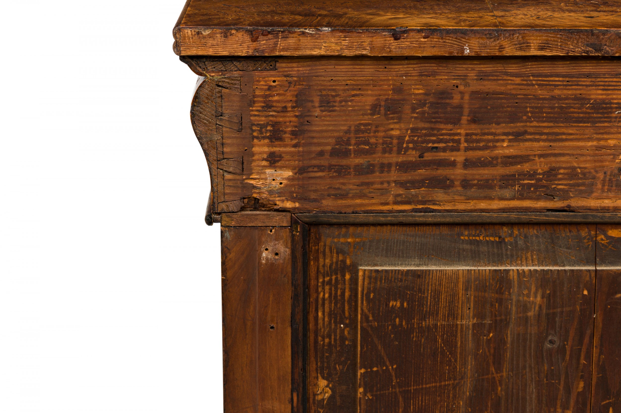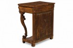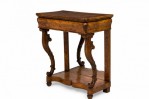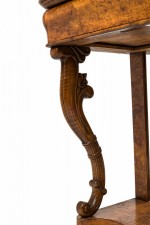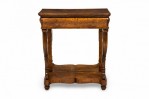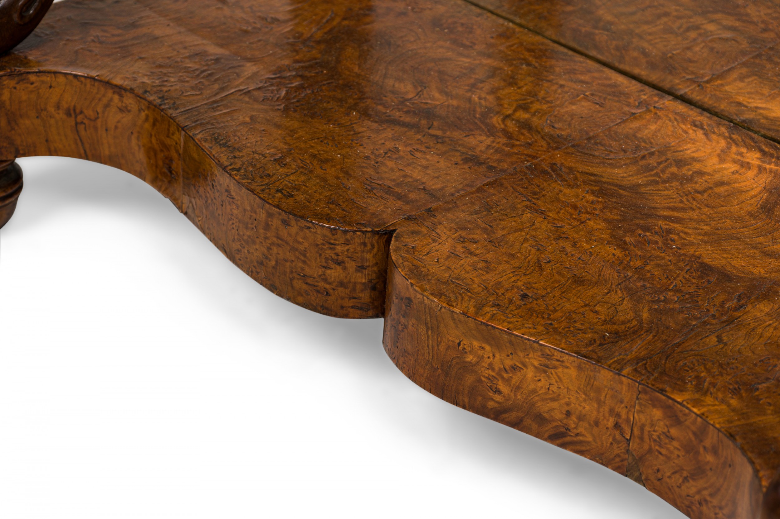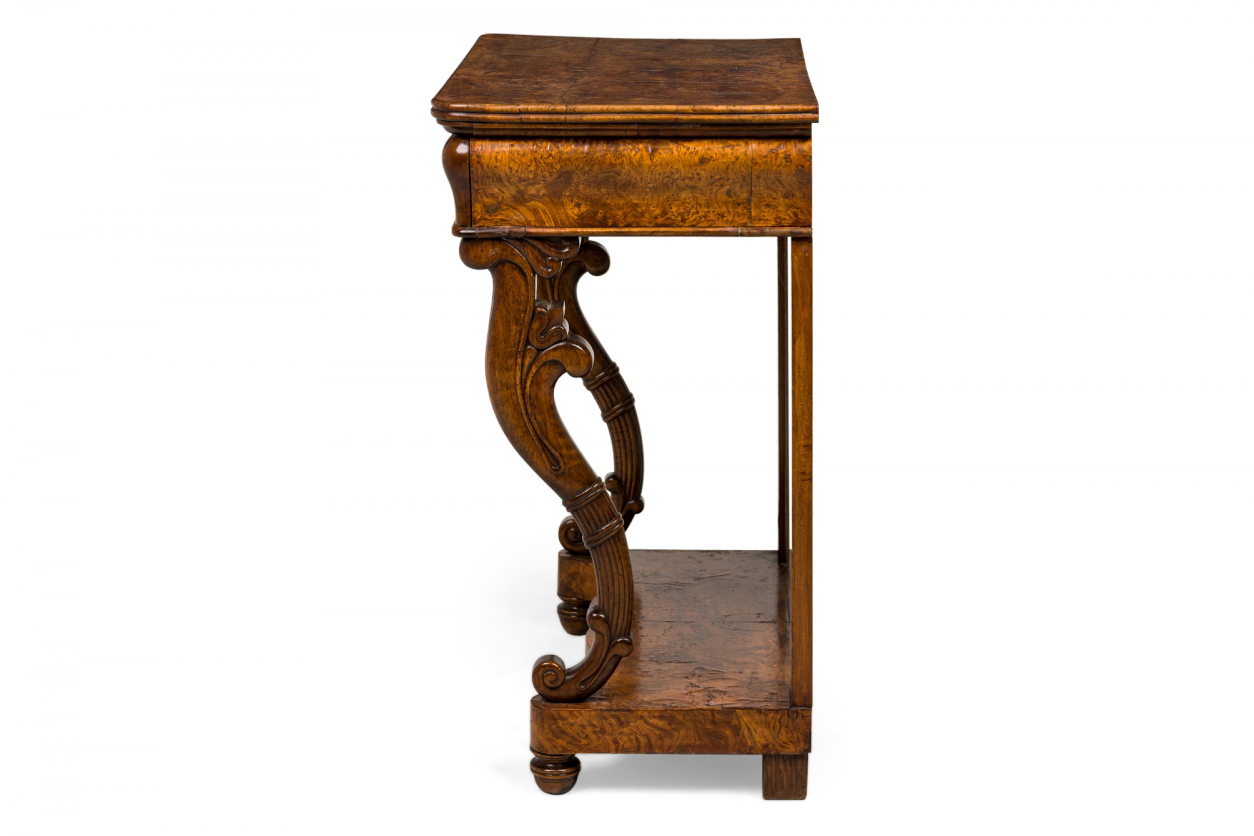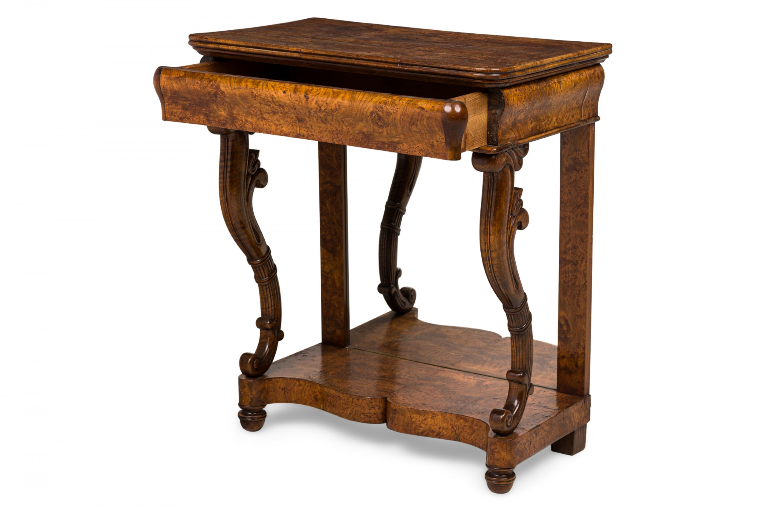 Continental (early19th Century, posslbily German) burl elm shaped rectangular console table with molded beveled top, tapered mid-section with pullout drawer and bottom shelf over a mirror back, standing on carved cabriole scroll front legs.