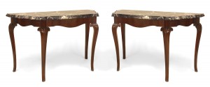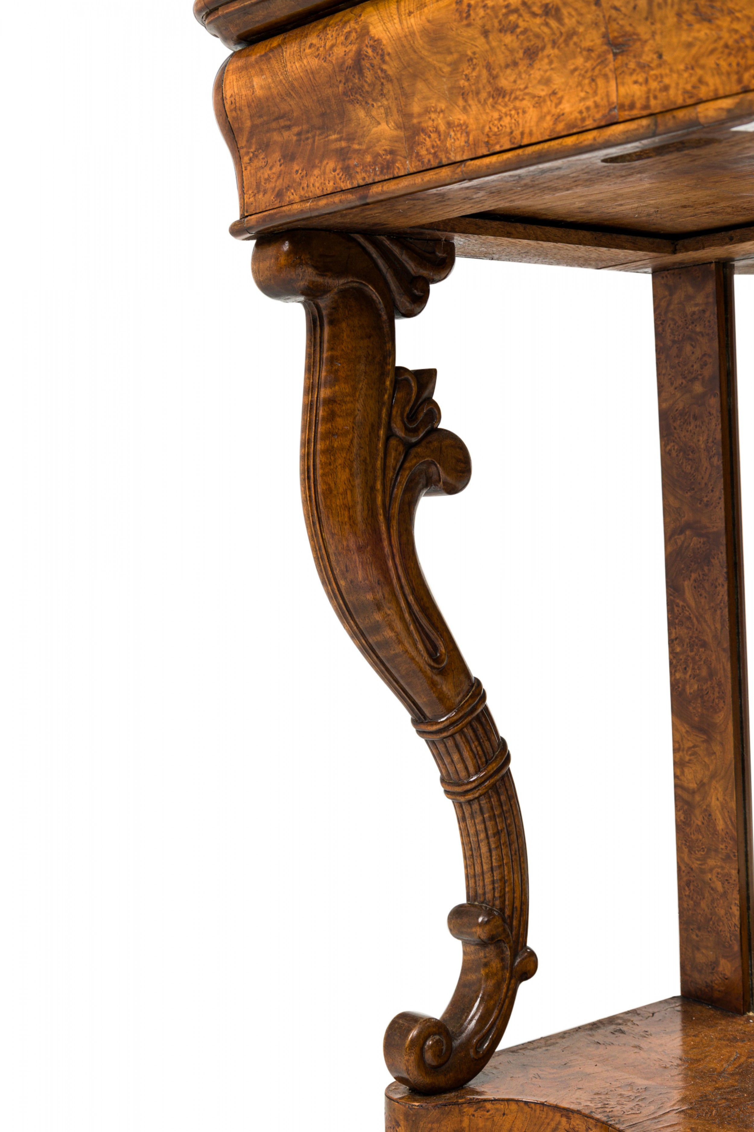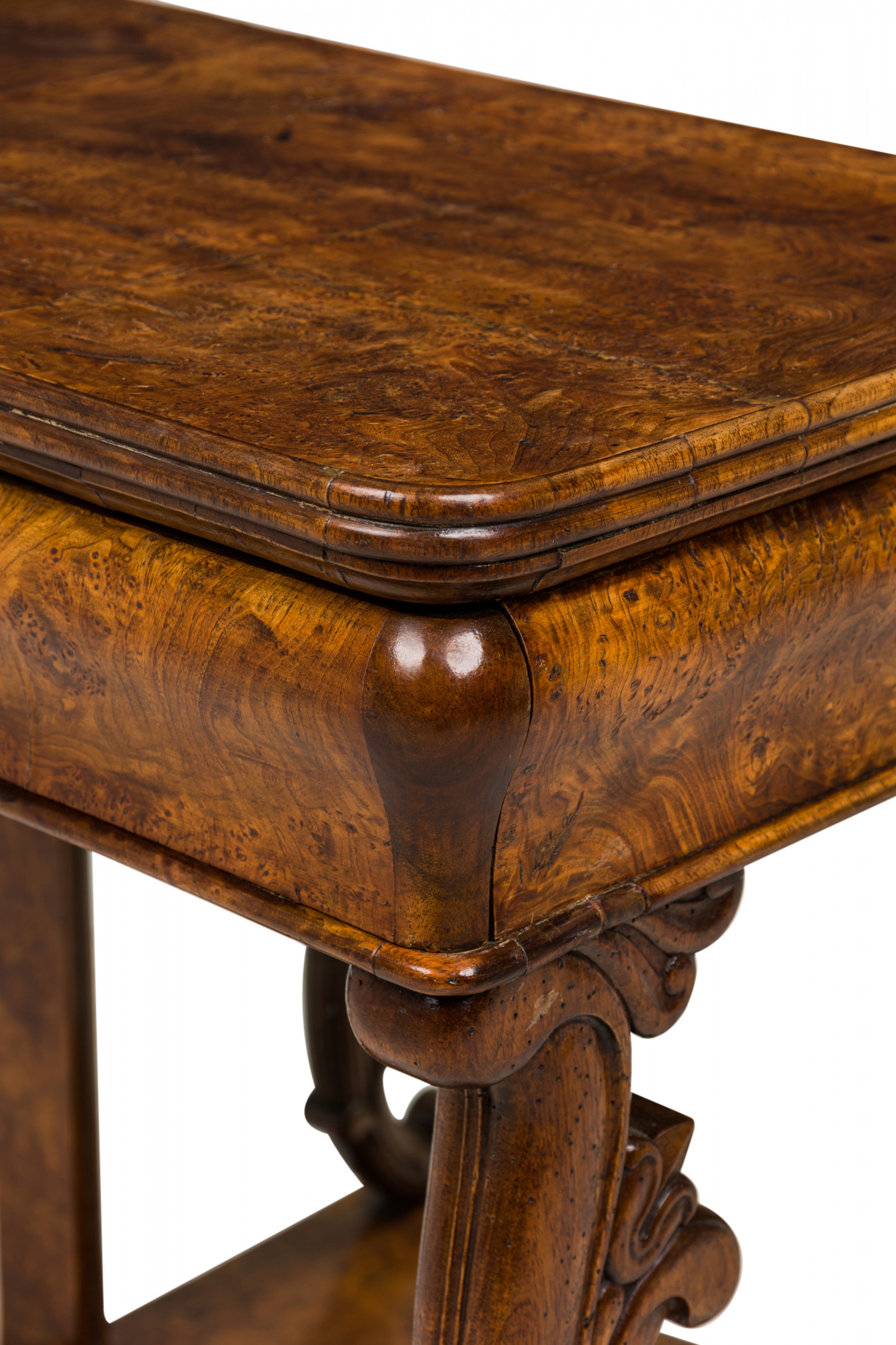 Continental (early19th Century, posslbily German) burl elm shaped rectangular console table with molded beveled top, tapered mid-section with pullout drawer and bottom shelf over a mirror back, standing on carved cabriole scroll front legs..