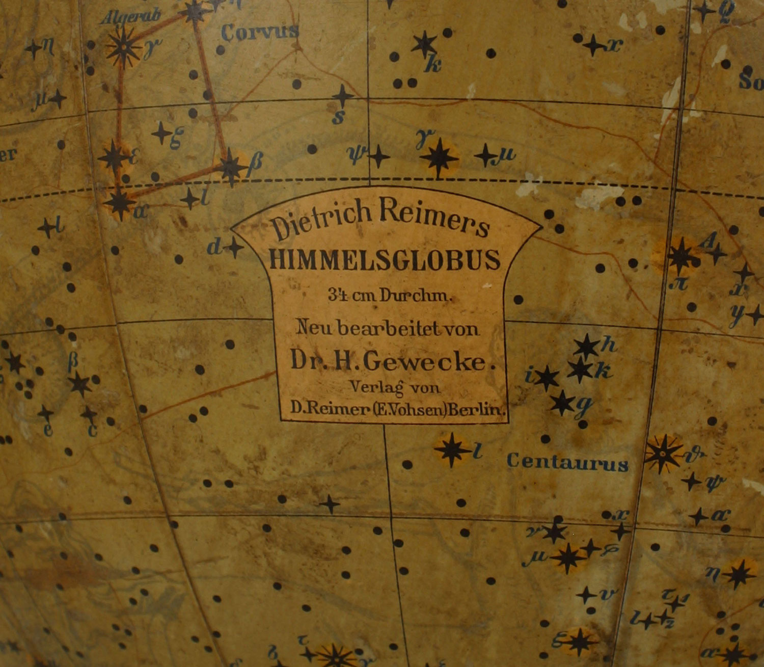 Continental German (19th Century) celestial globe with compass on wooden tripod base (DIETRICH REIMERS HIMMELSGLOBUS).