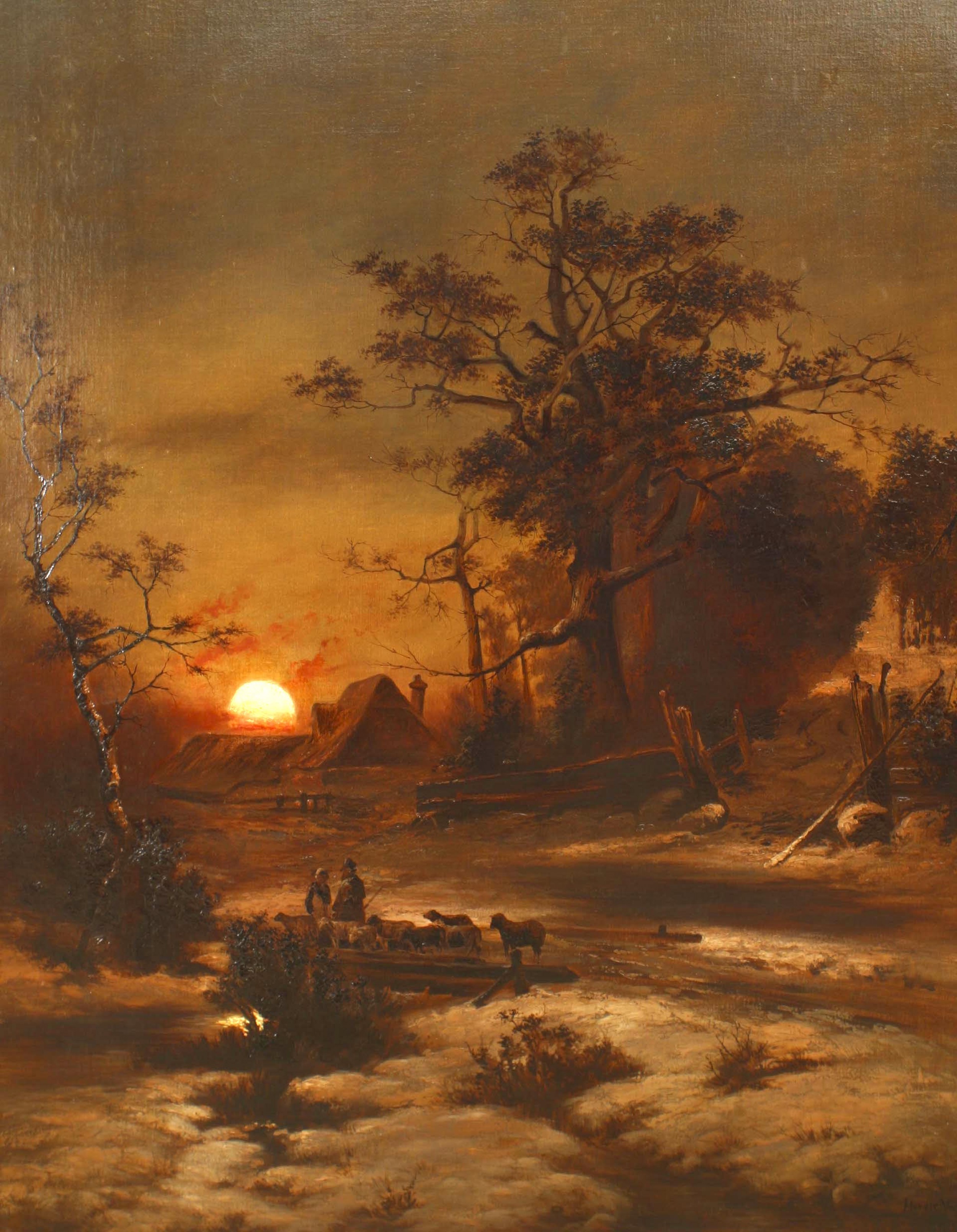 Continental Dutch (19th Cent) oil on canvas depicting two figures tending to sheep in a wooded landscape with cottage (signed HENRI VAN MAAS & dated 1887).