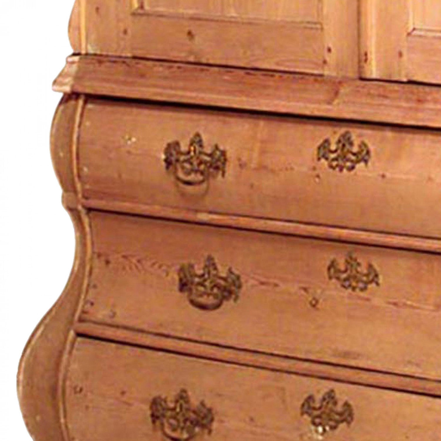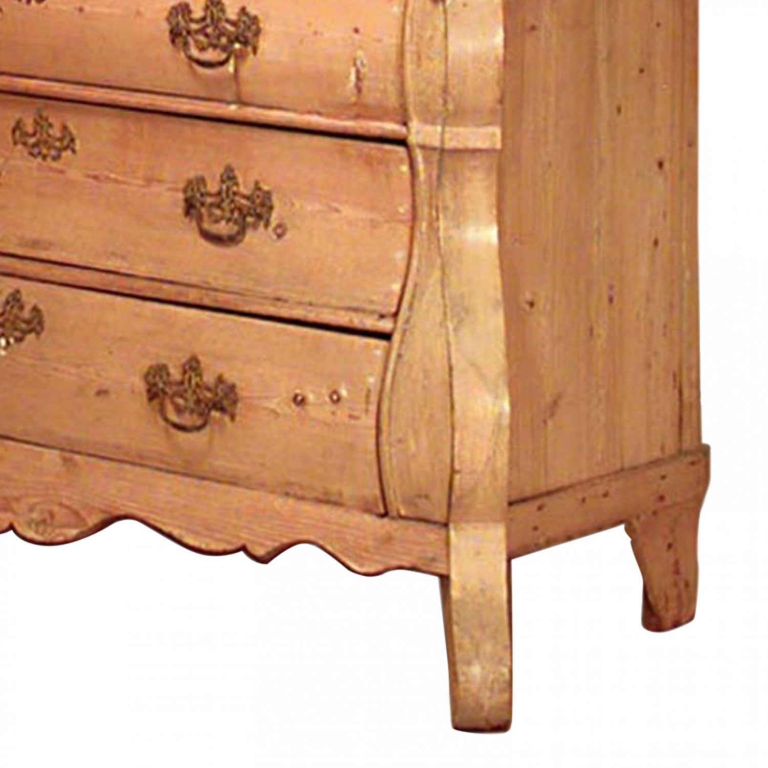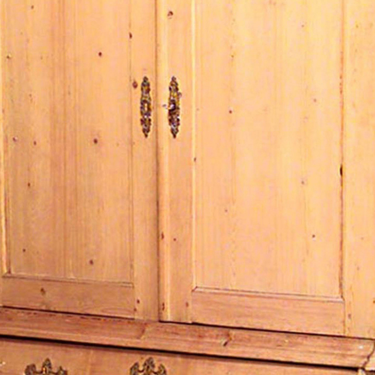 Style: Continental Materials & Techniques: Brass, pine, stripped Category: Cabinets & Case Goods Condition: Some unstained wood filler and chips on its trim.