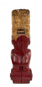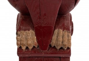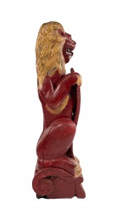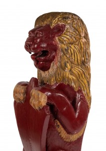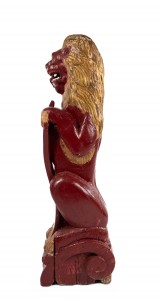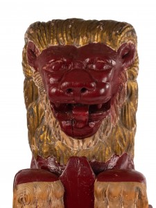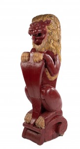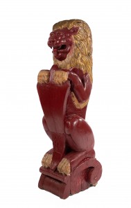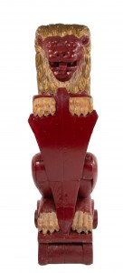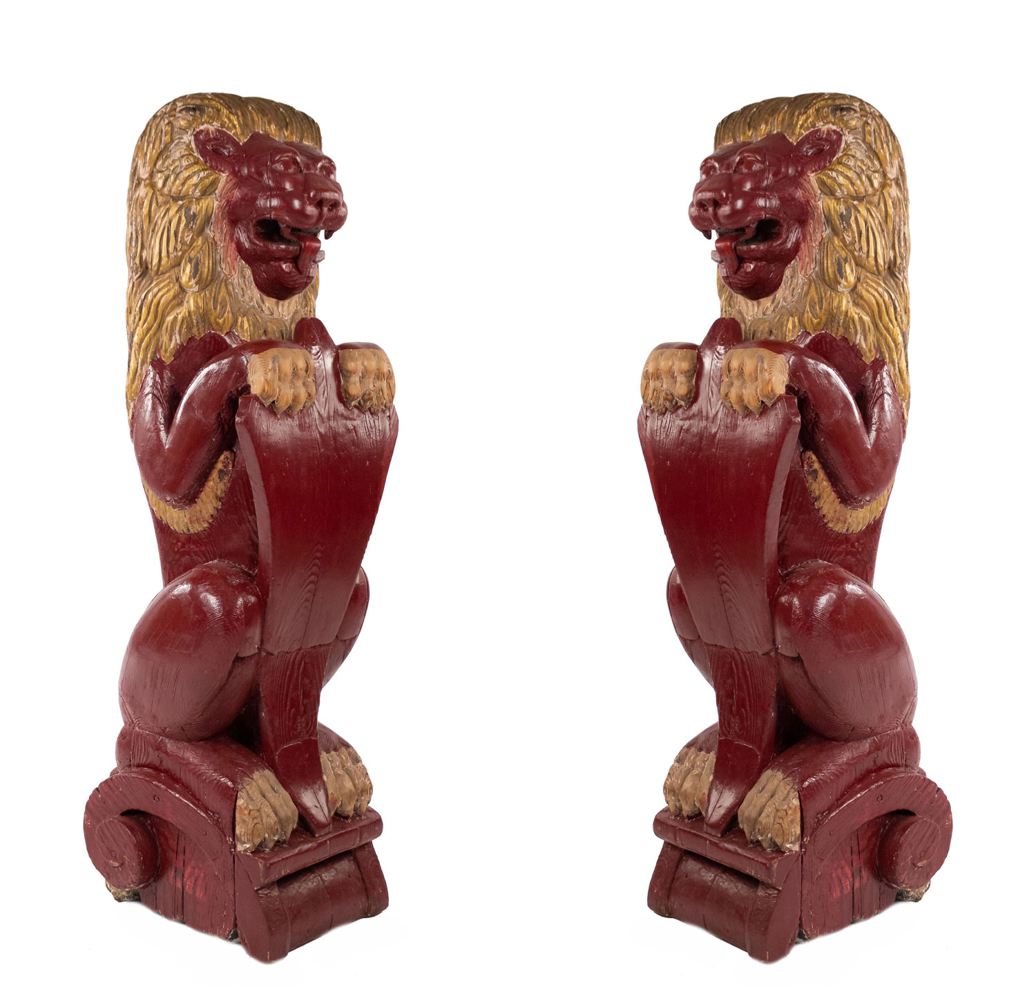 PAIR of Continental Dutch style (19th Cent) red painted pine large kneeling lion with gold manes (each now painted in different manners)