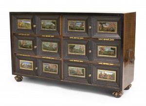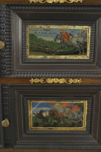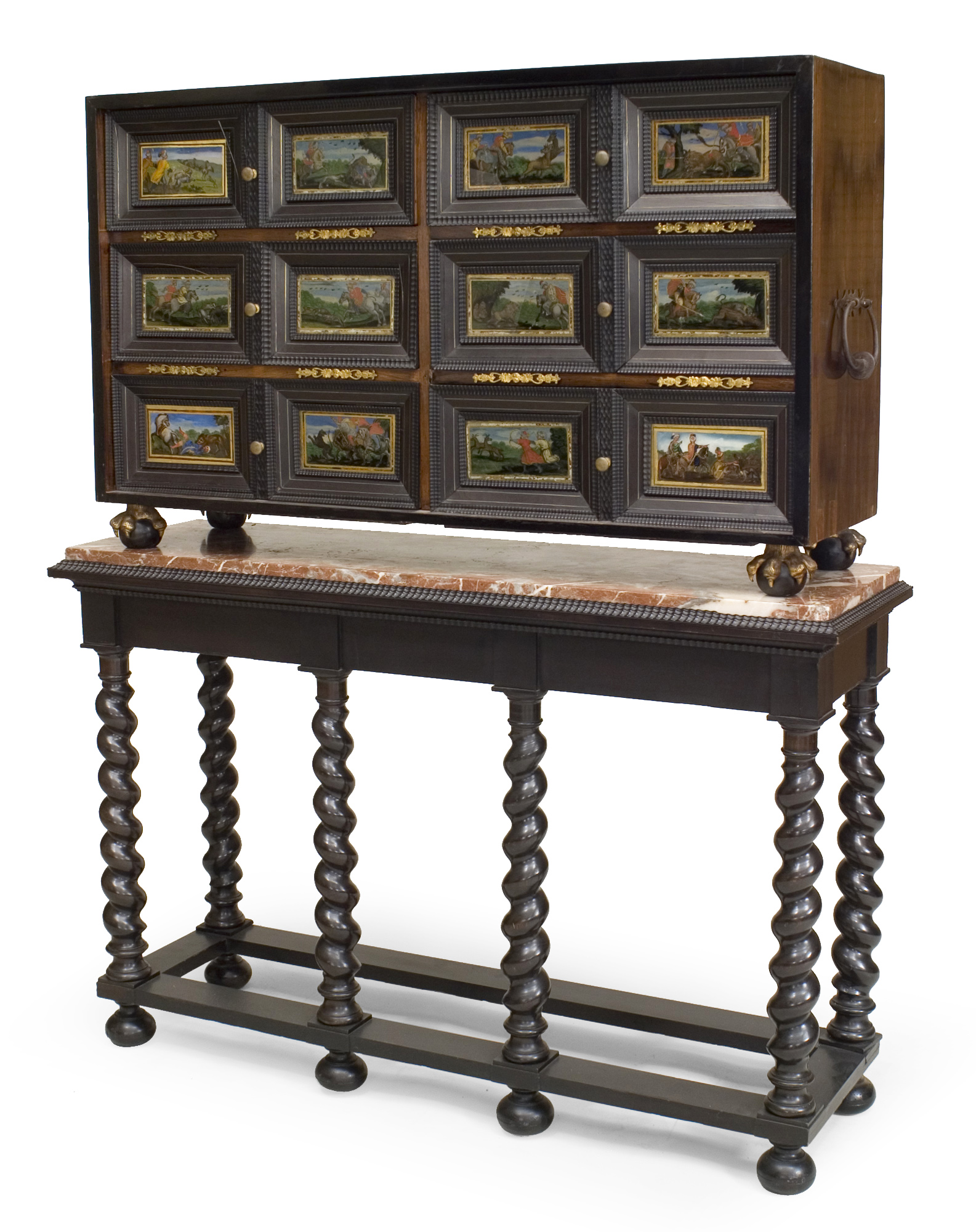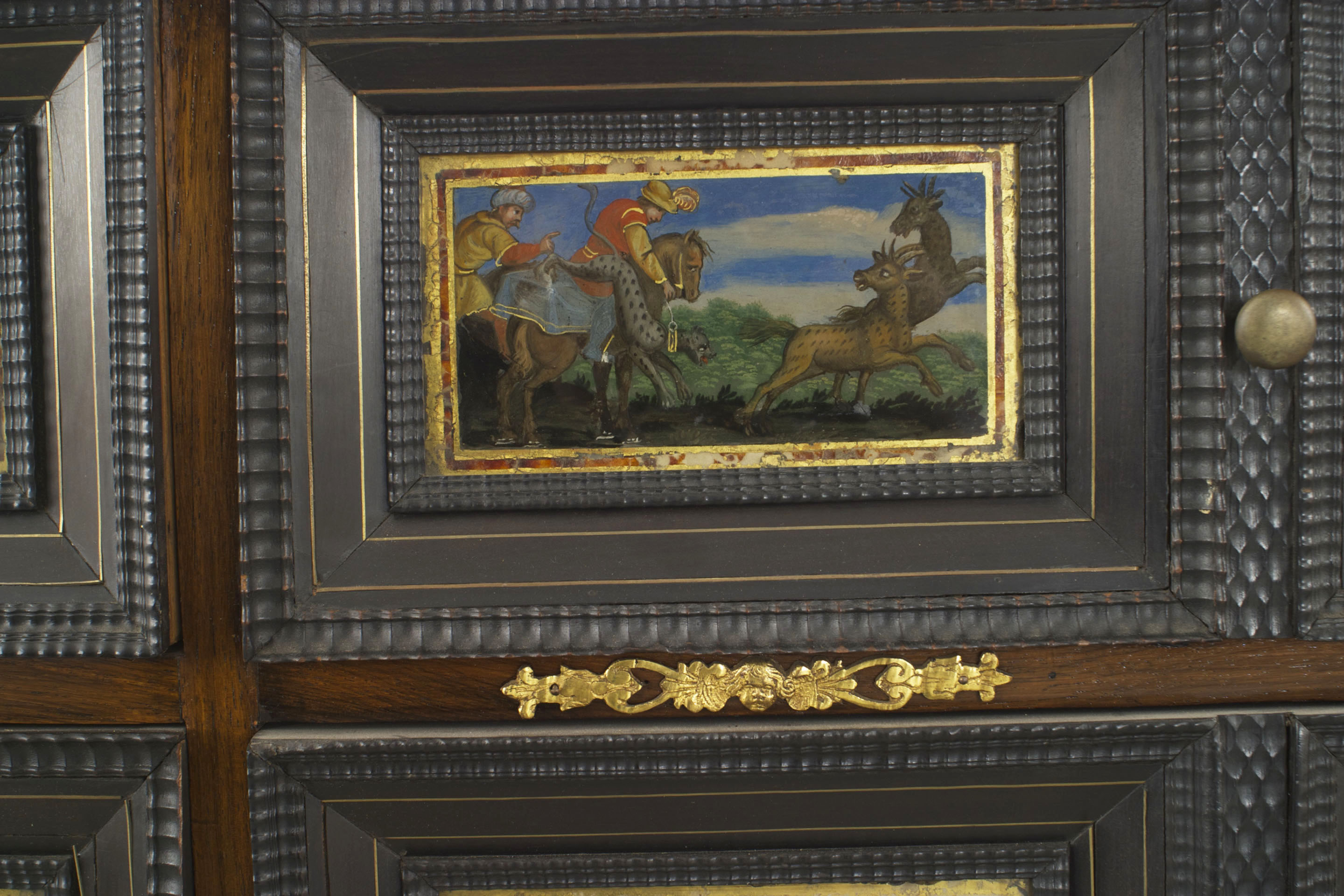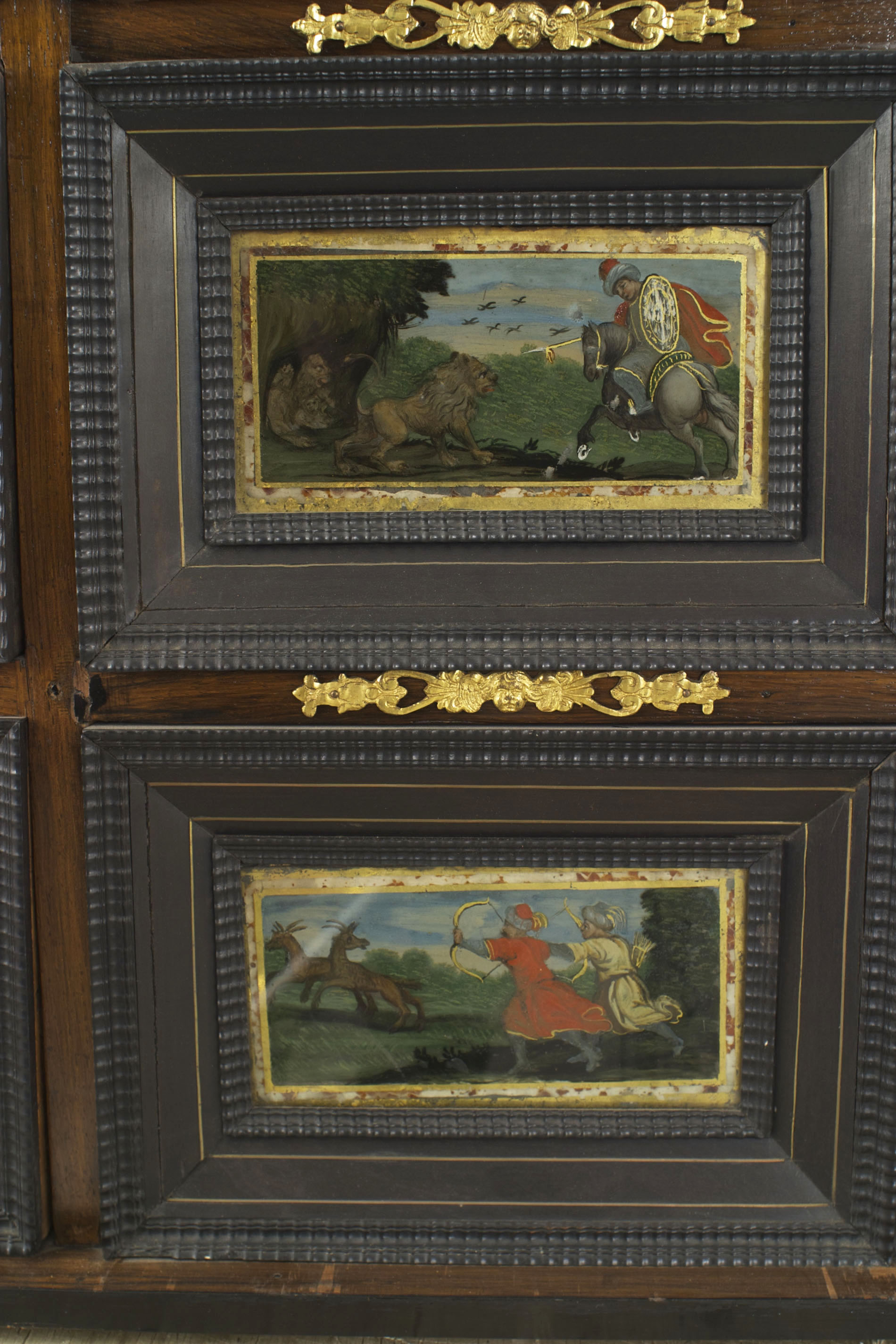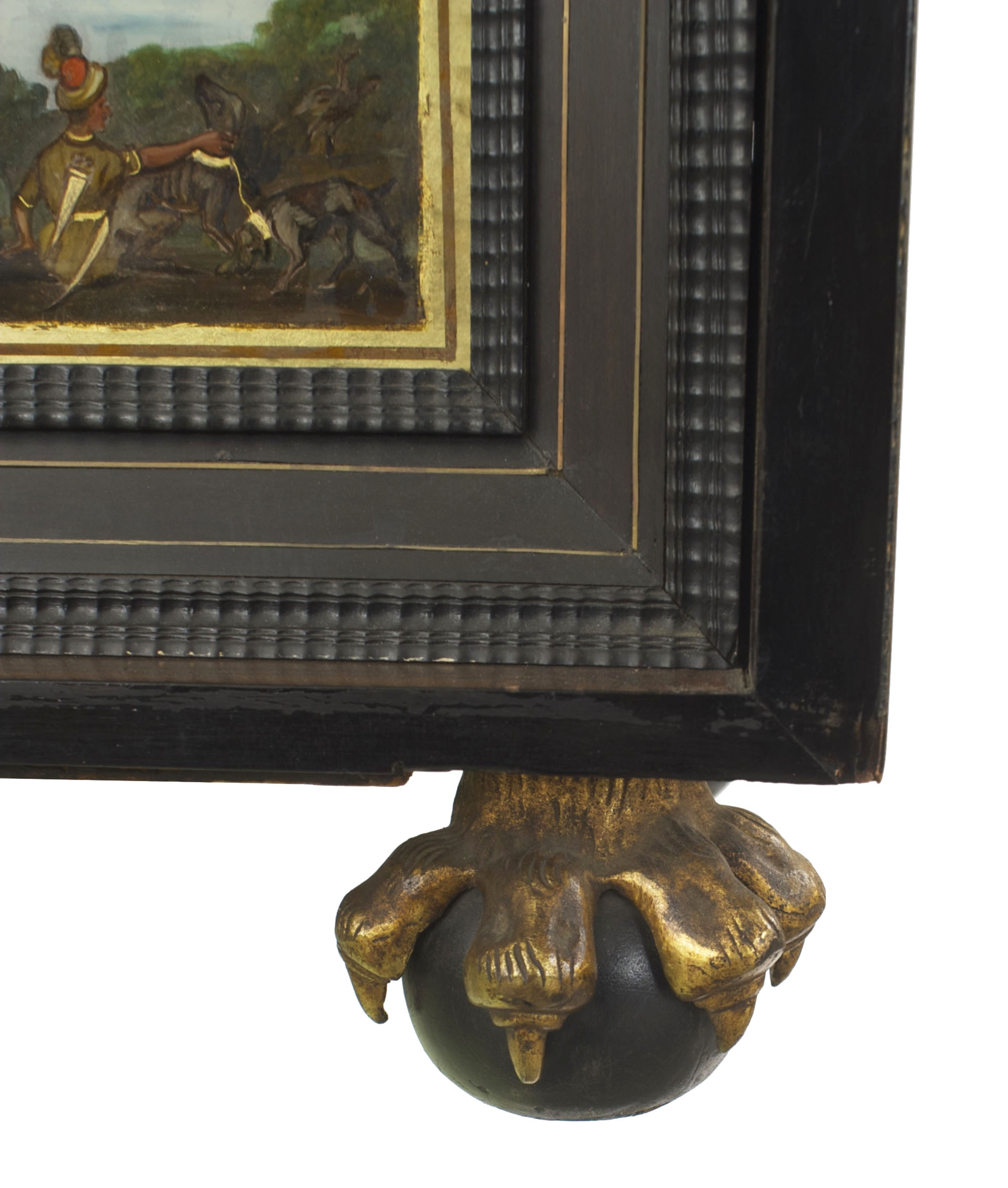 Continental (possibly Flemish 19/20th Century) ebonized cabinet with a series of reverse painted on glass panels on 6 drawers raised on claw feet (Related Item: PPF077A).