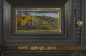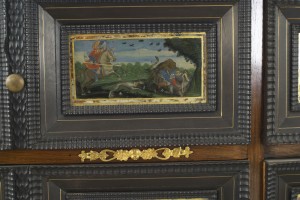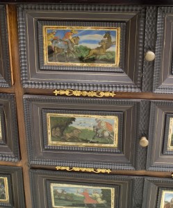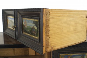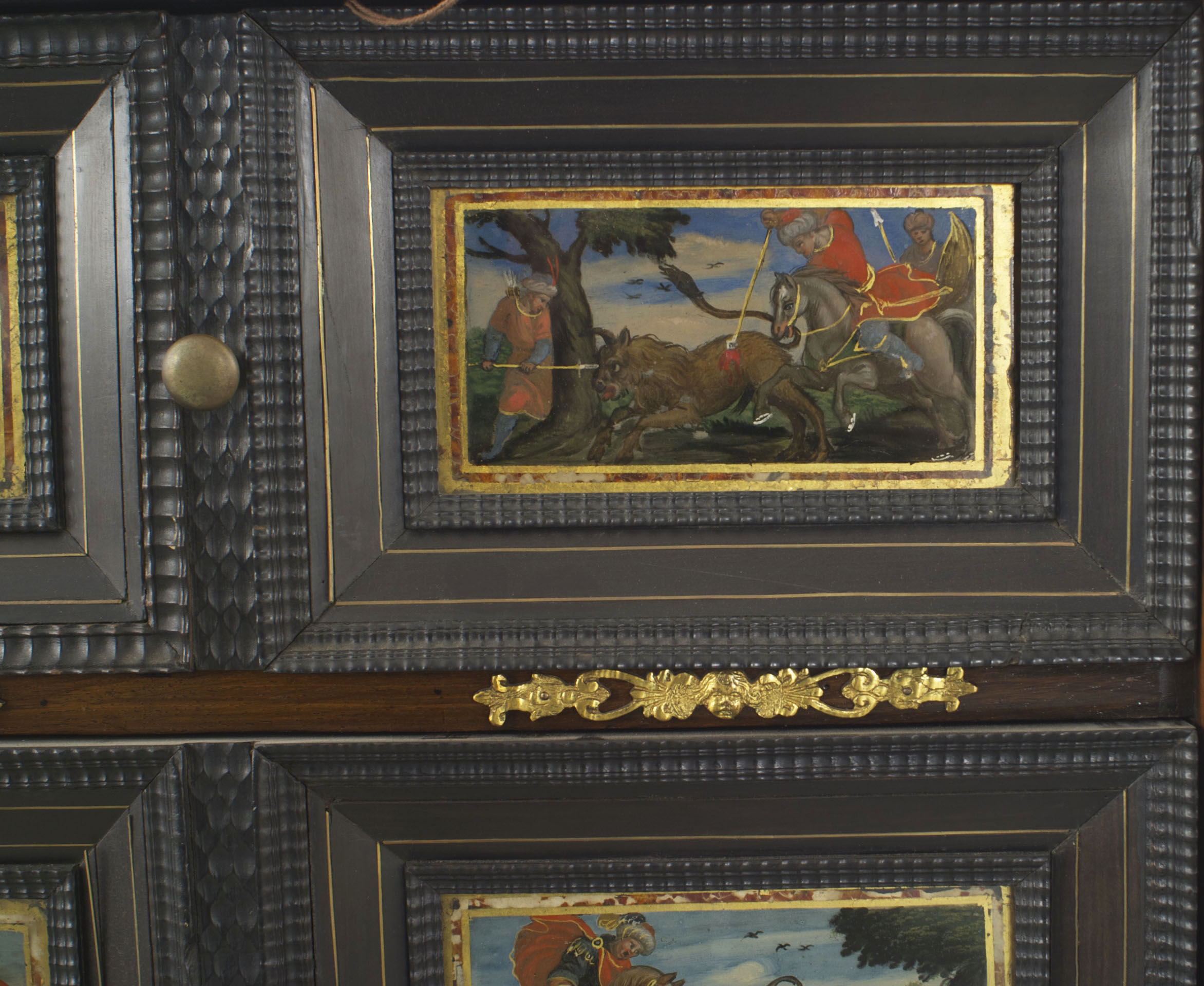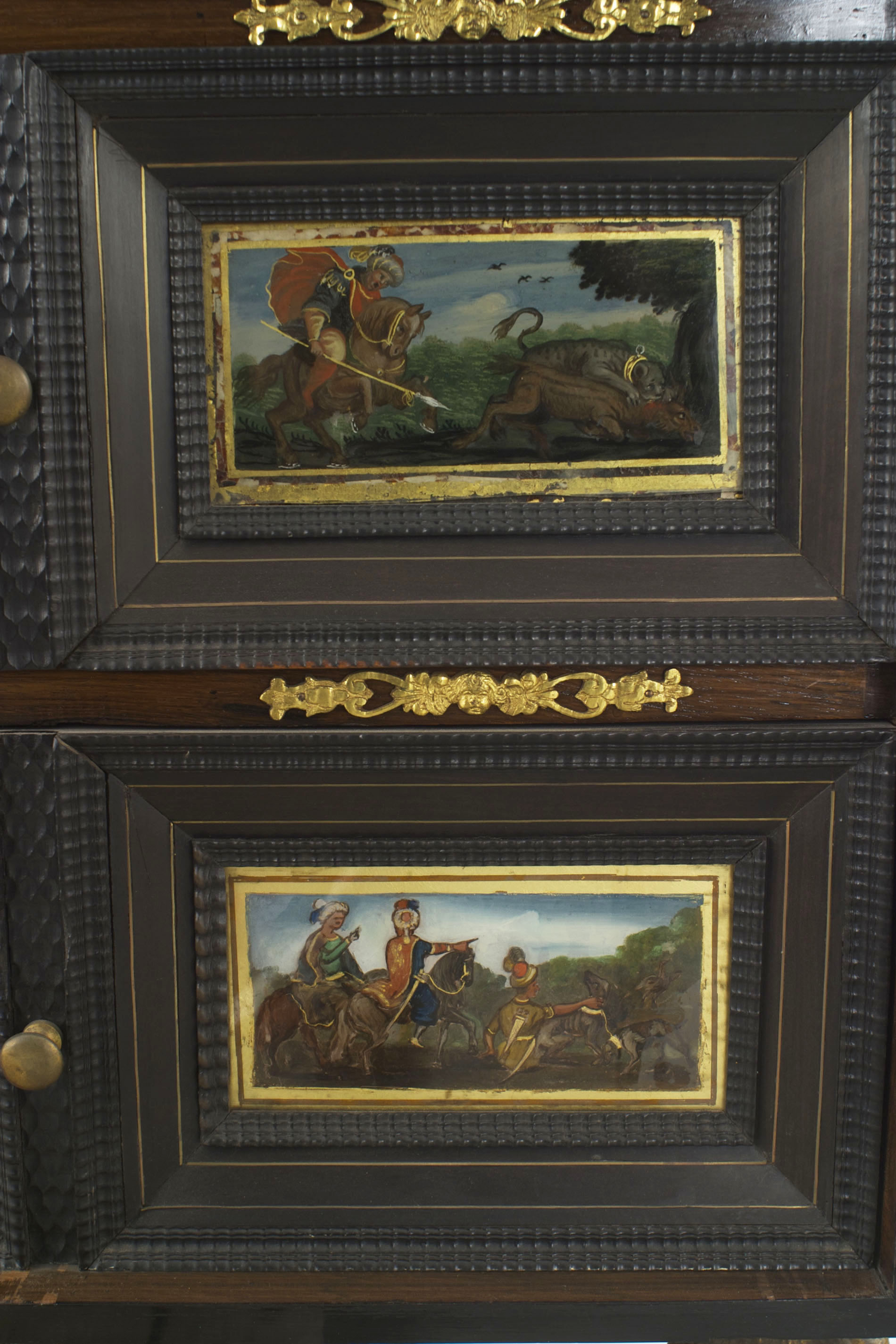 Continental (possibly Flemish 19/20th Century) ebonized cabinet with a series of reverse painted on glass panels on 6 drawers raised on claw feet (Related Item: PPF077A)