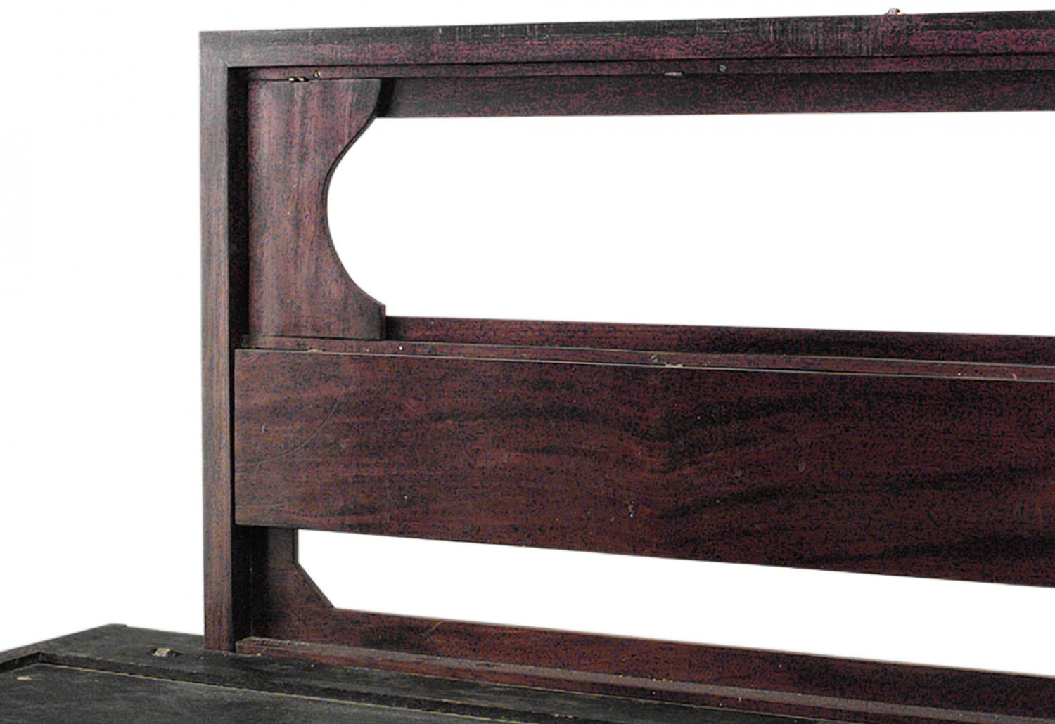 Continental Dutch Empire-style (Circa 1840) black lacquer Chinoiserie console table with adjustable mirror on back and bronze heads with black marble top.