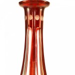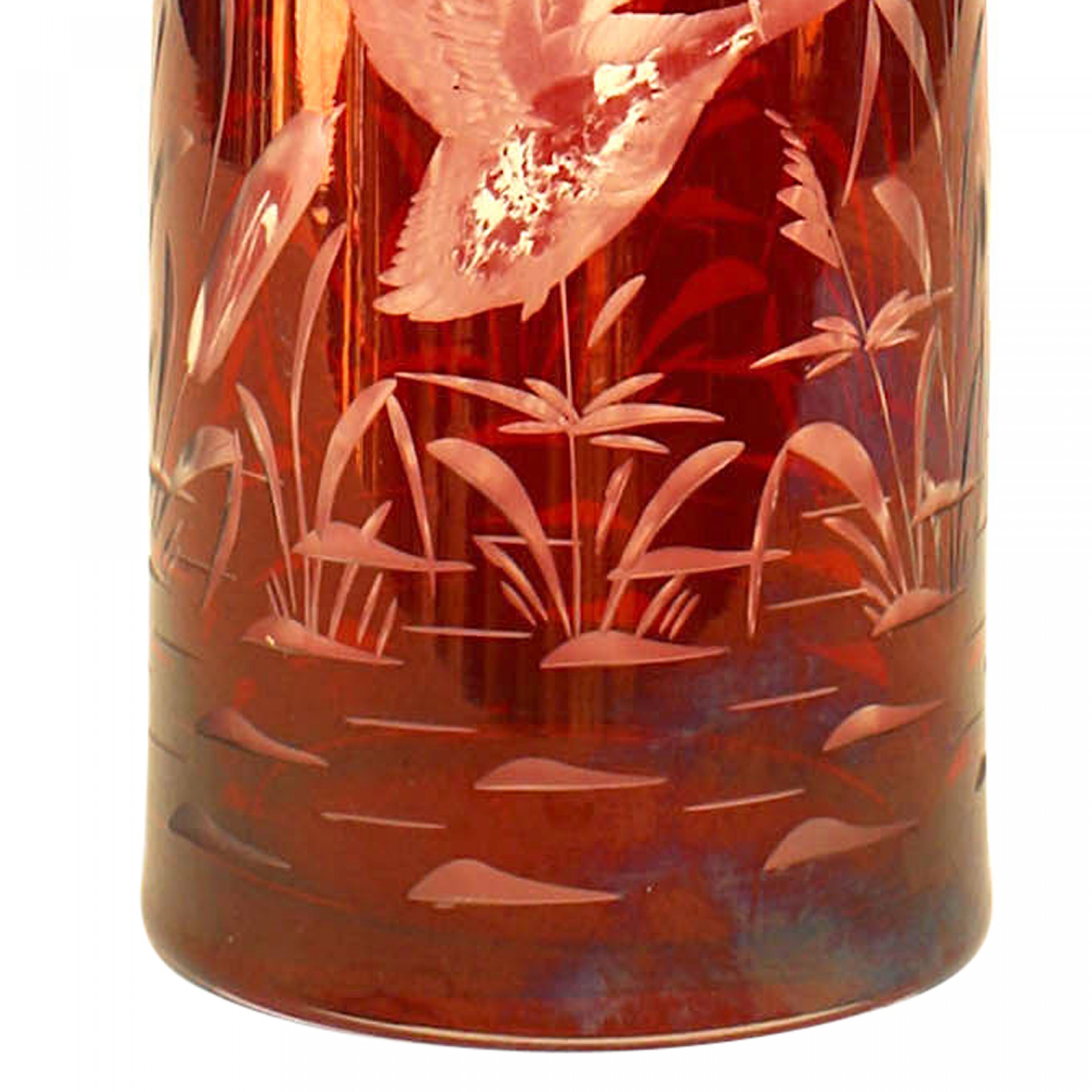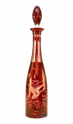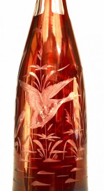 Continental German cranberry glass decanter with etched scene of ducks and foliage with stopper..