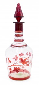 2 Continental German-style (19th Century) crystal decanters with ruby colored trim and floral and bird design and stoppers (PRICED EACH).