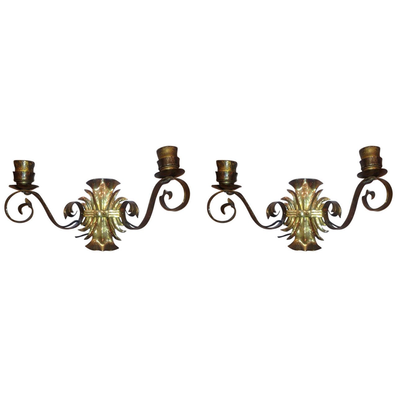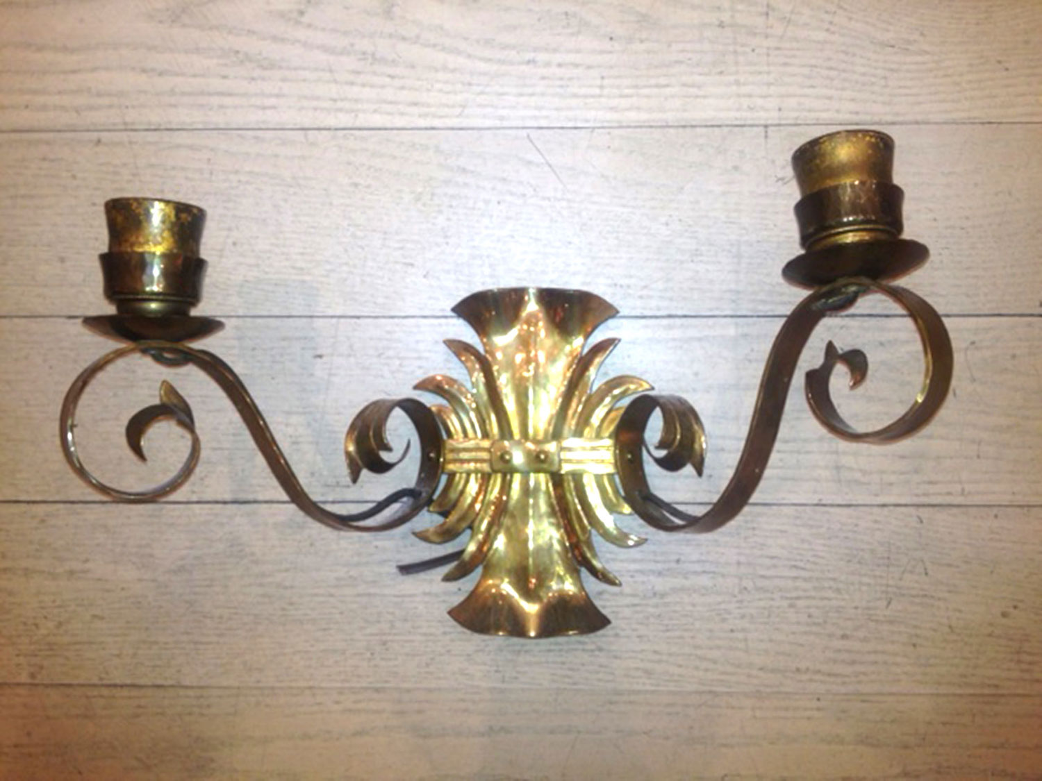 PAIR of Continental German(19/20th Century) hammered brass wall sconces with two scrolled arms flanking a scalloped back-plate. (PRICED AS PAIR).