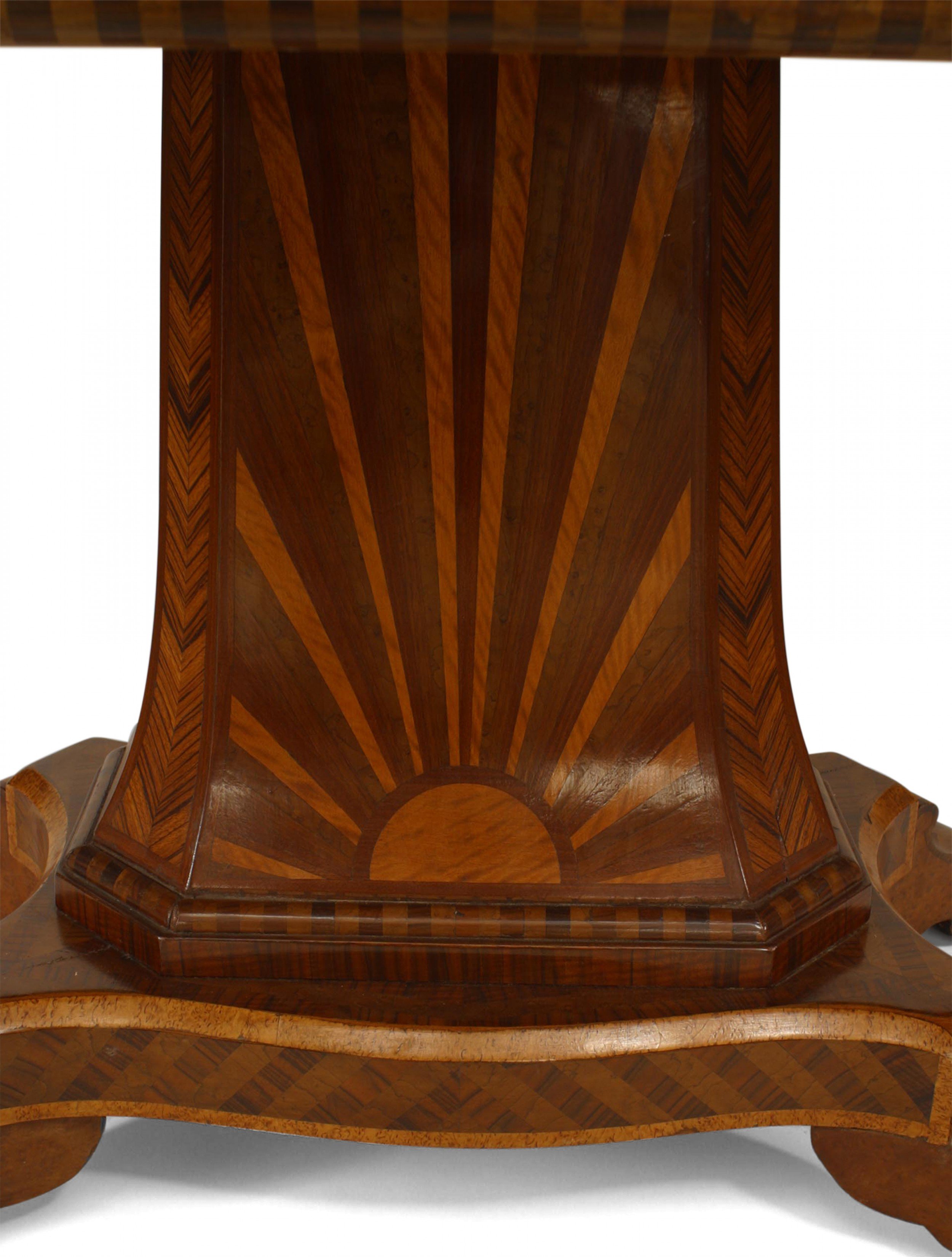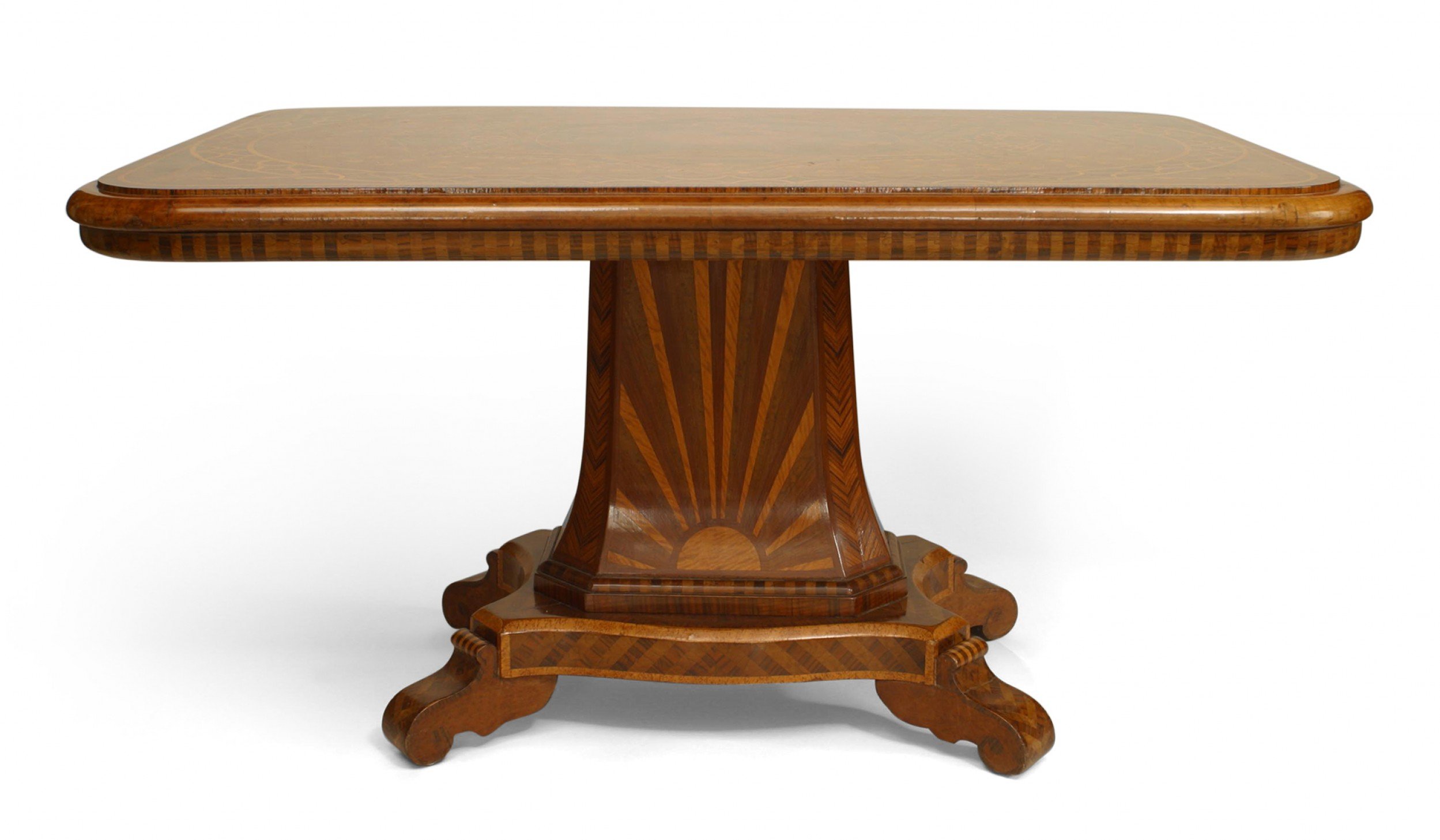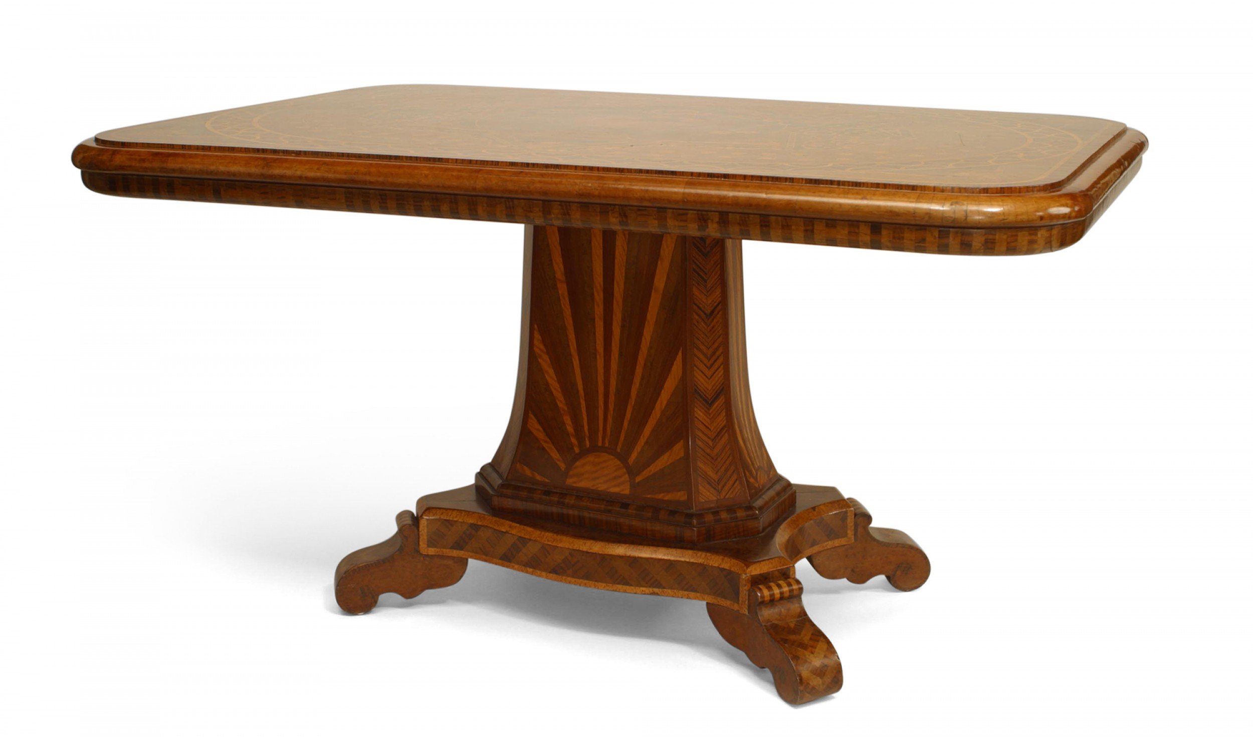 Continental German (circa 1825) rectangular pedestal base center table inlaid with various woods and top with an urn design within a border.