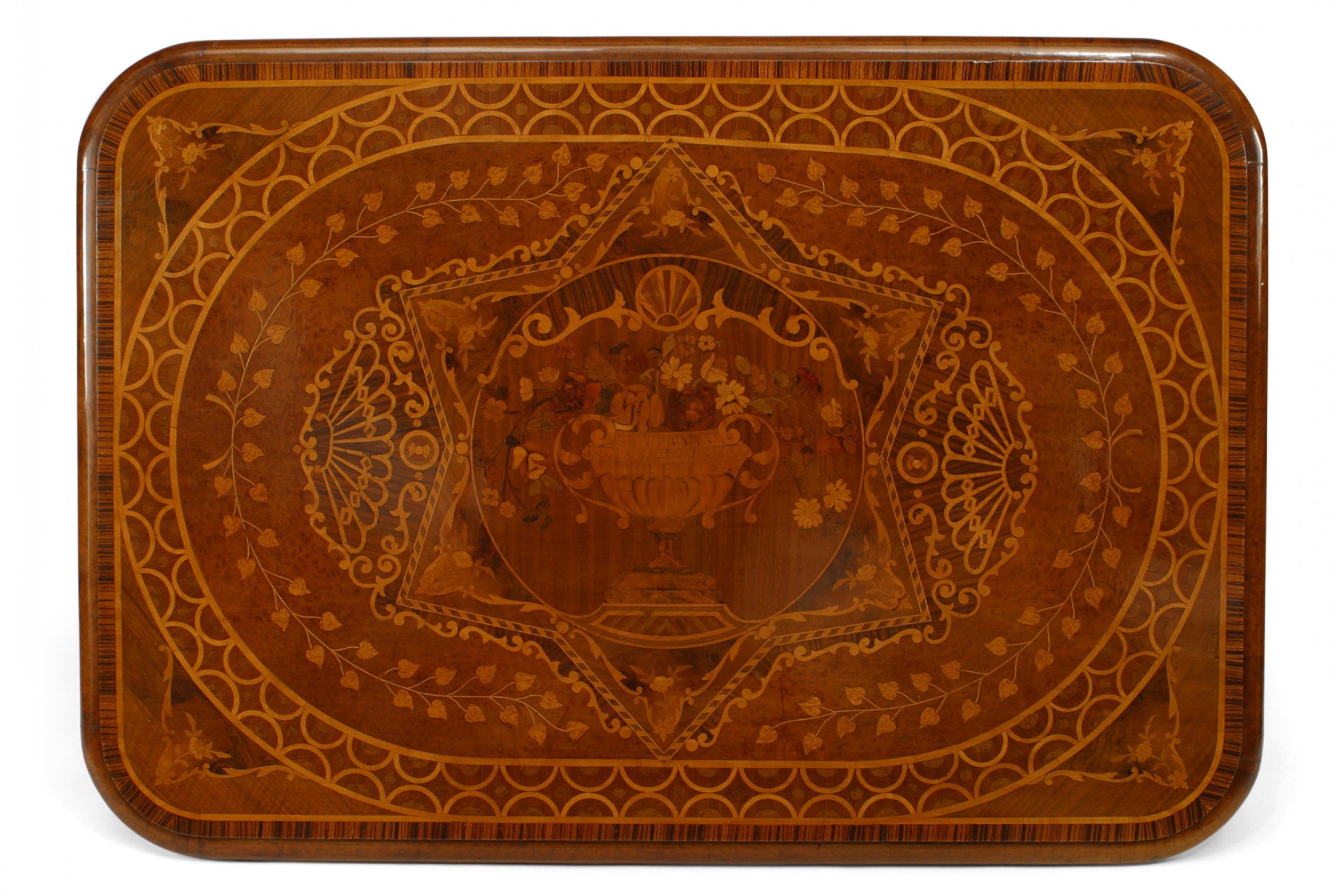 Continental German (circa 1825) rectangular pedestal base center table inlaid with various woods and top with an urn design within a border..