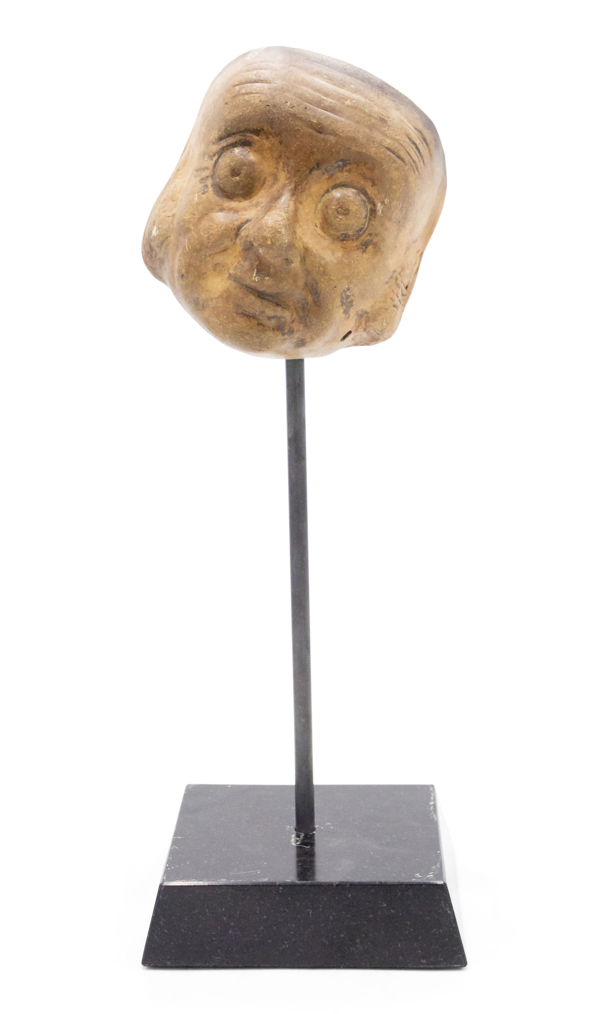 Continental German (late 19th Cent) sculpted terra-cotta master mask mold of a small google-eyed Grotesque face with a slight smile displayed on a square black marble base stand (part of a 39 piece collection).