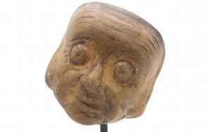 Continental German (late 19th Cent) sculpted terra-cotta master mask mold of a small google-eyed Grotesque face with a slight smile displayed on a square black marble base stand (part of a 39 piece collection)
