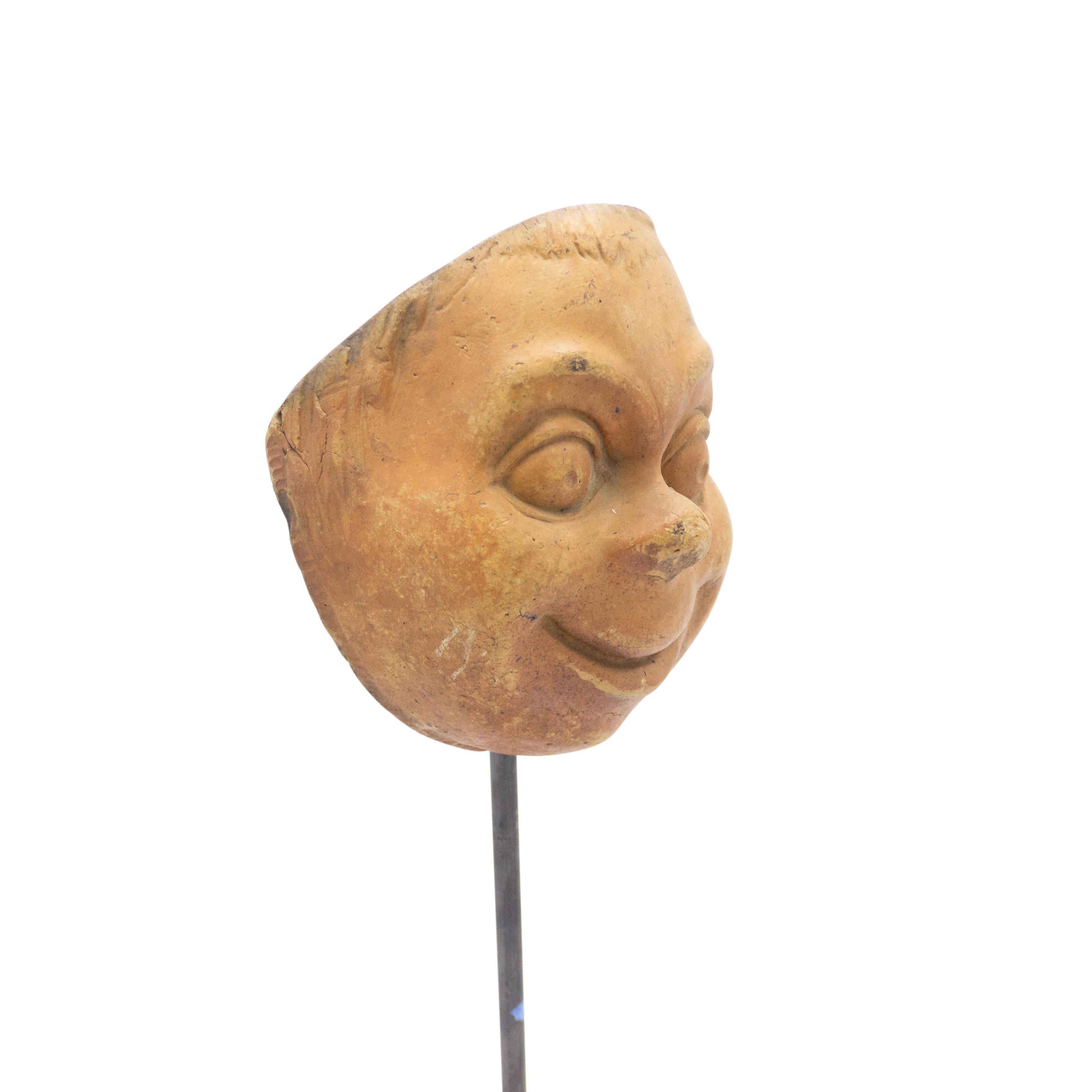 Continental German (late 19th Cent) sculpted terra-cotta master mask mold of a smiling google-eyed Grotesque face displayed on a square black marble base stand (part of a collection).