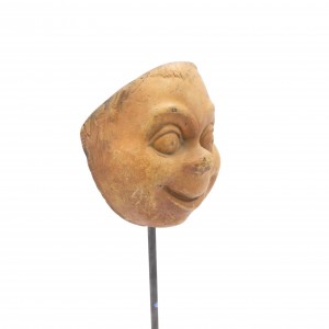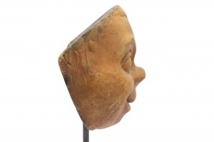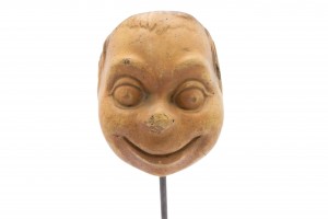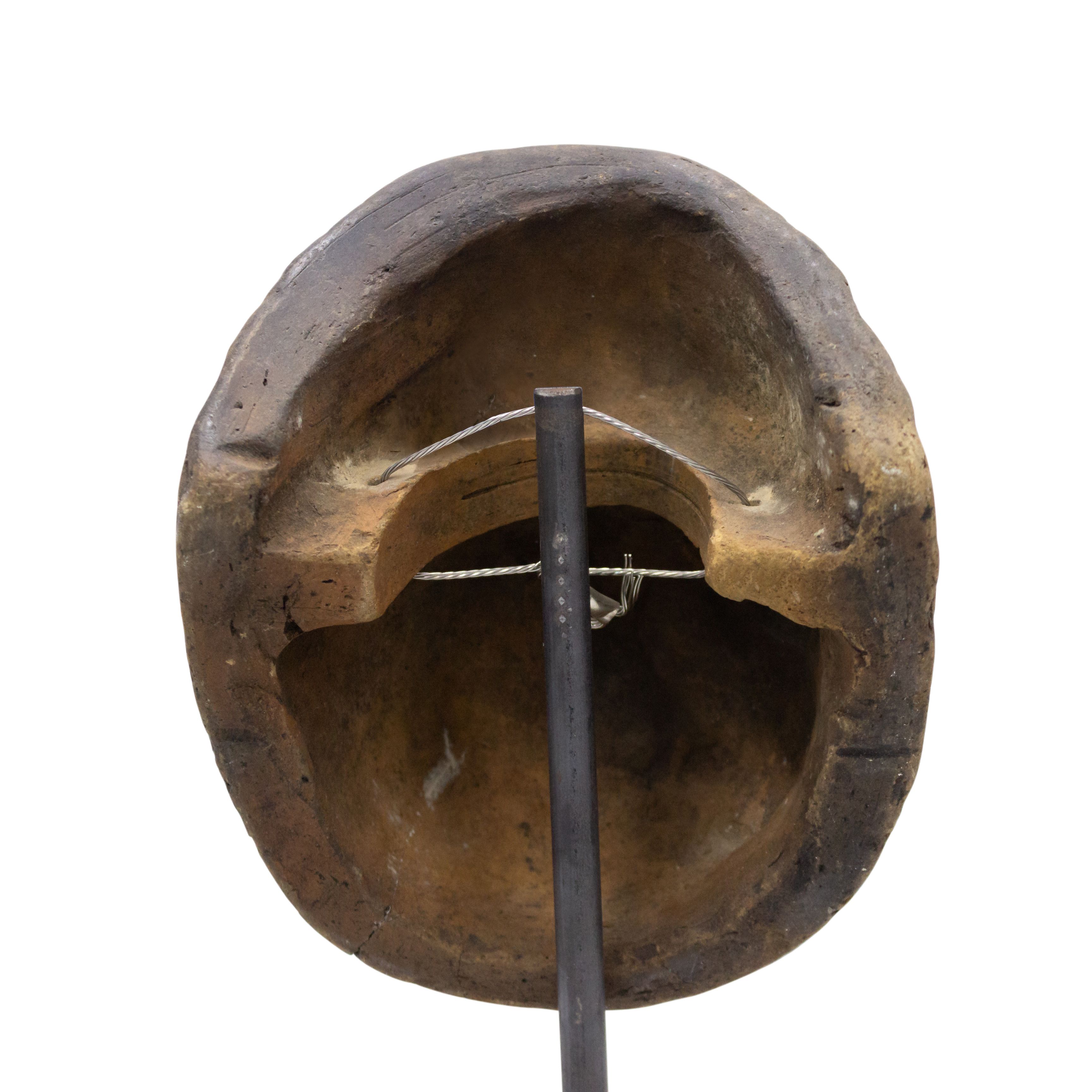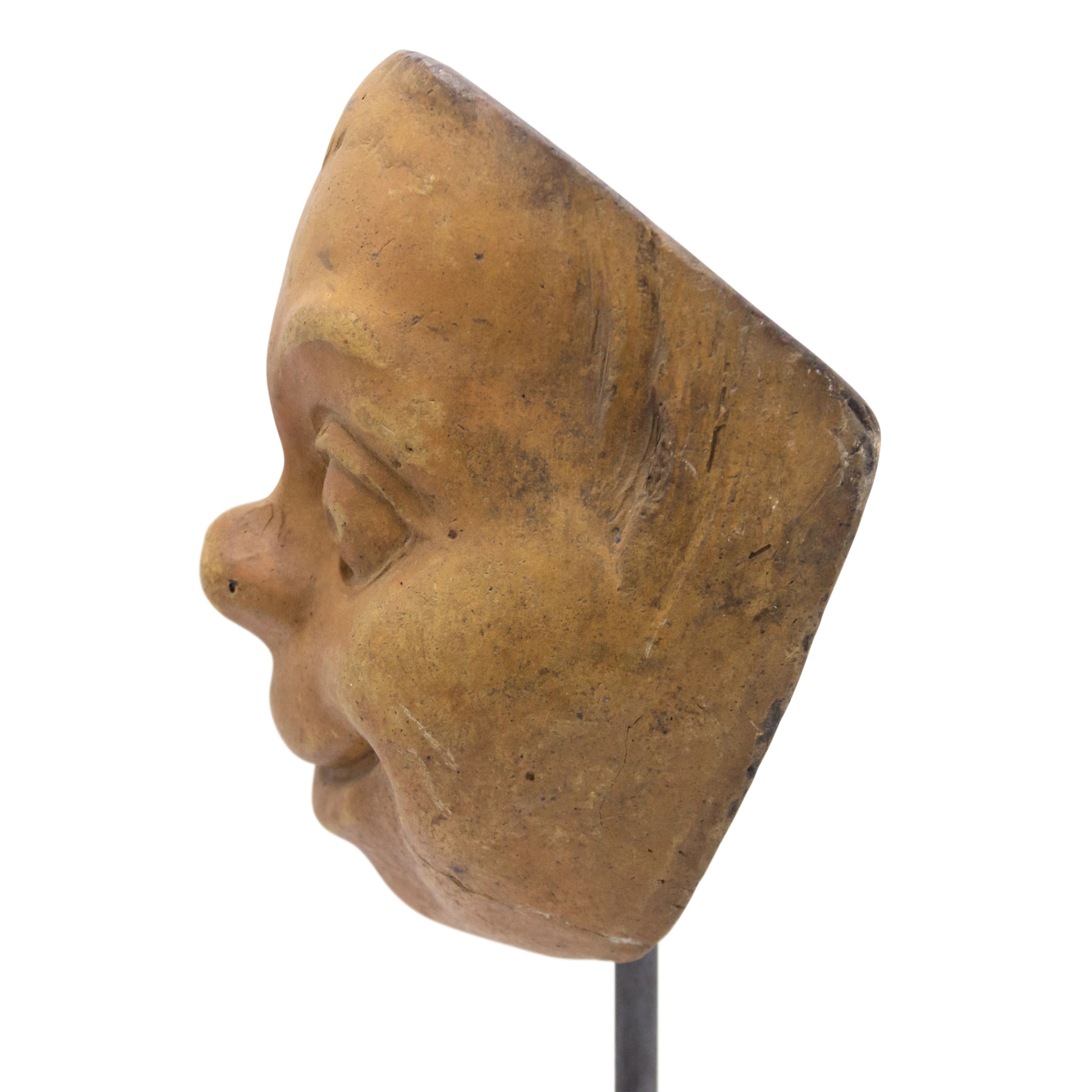 Continental German (late 19th Cent) sculpted terra-cotta master mask mold of a smiling google-eyed Grotesque face displayed on a square black marble base stand (part of a collection)