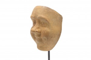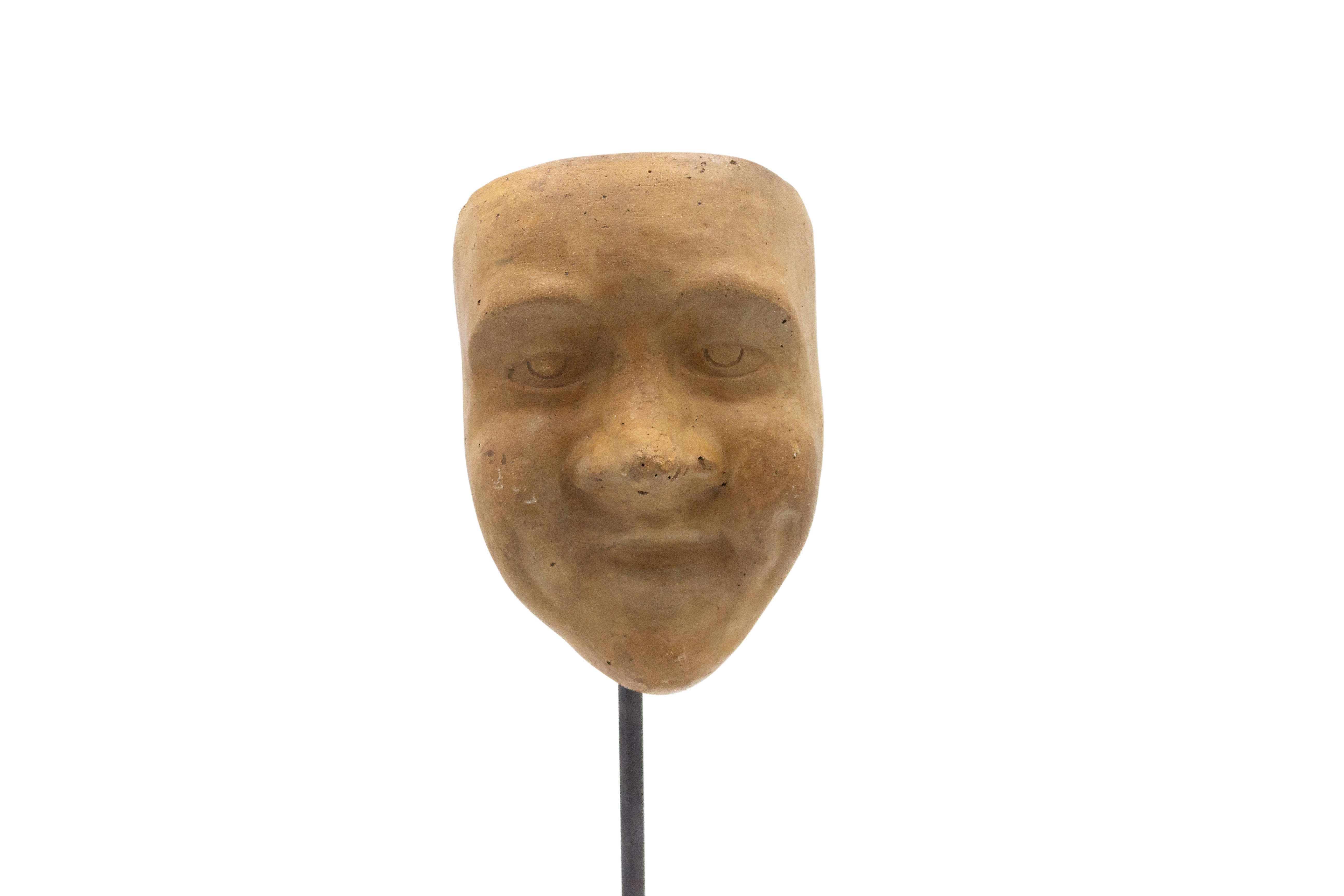 Continental German (late 19th Cent) sculpted terra-cotta master mask mold of a face with pudgy cheeks displayed on a square black marble base stand (part of a collection).