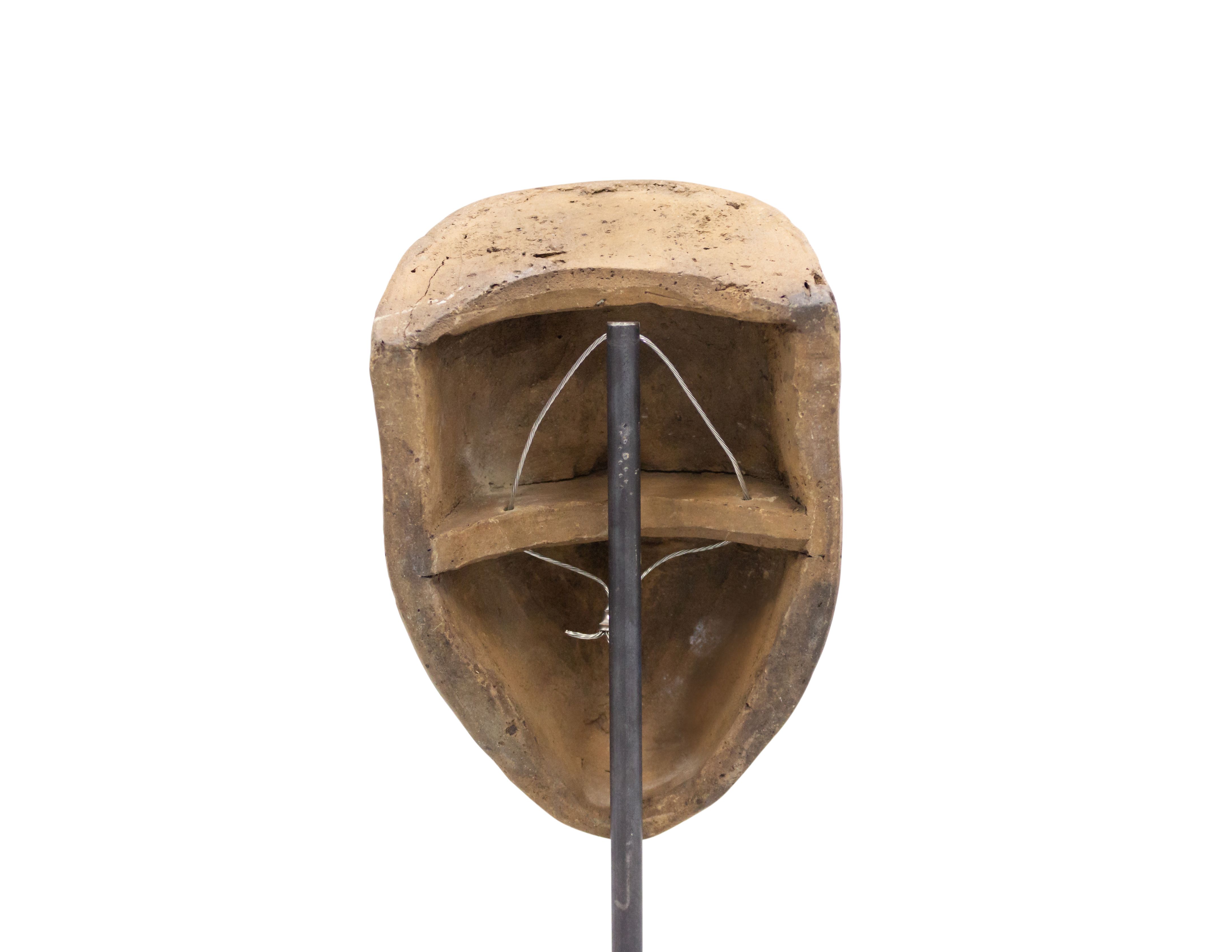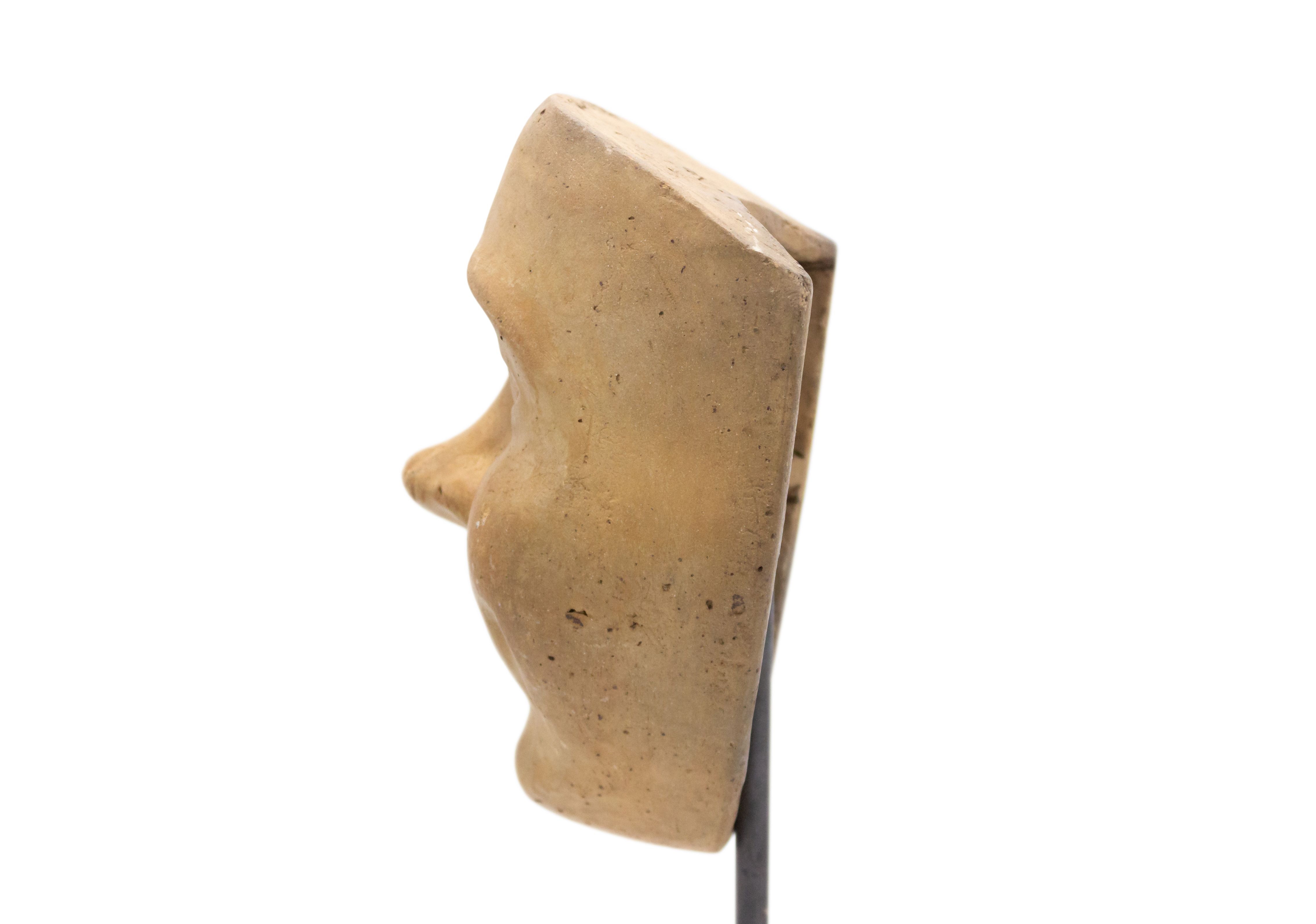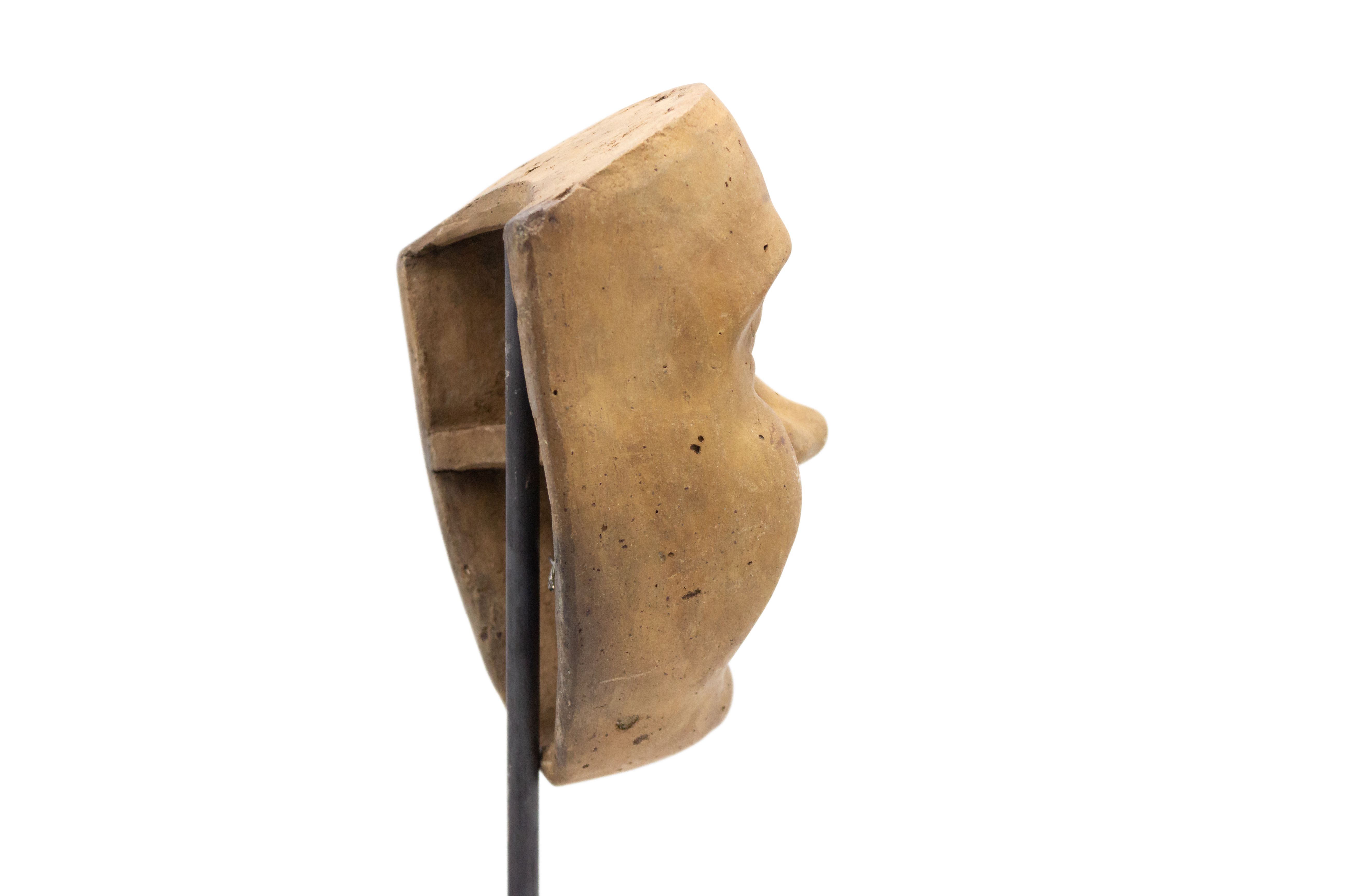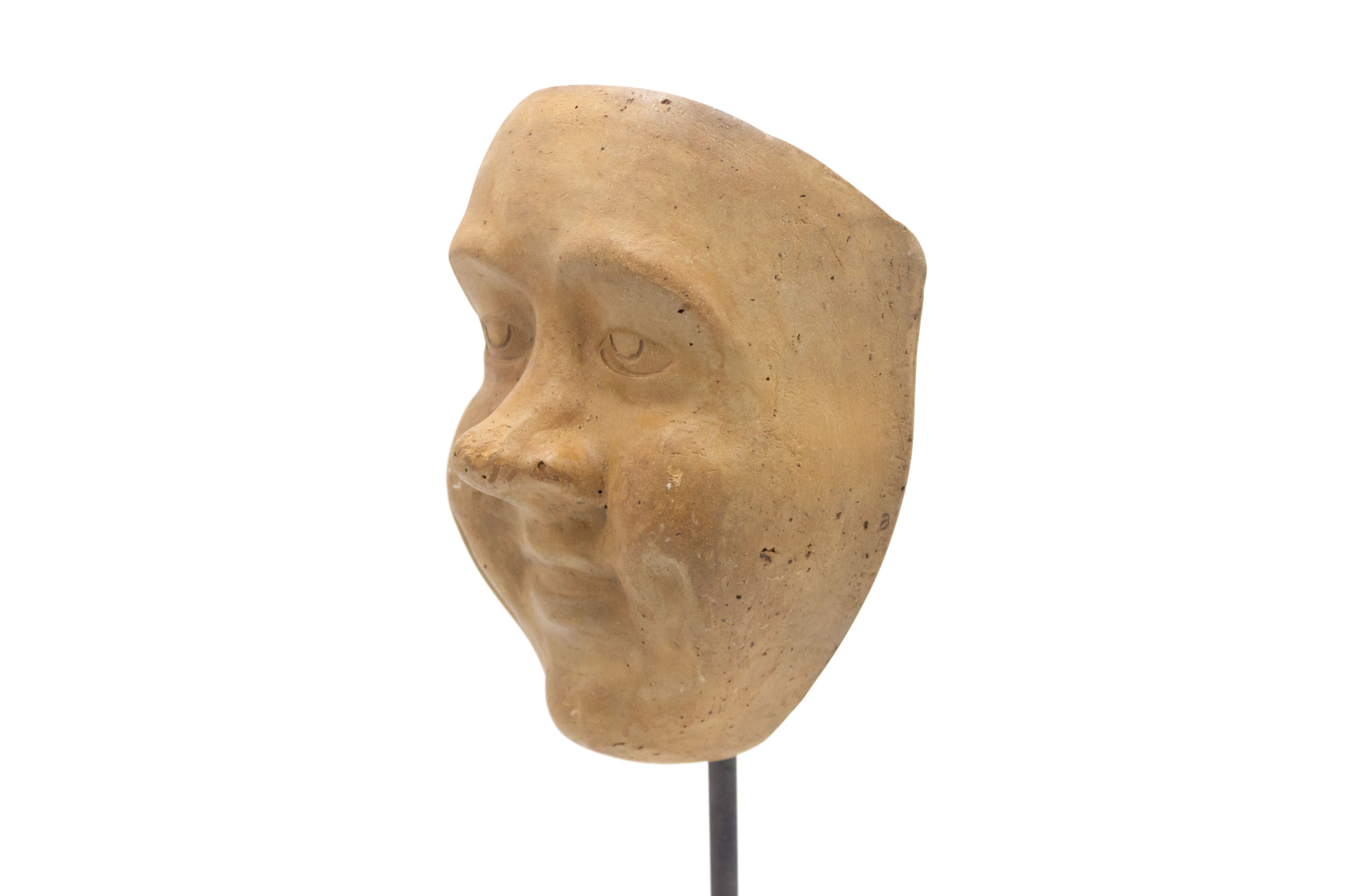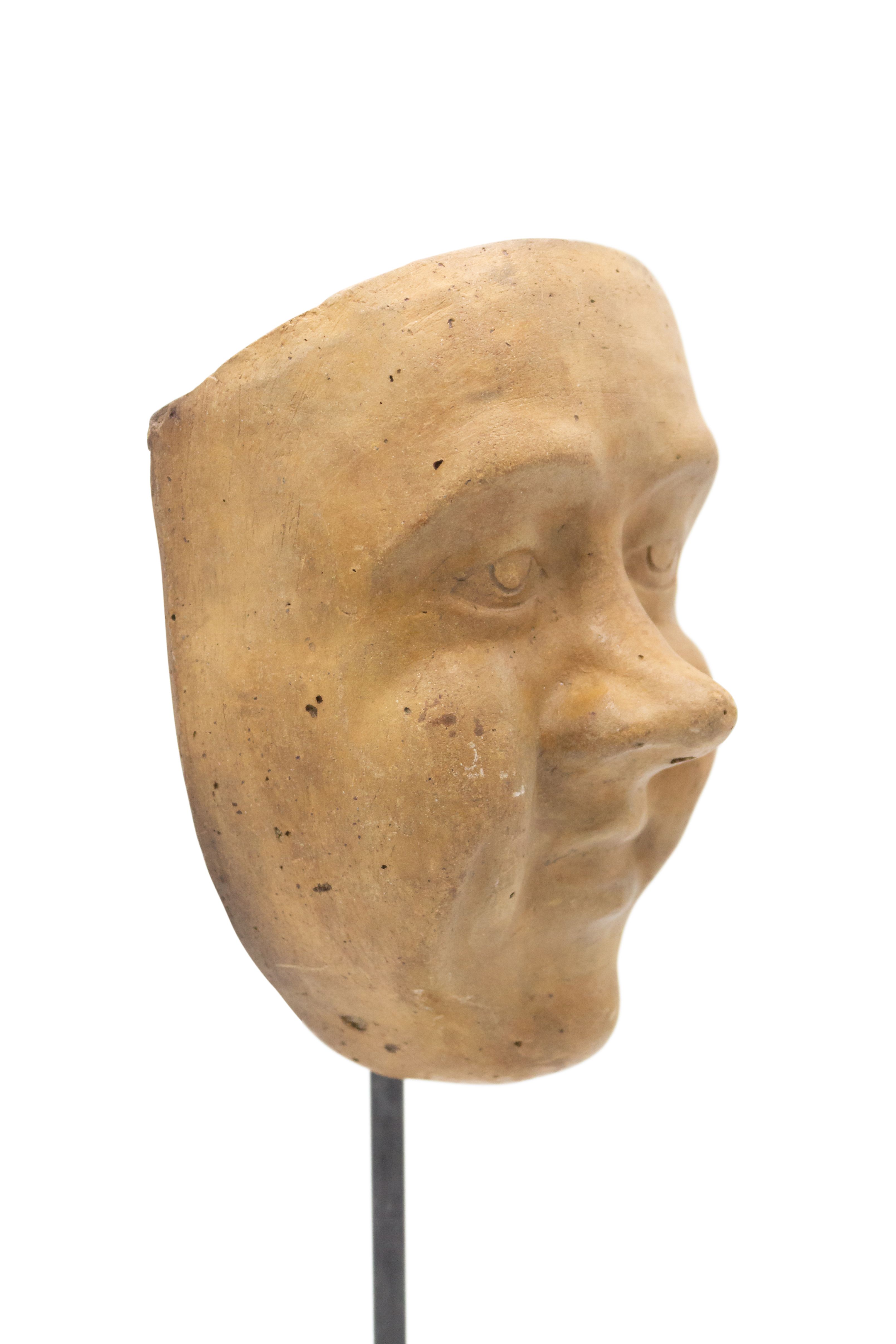 Continental German (late 19th Cent) sculpted terra-cotta master mask mold of a face with pudgy cheeks displayed on a square black marble base stand (part of a collection)