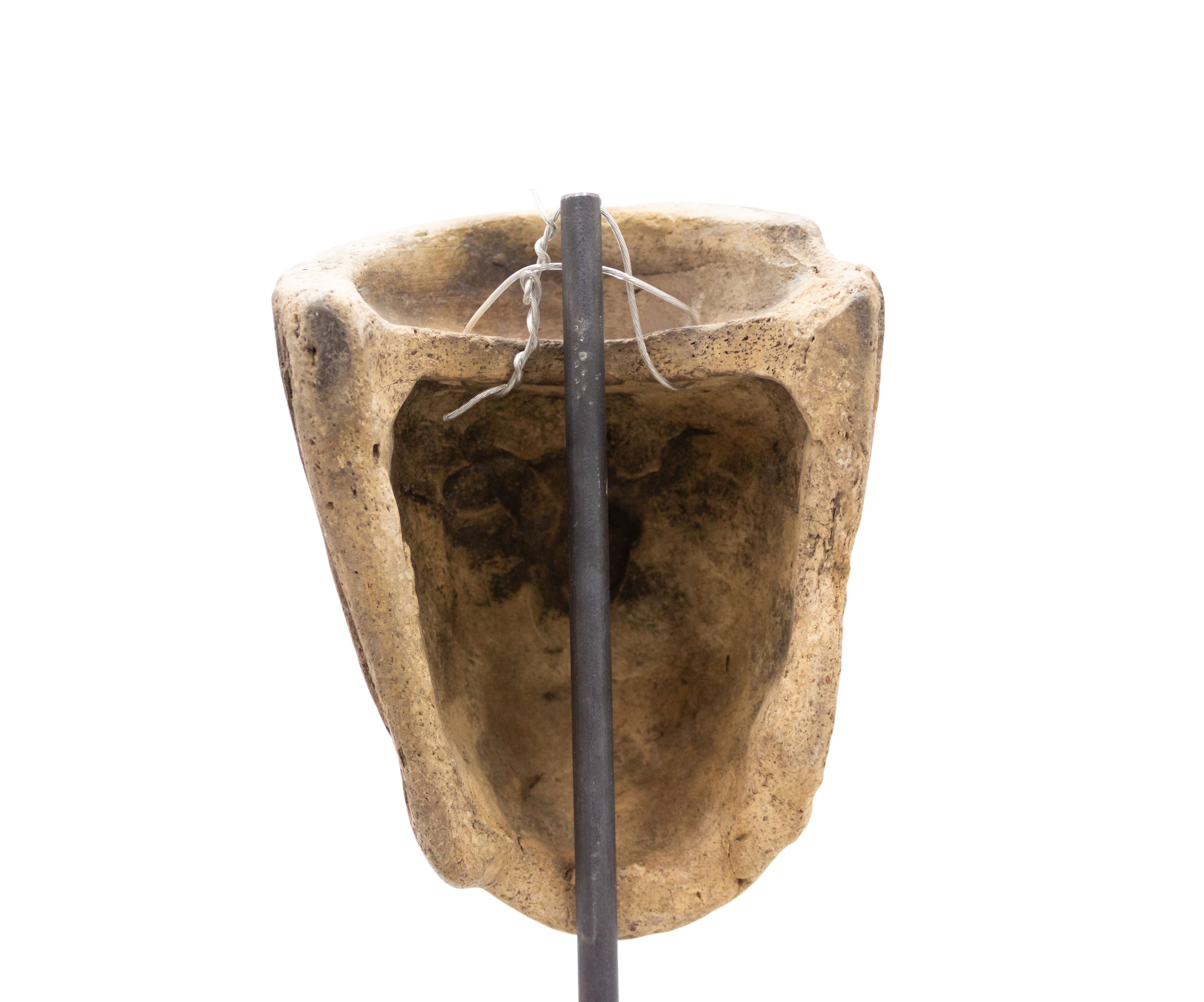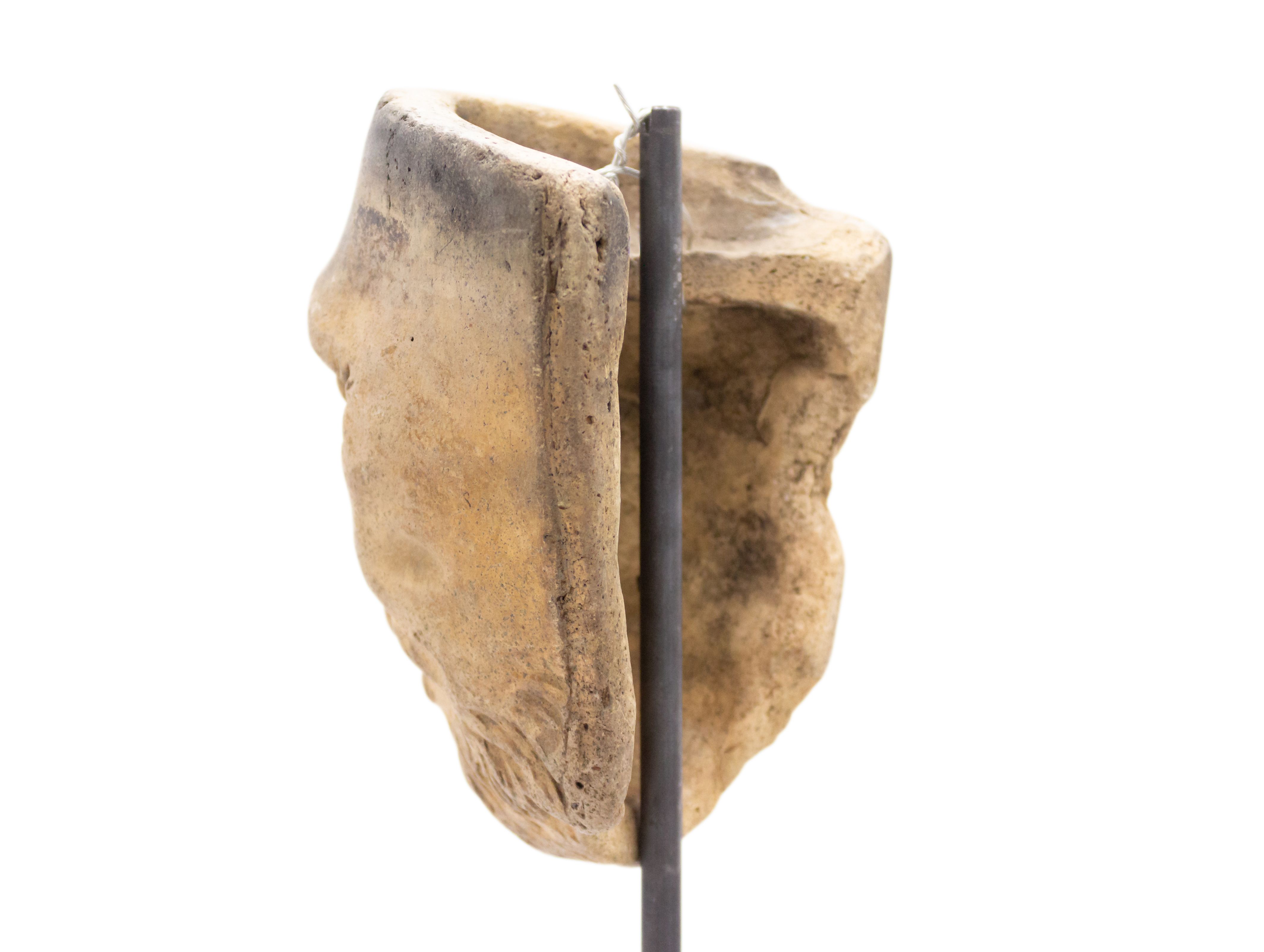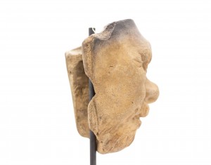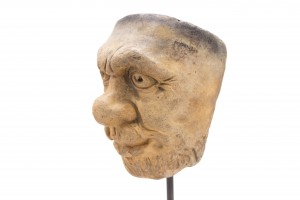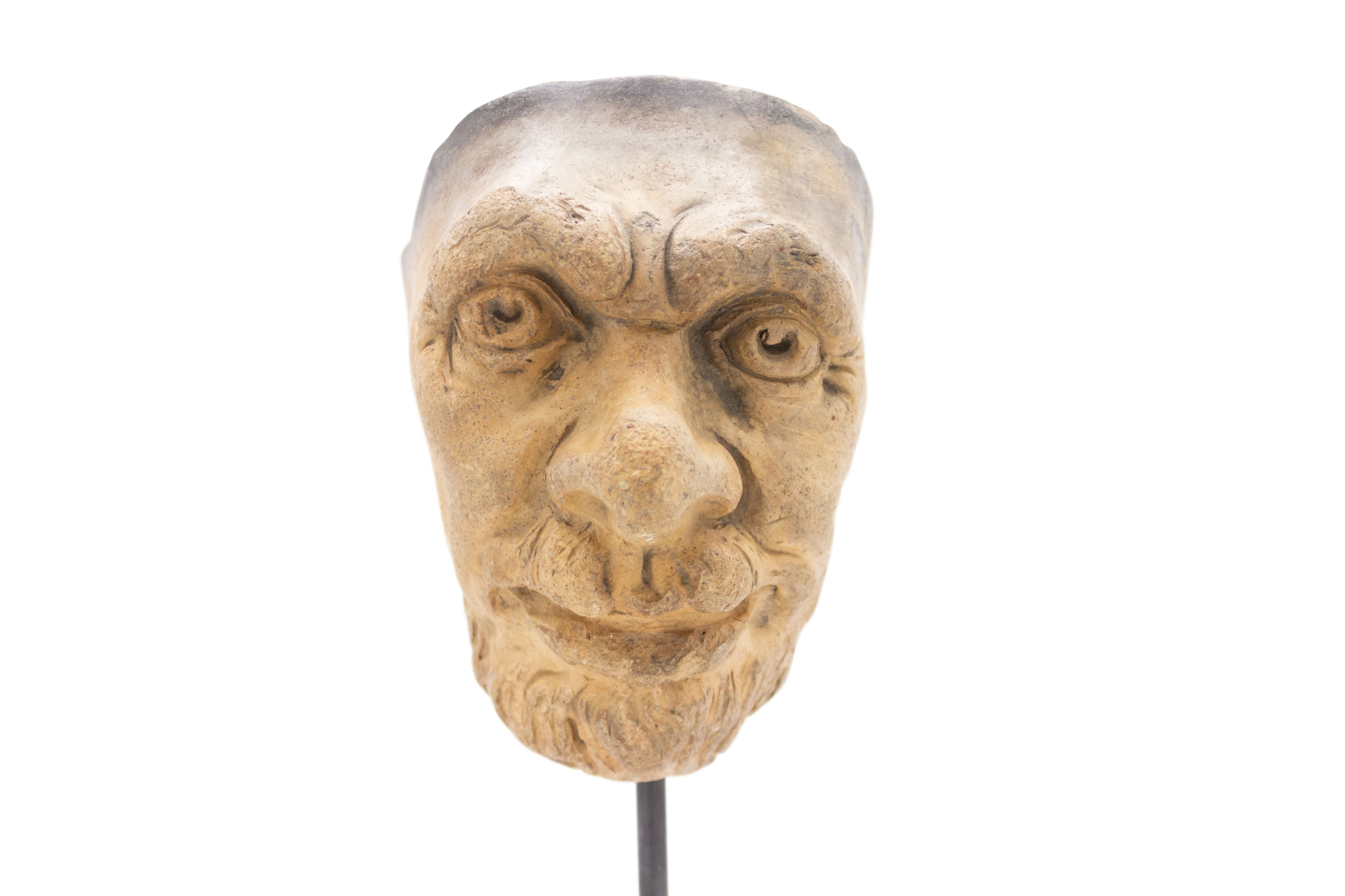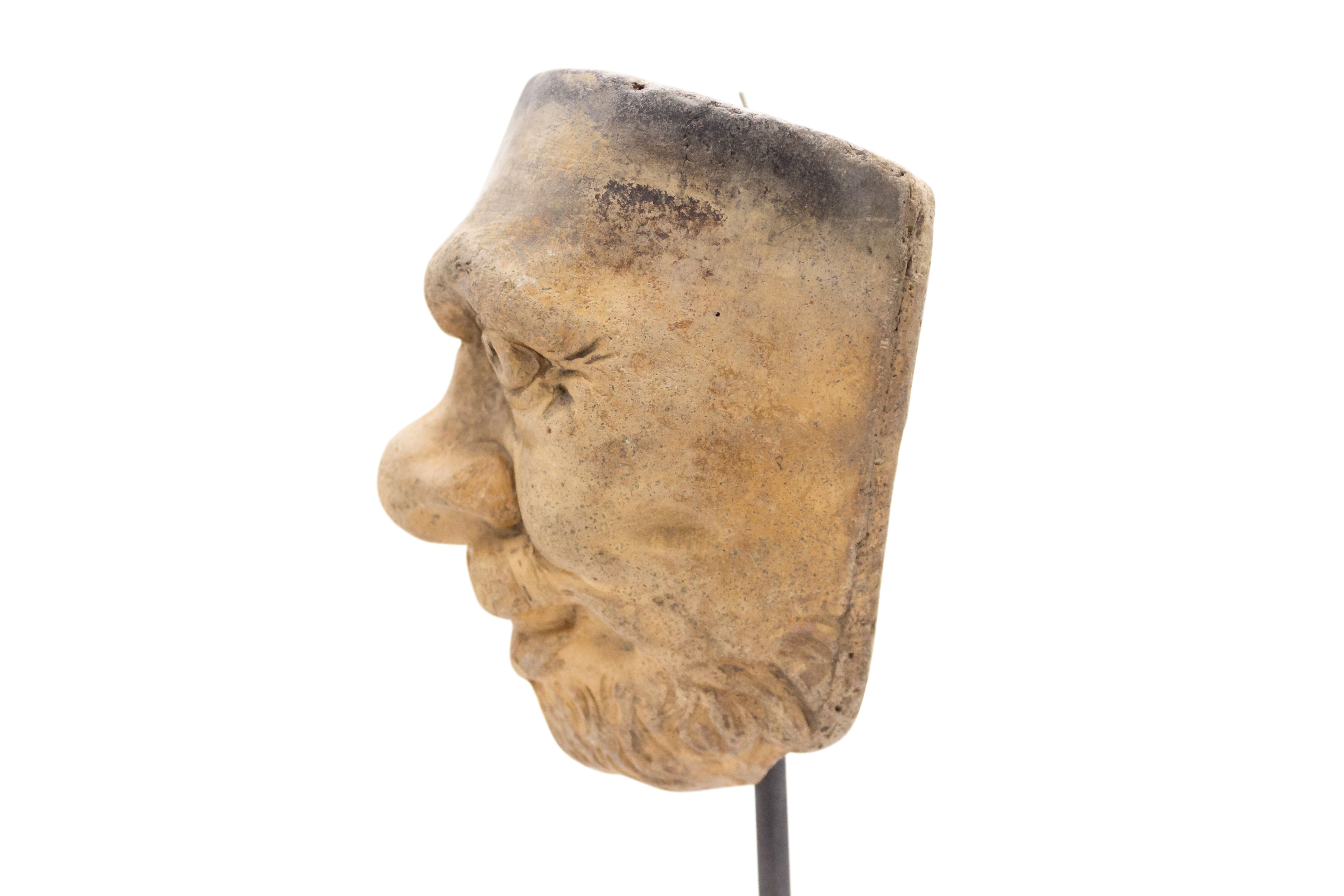 Continental German (late 19th Cent) sculpted terra-cotta master mask mold of a bearded old man with furrowed brow displayed on a square black marble base stand (part of a collection)