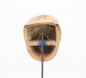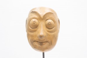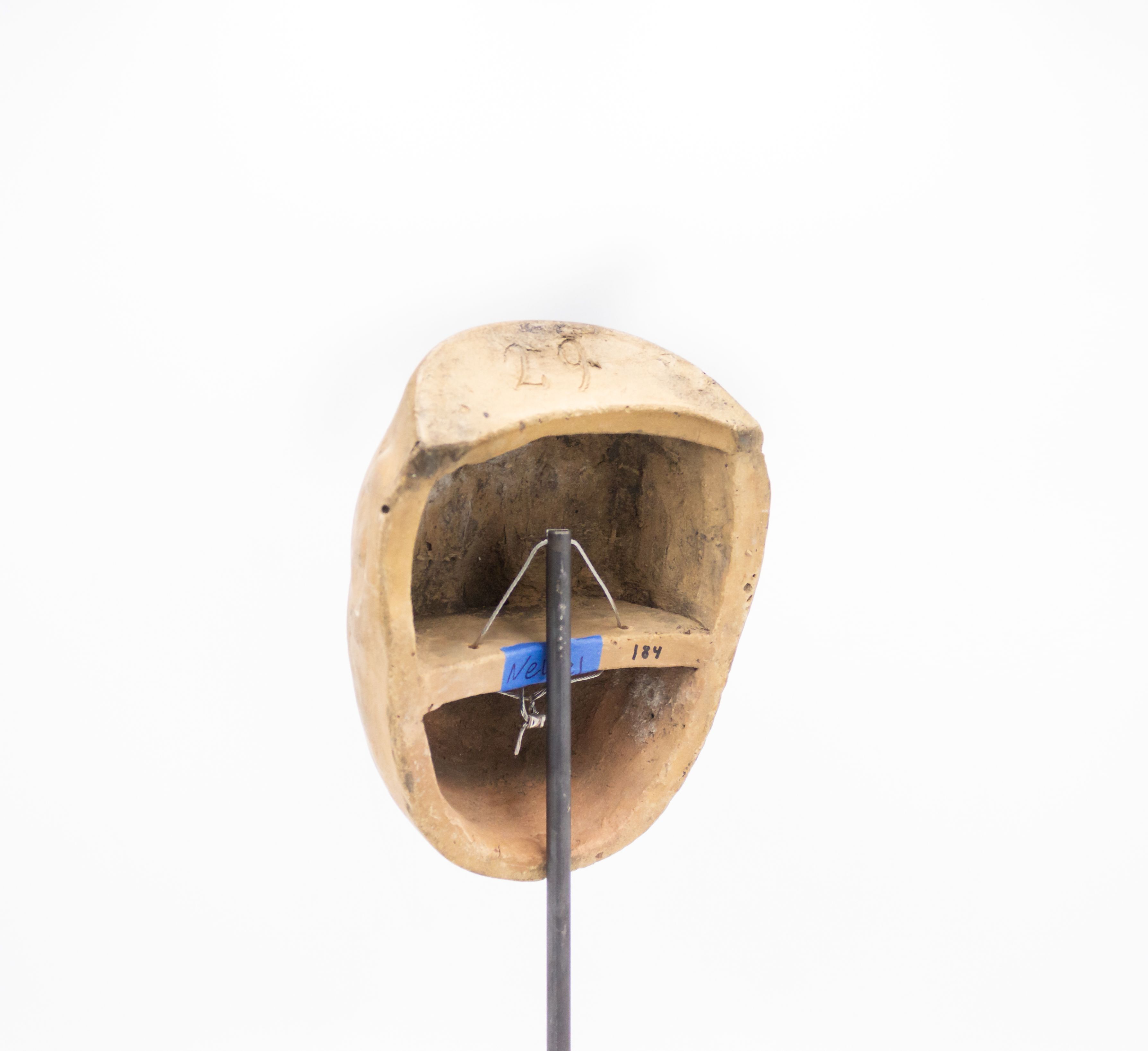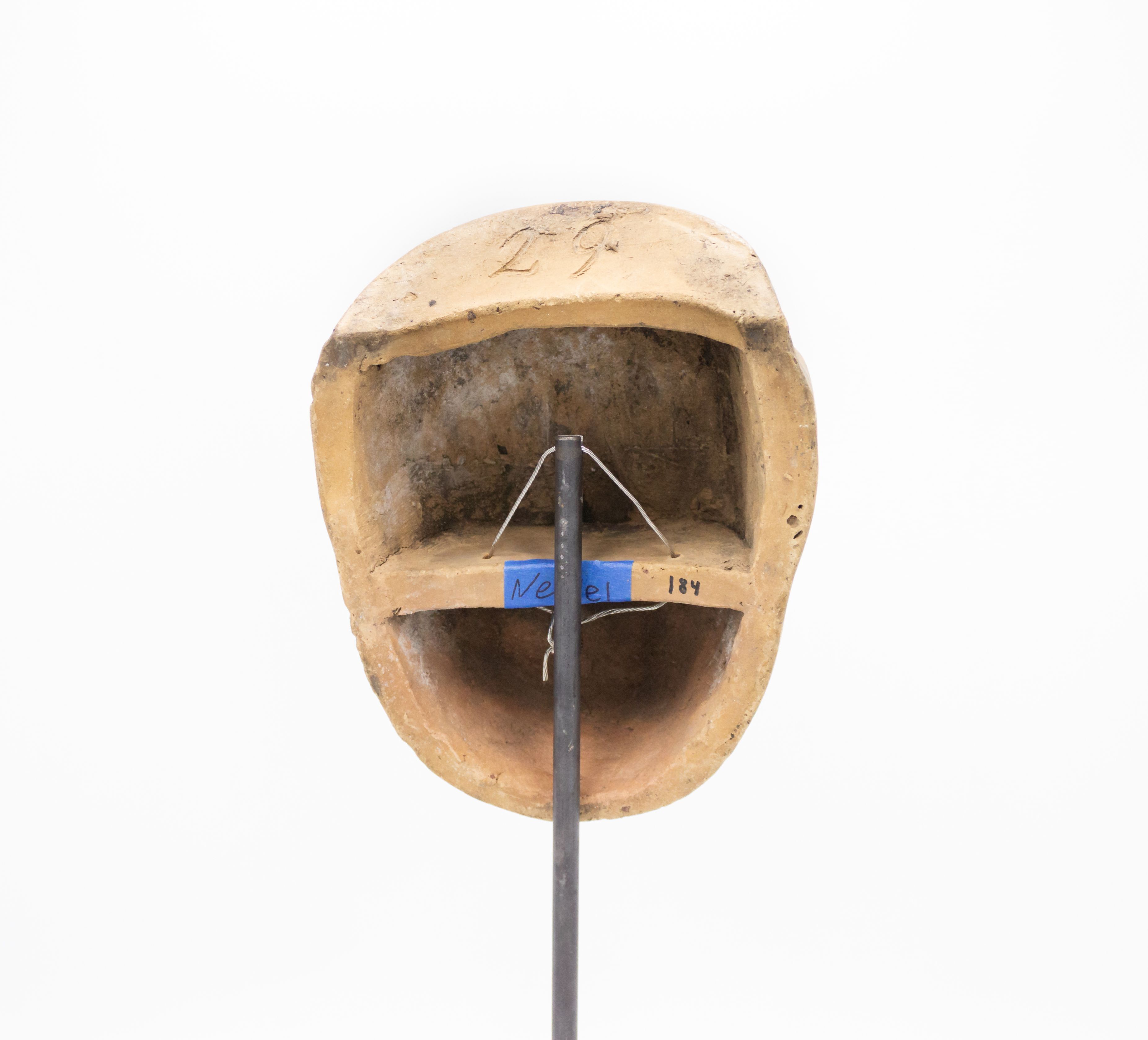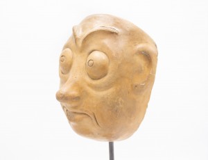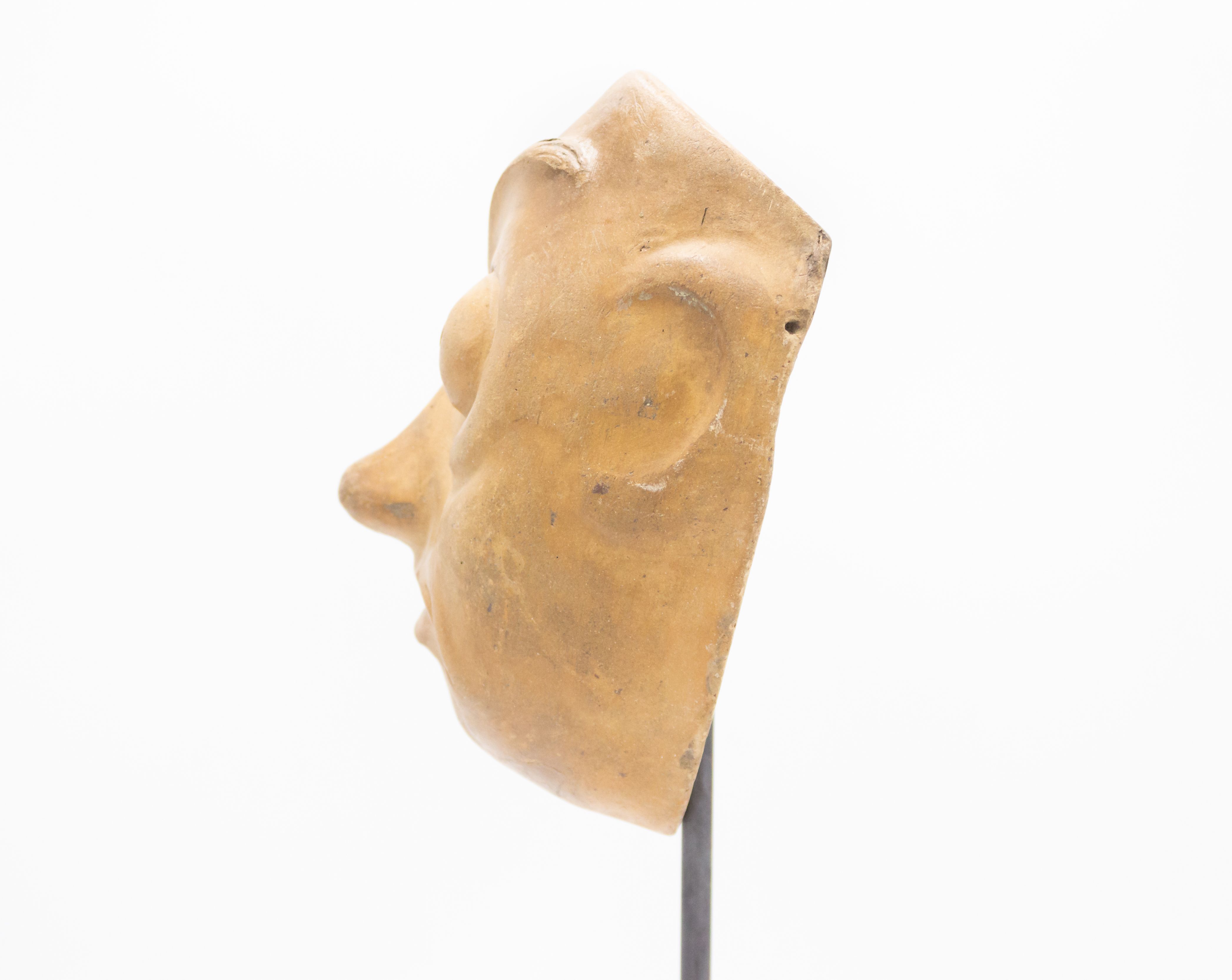 Continental German (late 19th Cent) sculpted terra-cotta master mask mold of a large google0eyed frowning Grotesque face displayed on a square black marble base stand (part of a collection).