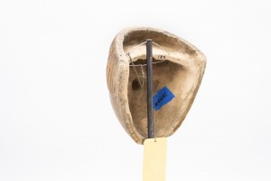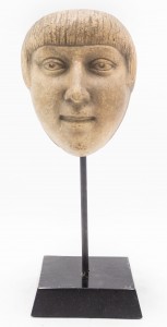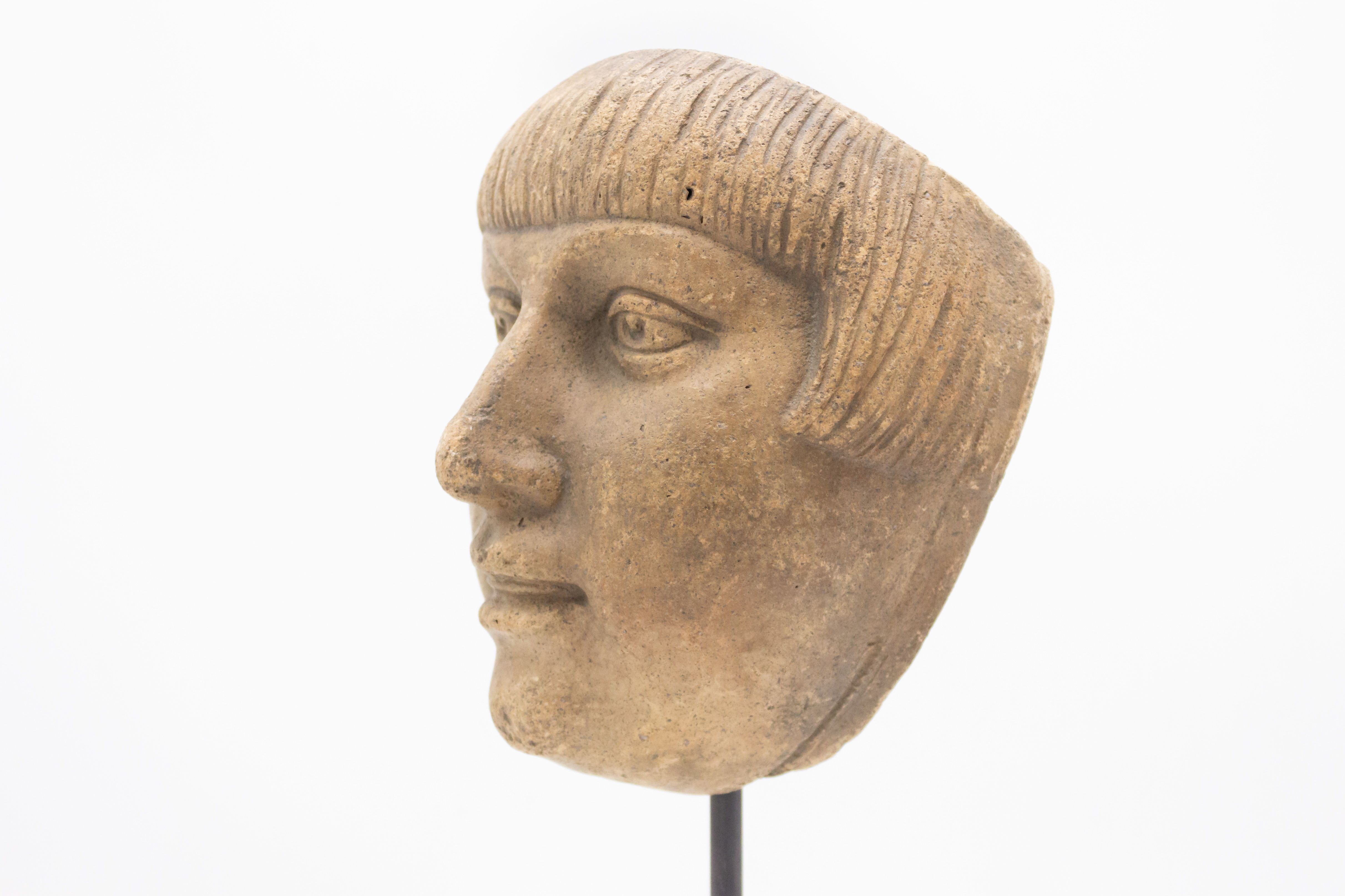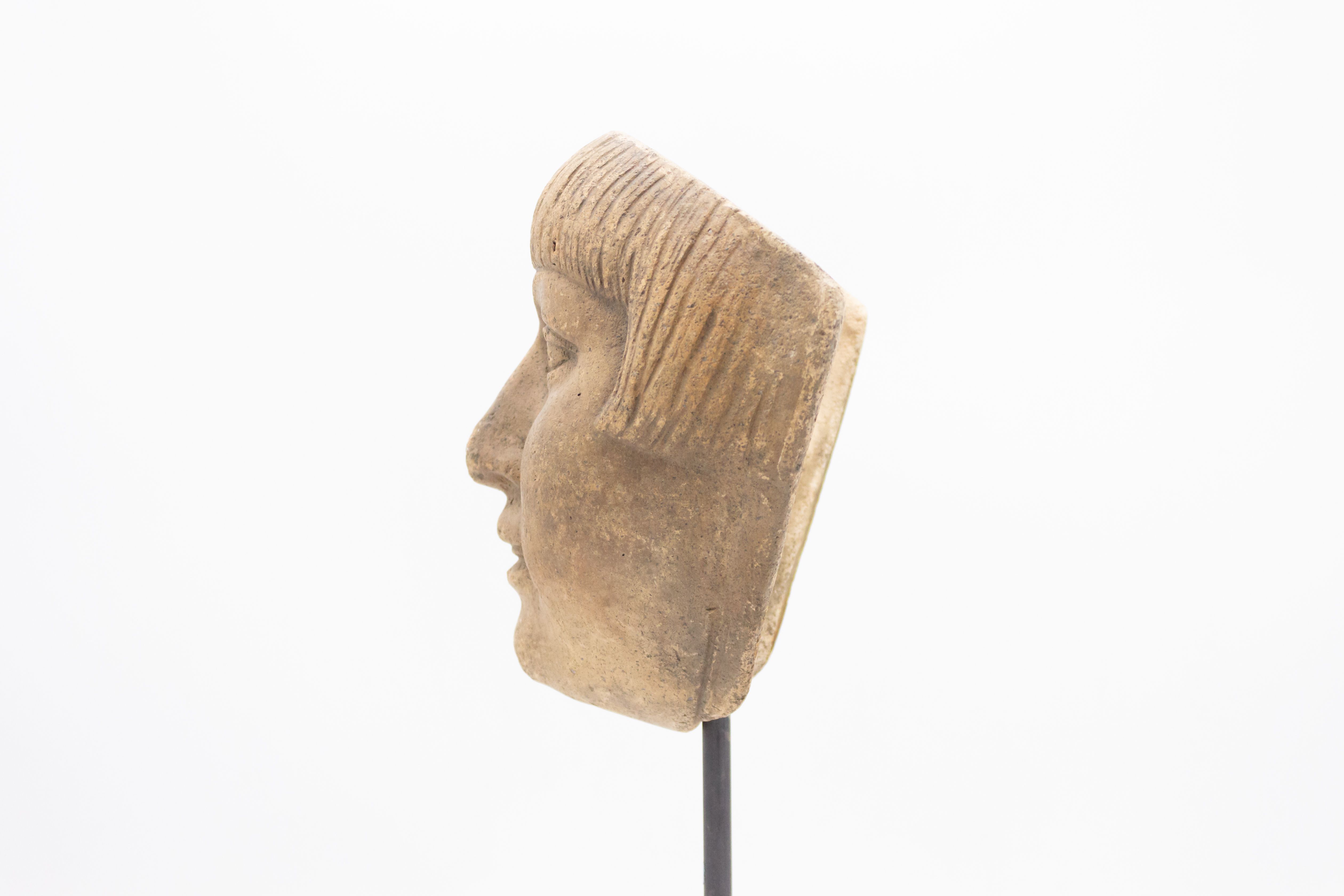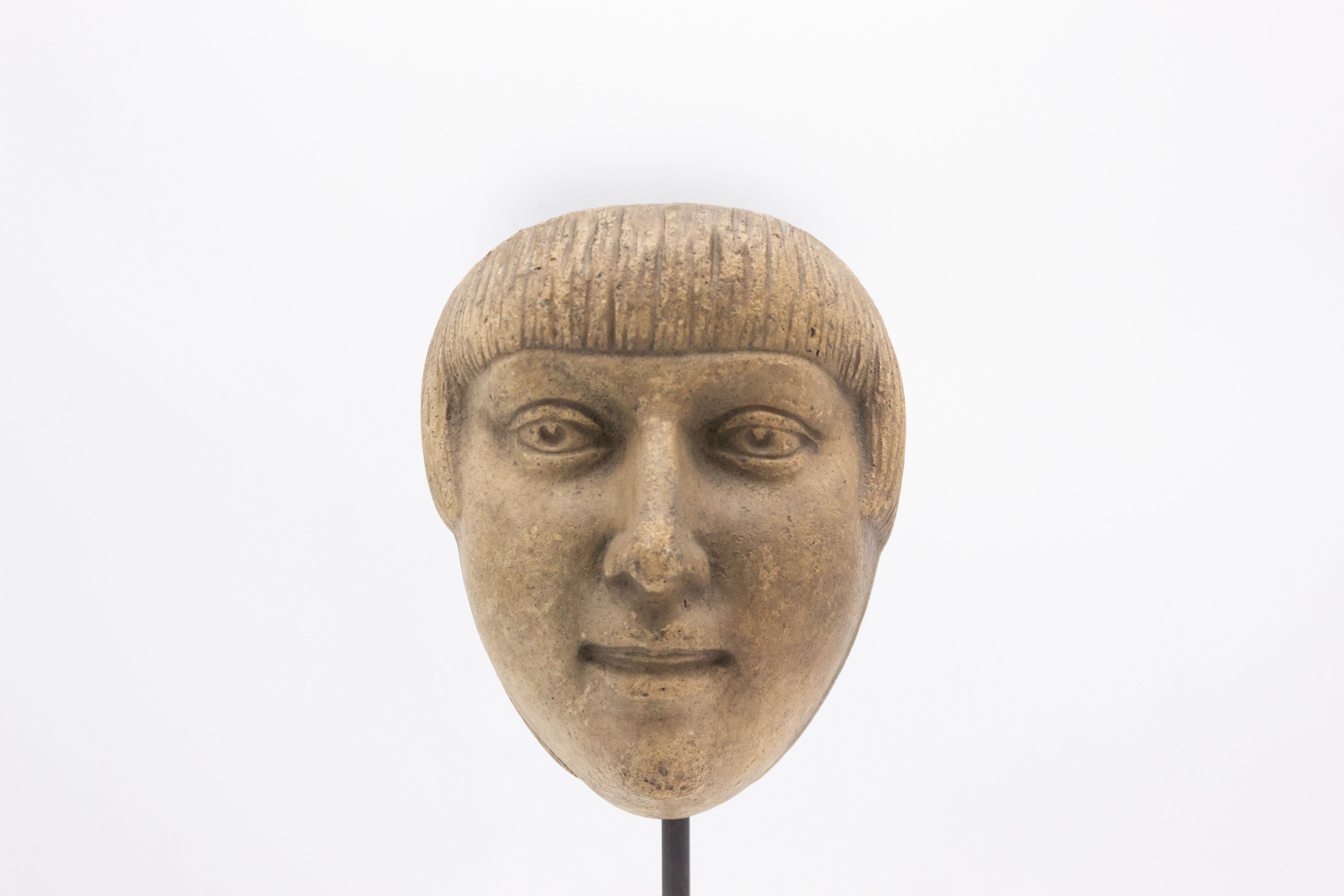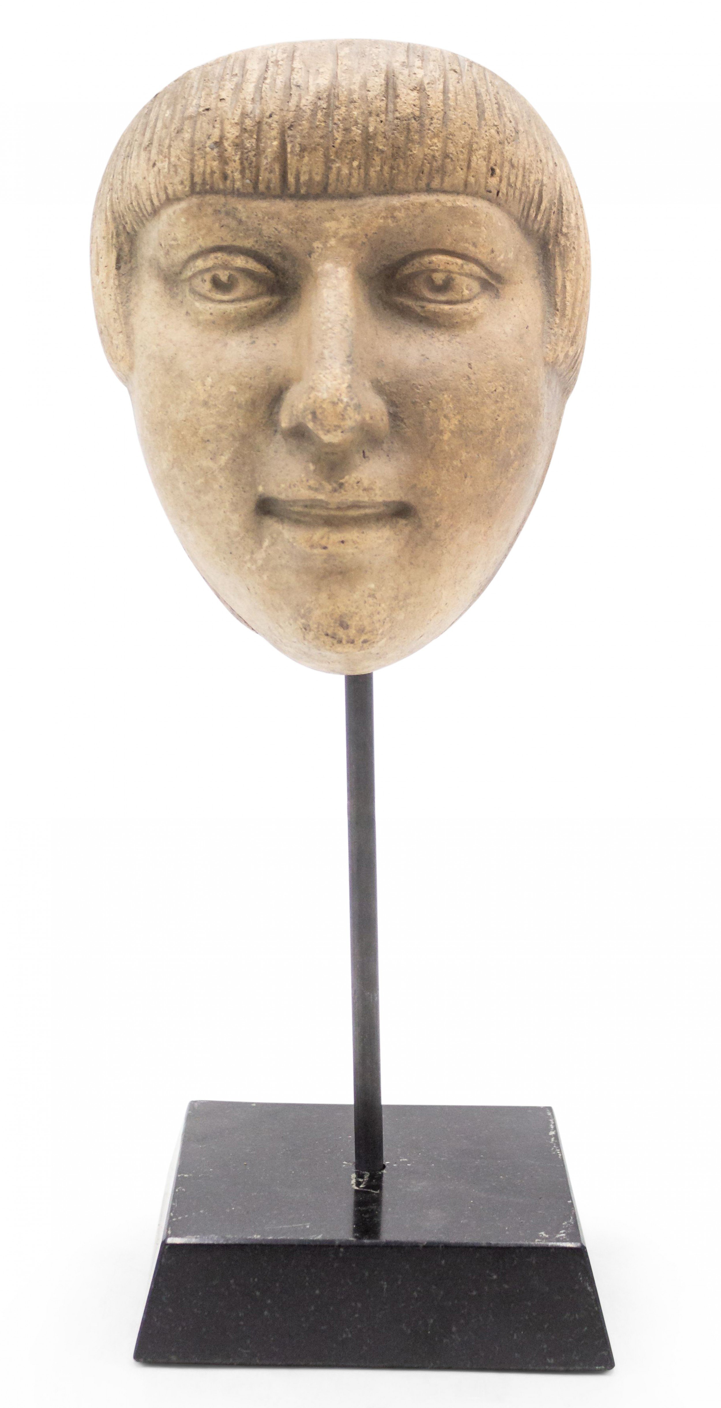 Continental German (late 19th Cent) sculpted terra-cotta master mask mold of a smiling male face with a "Dutch-Boy" haircut displayed on a square black marble base stand (part of 39 piece collection)