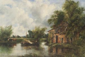 Continental landscape oil painting of a pastoral mill scene in a carved gilt wood frame.