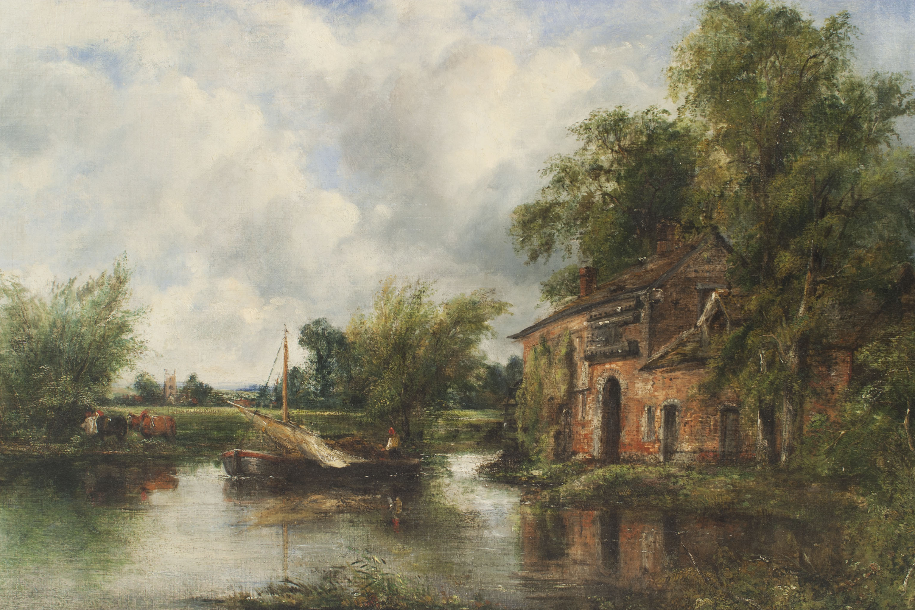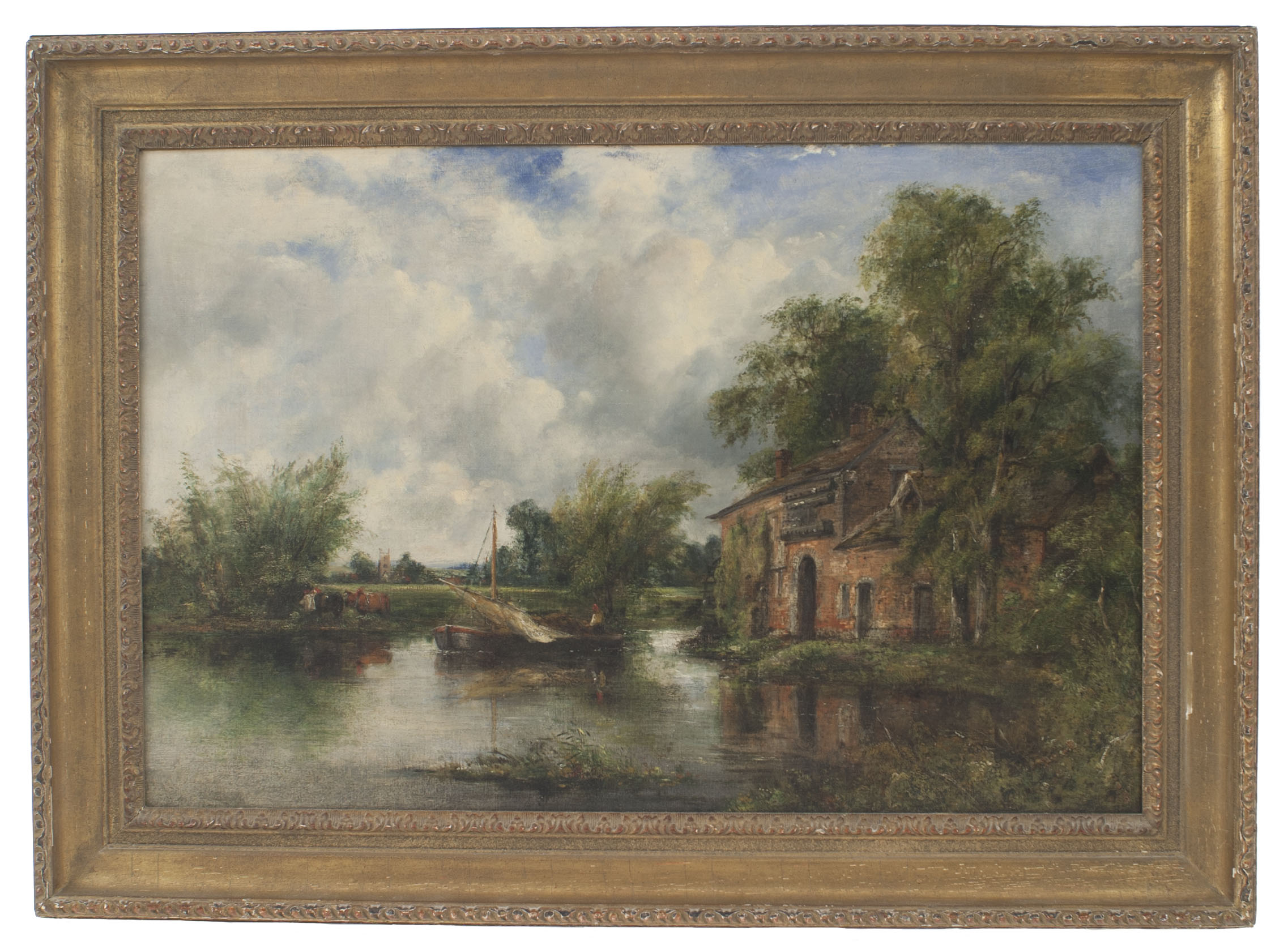 Continental landscape oil painting of a pastoral mill scene in a carved gilt wood frame
