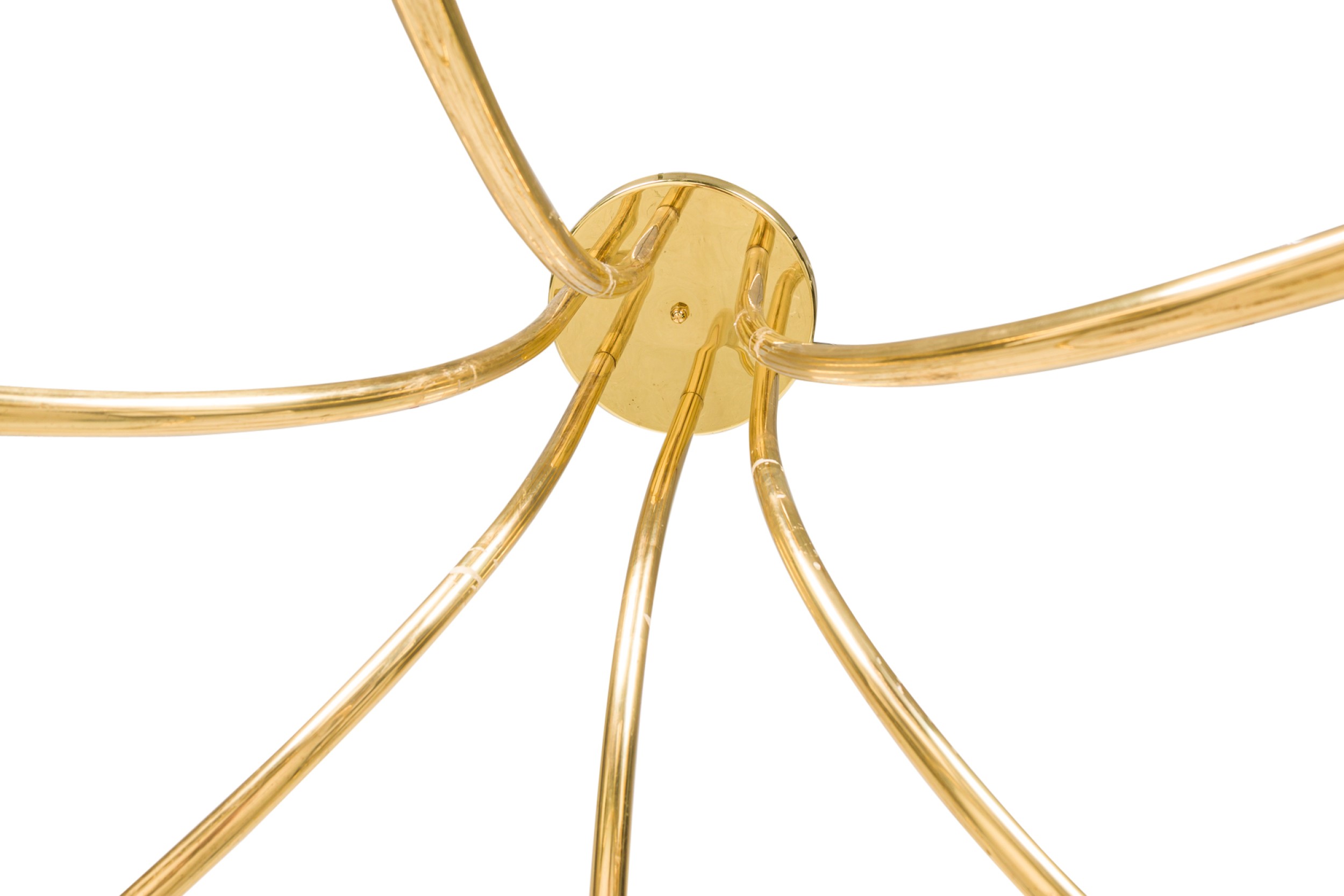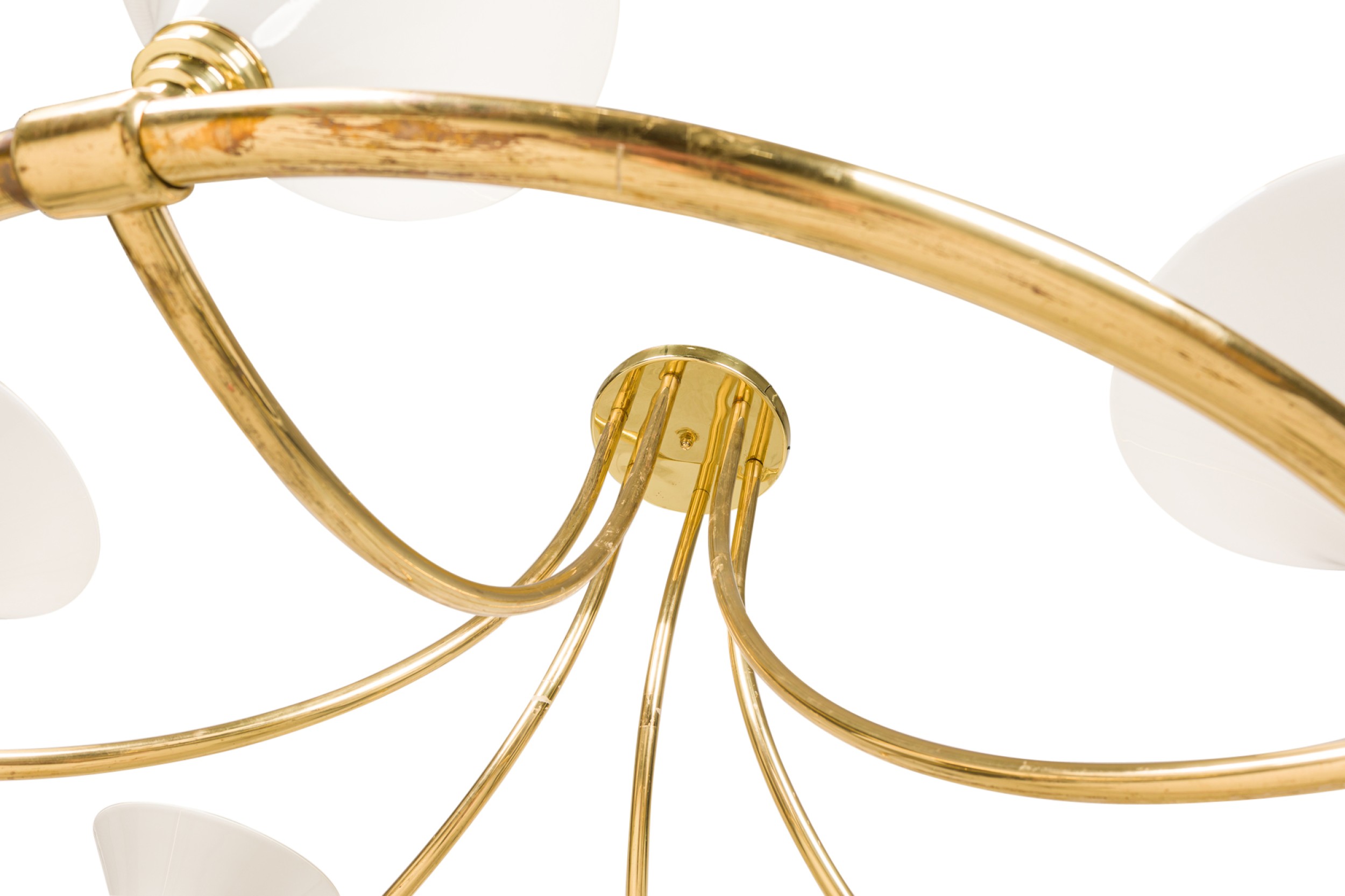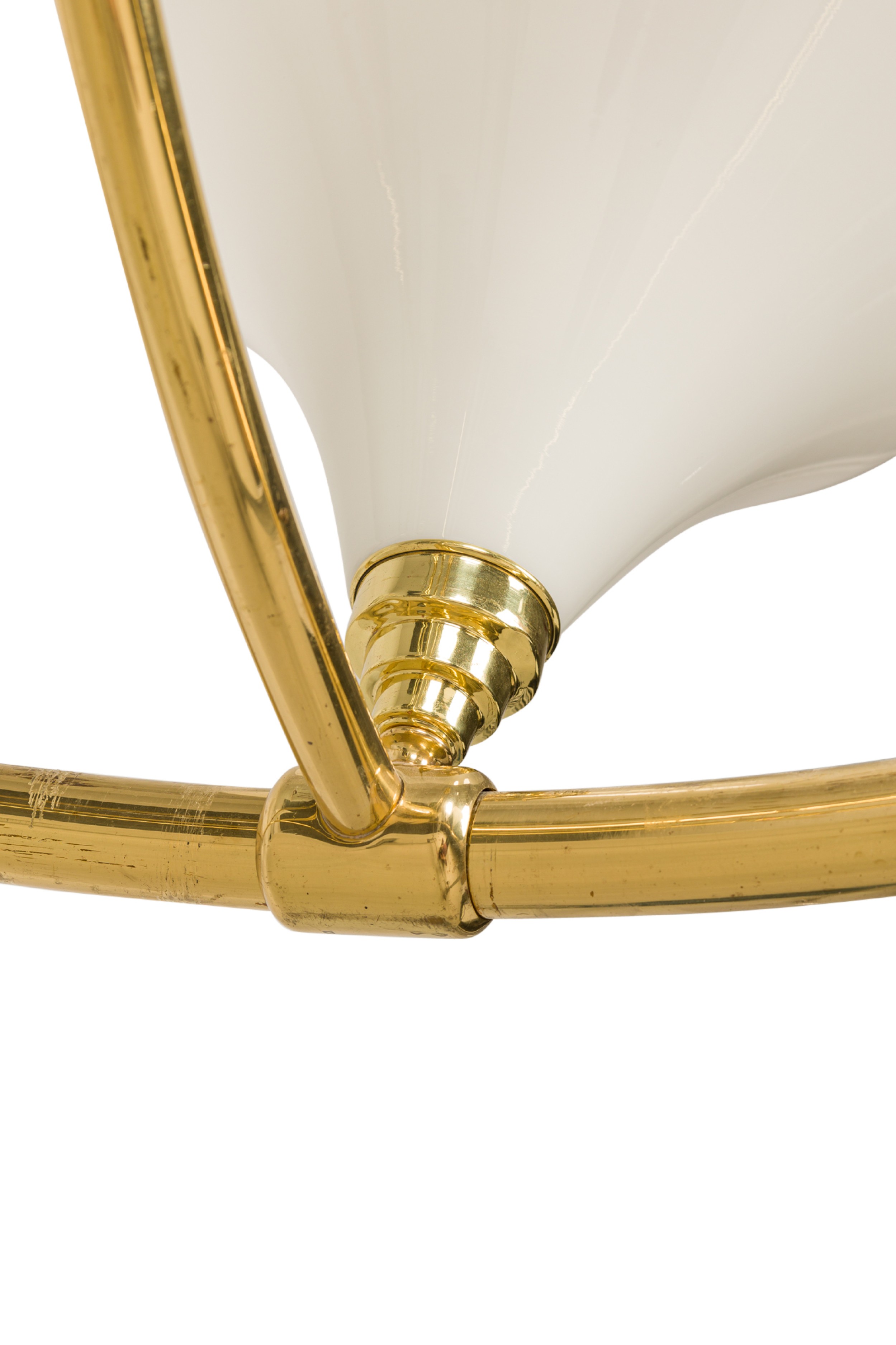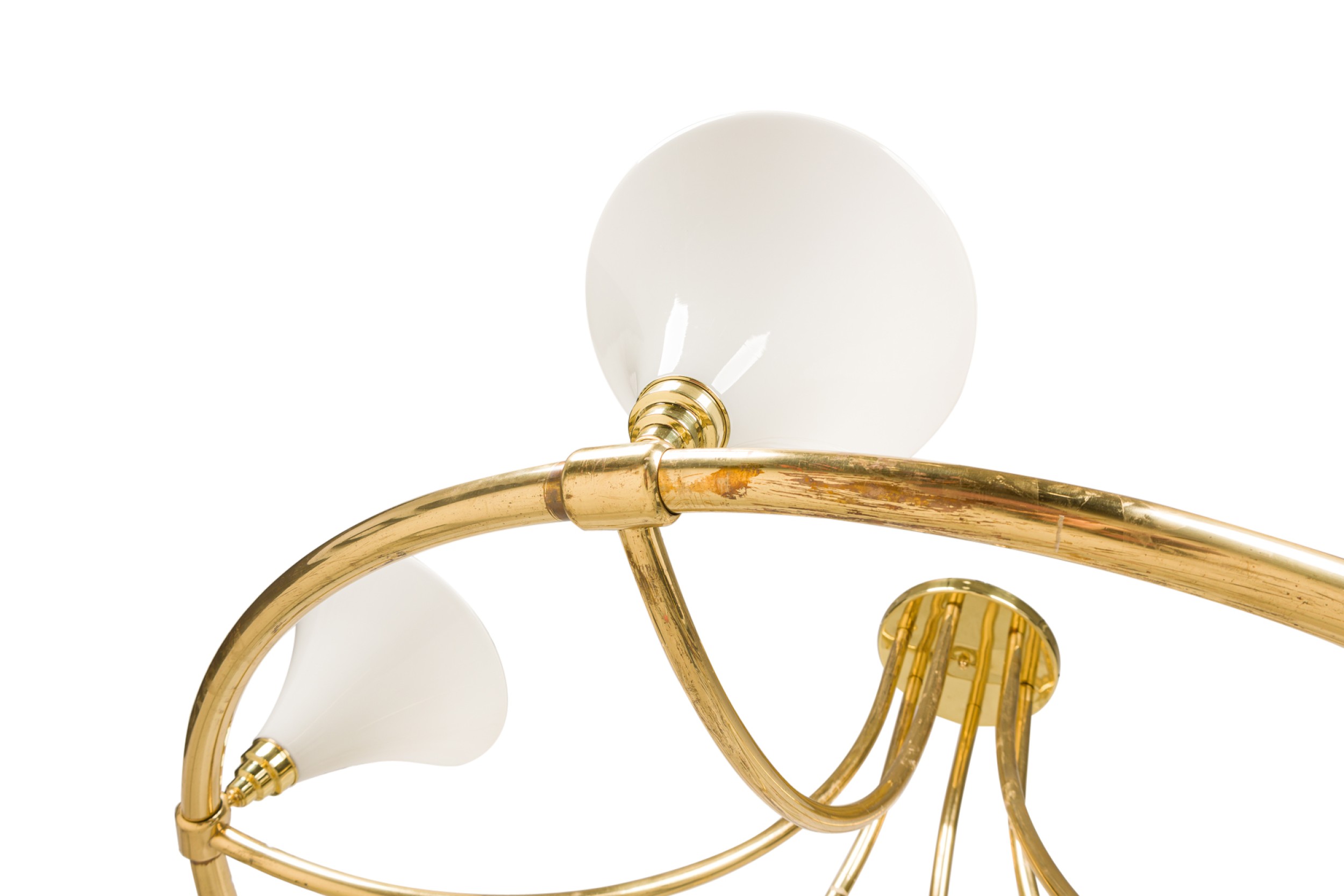 Continental Mid-Century monumental circular shaped 6-light chandelier with a polished brass frame and 6 tulip-form white glass shades.