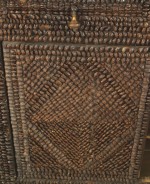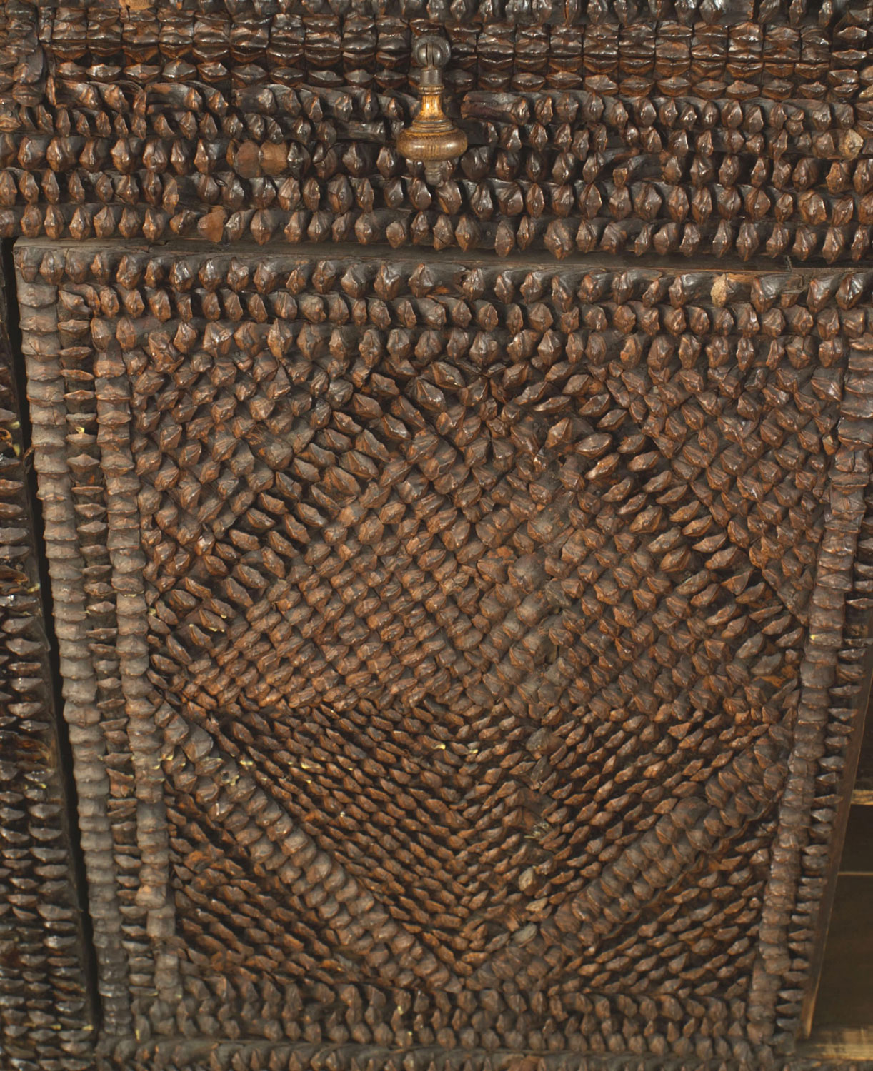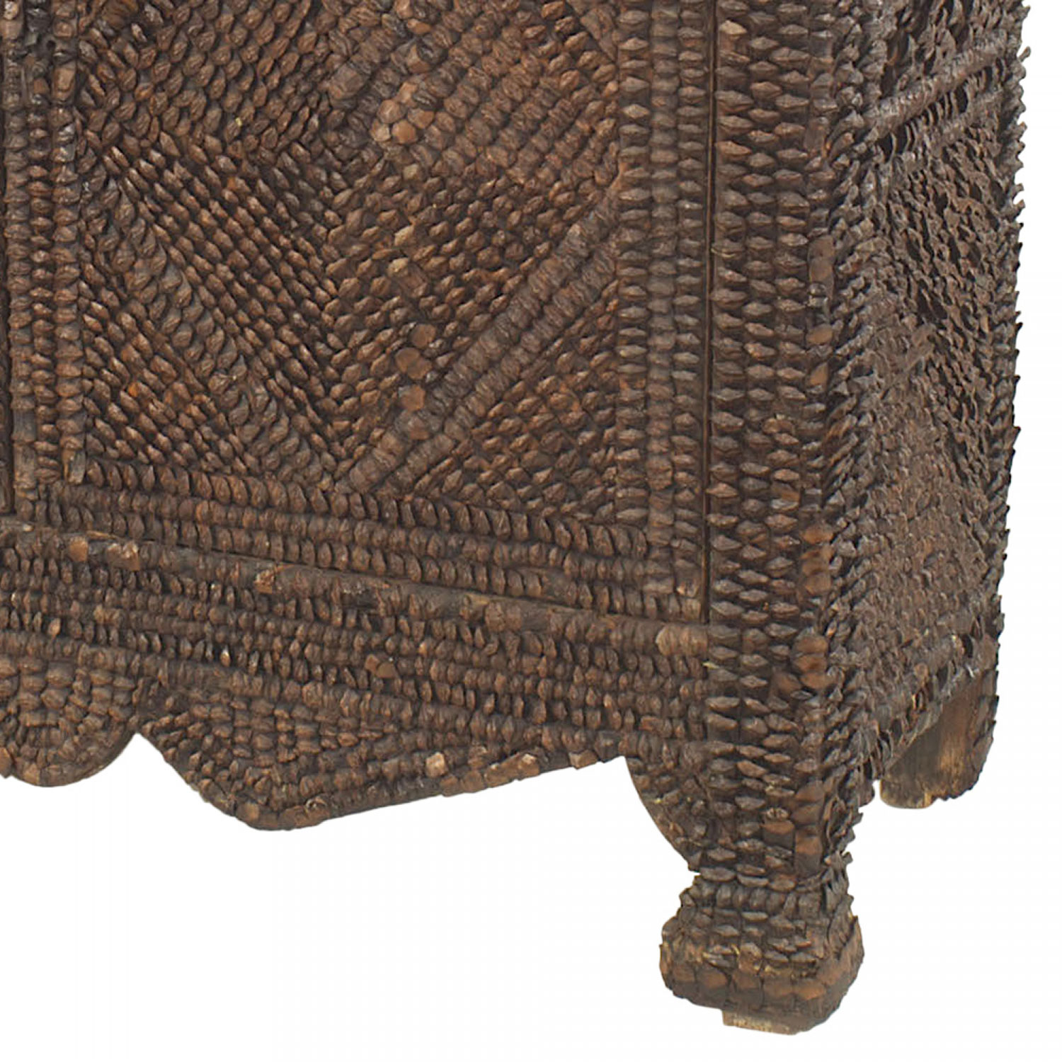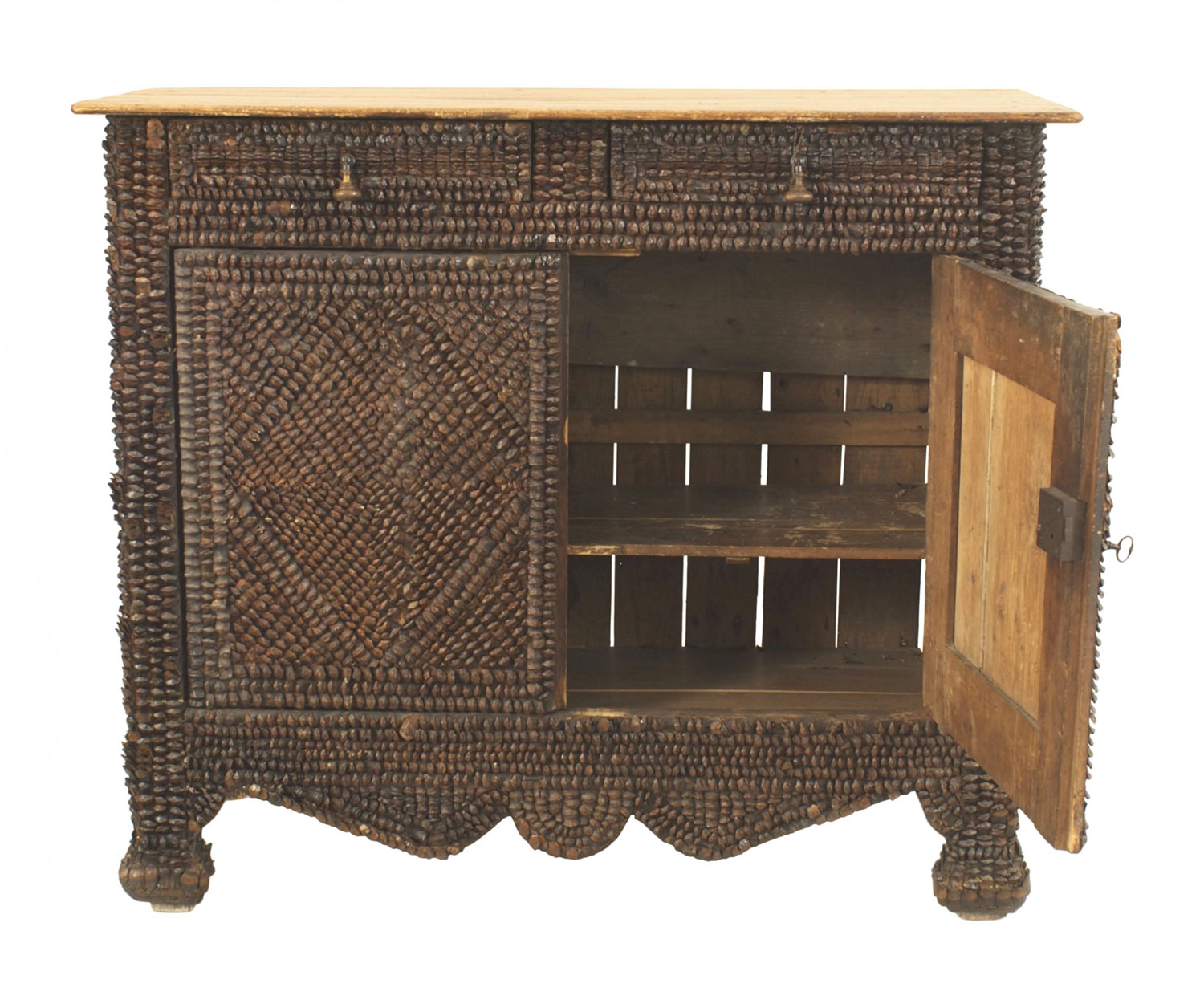 Rustic Continental (probably French late 19th Century) pine cone decorated veneer cabinet with 2 doors having a geometric pattern under 2 drawers with an antique pine top.