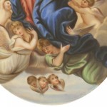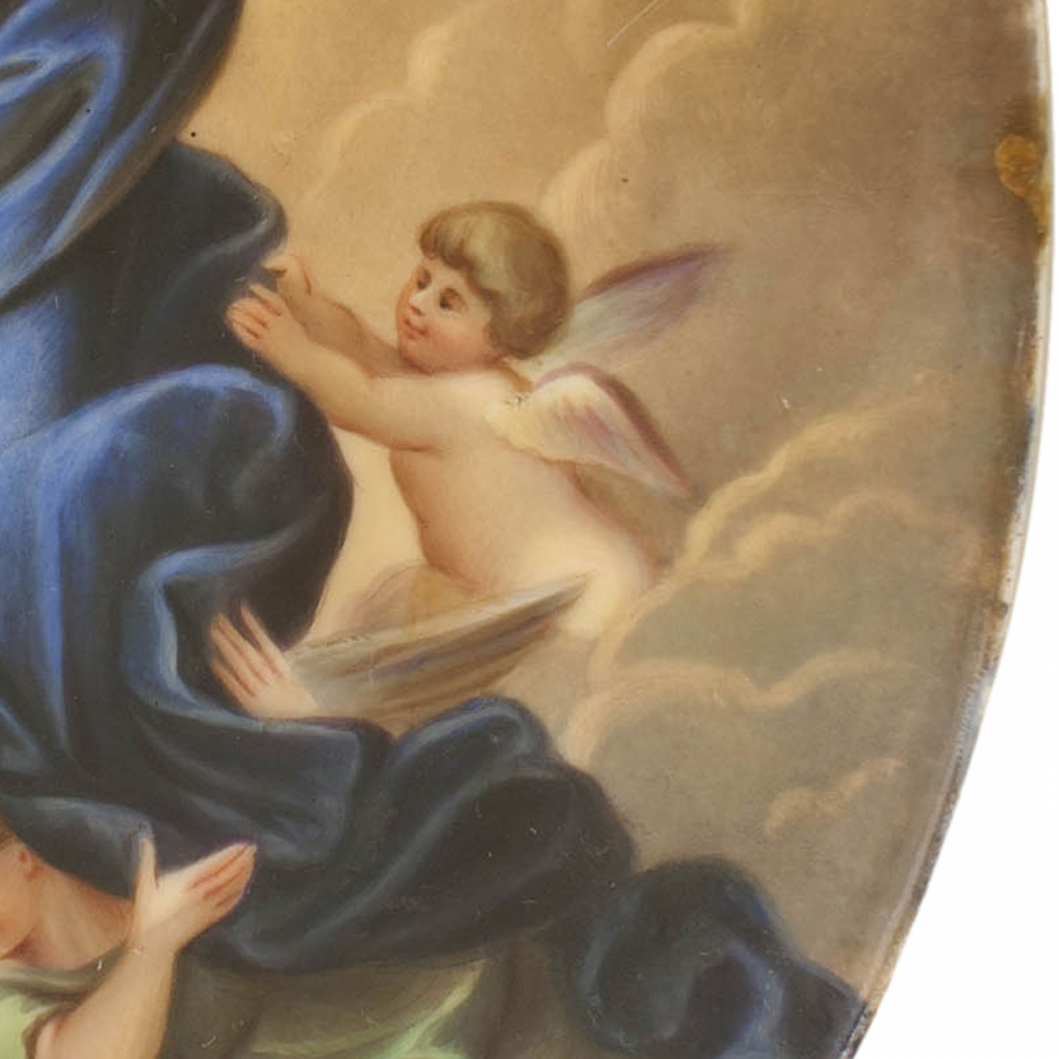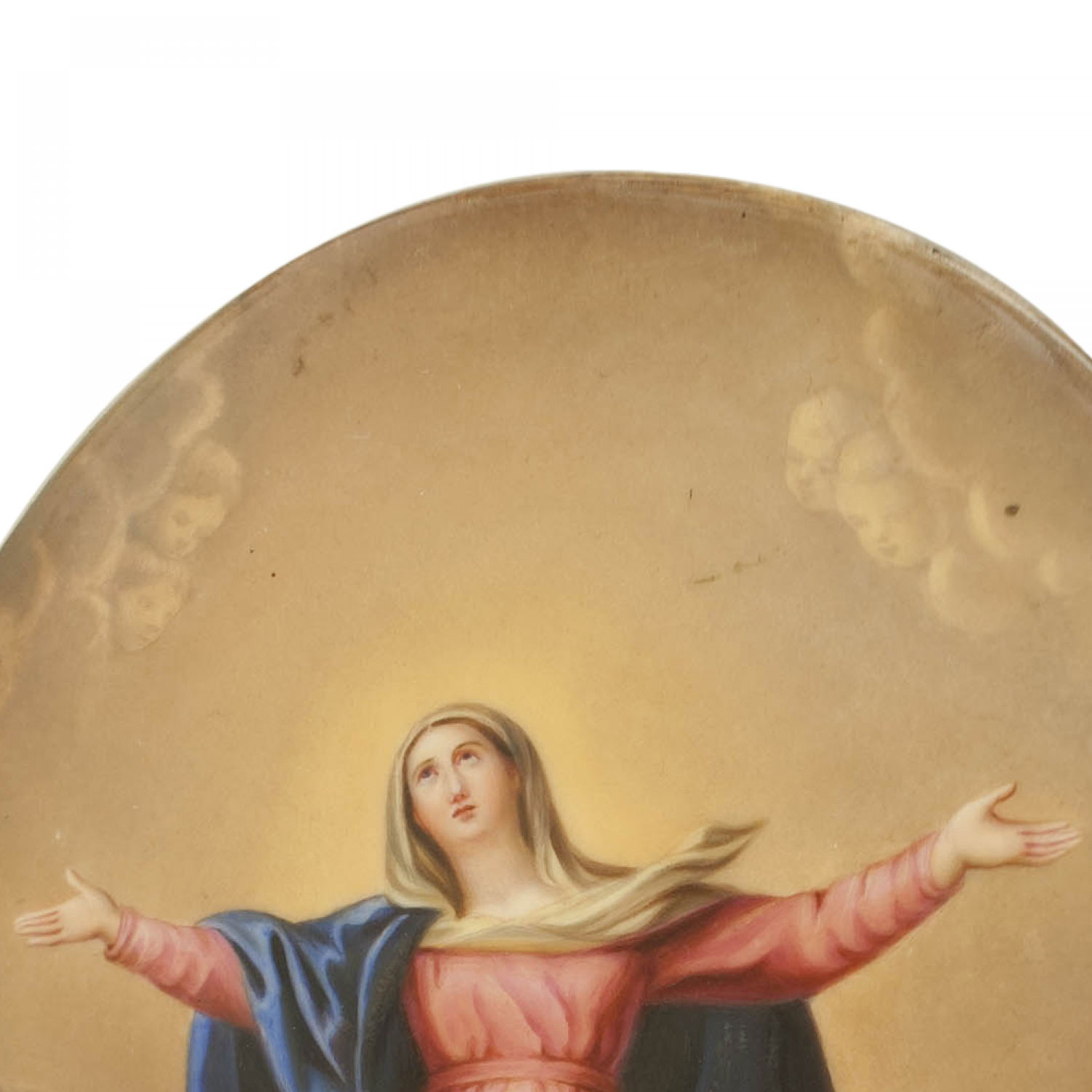 Continental (probably Austrian) porcelain oval plaque with painted image of the Virgin Mary wearing a blue cape