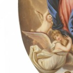 Continental (probably Austrian) porcelain oval plaque with painted image of the Virgin Mary wearing a blue cape.