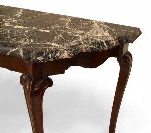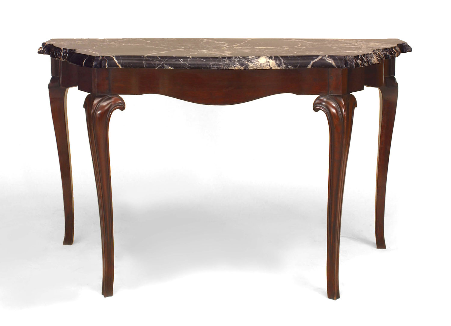 PAIR of Continental (Portuguese 18/19th Century) rosewood console tables with cabriole legs supporting a shaped black marble top with white veins. (PRICED AS PAIR)
