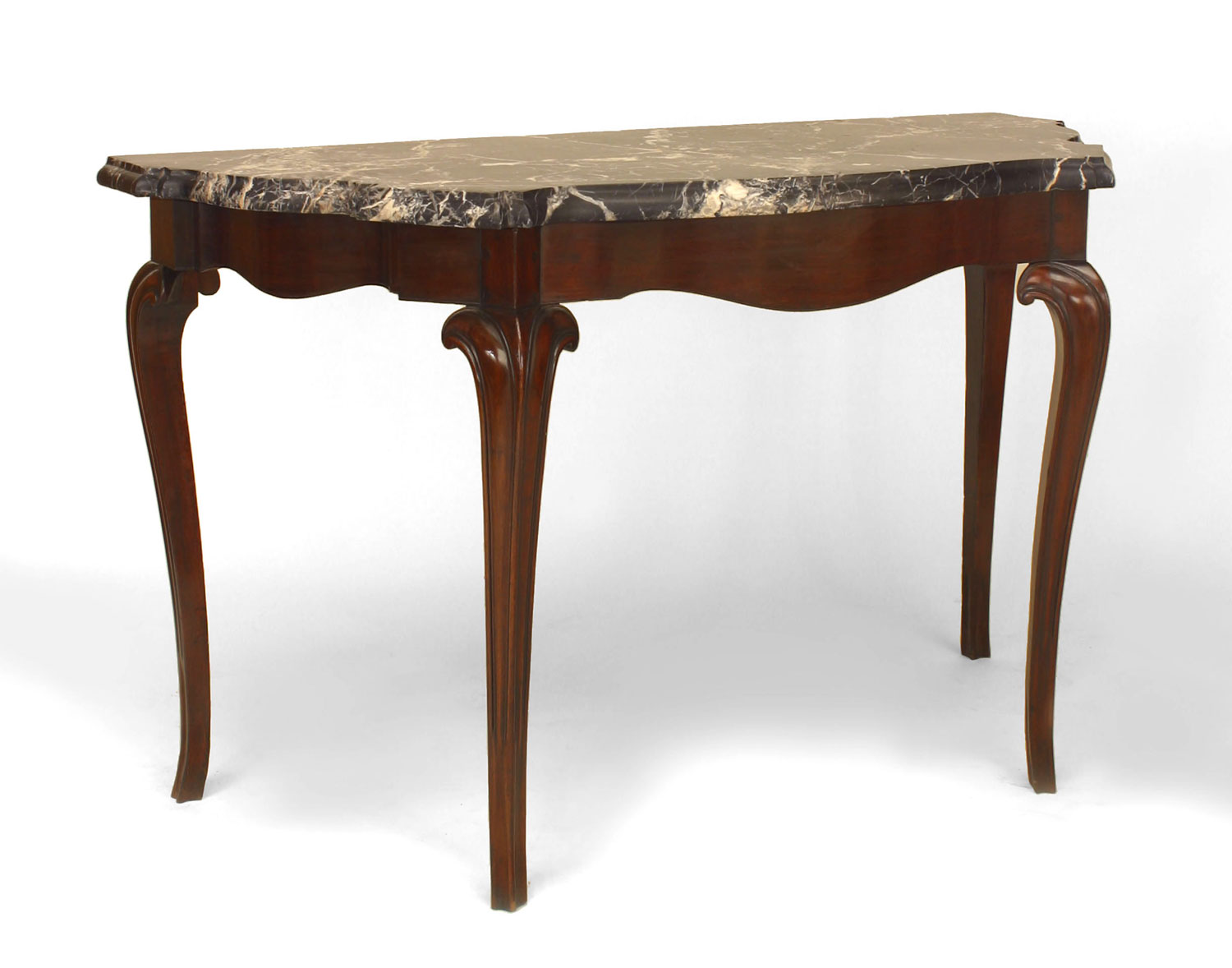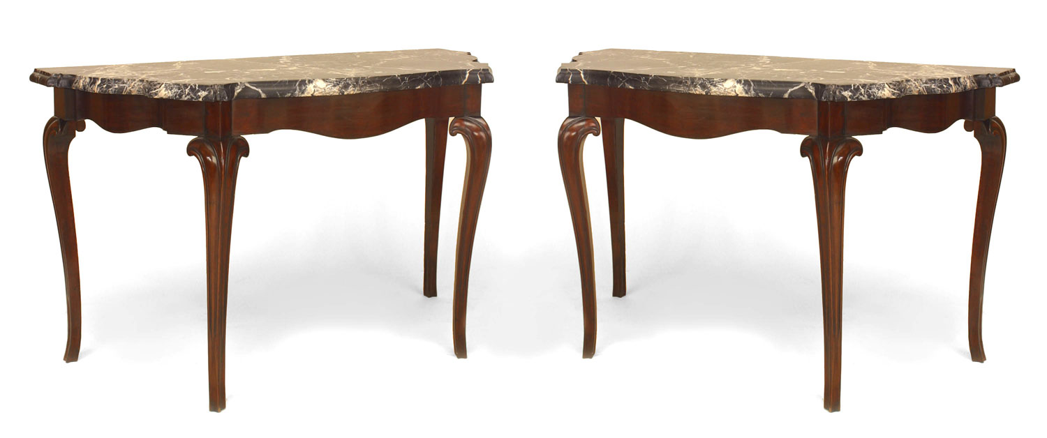 PAIR of Continental (Portuguese 18/19th Century) rosewood console tables with cabriole legs supporting a shaped black marble top with white veins. (PRICED AS PAIR).