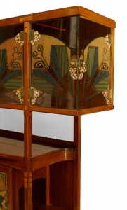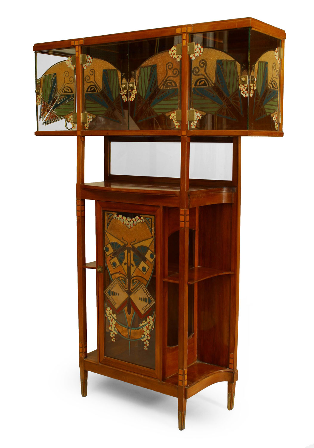 Continental Hungarian Secessionist mahogany and maple cabinet with side shelves and upper section with geometric painted glass door panels.