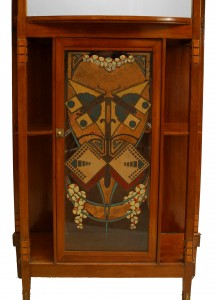 Continental Hungarian Secessionist mahogany and maple cabinet with side shelves and upper section with geometric painted glass door panels..