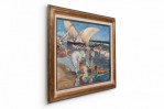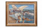 Copy of a painting showing a busy day on the beach with sailboats, bathers and children in the surf